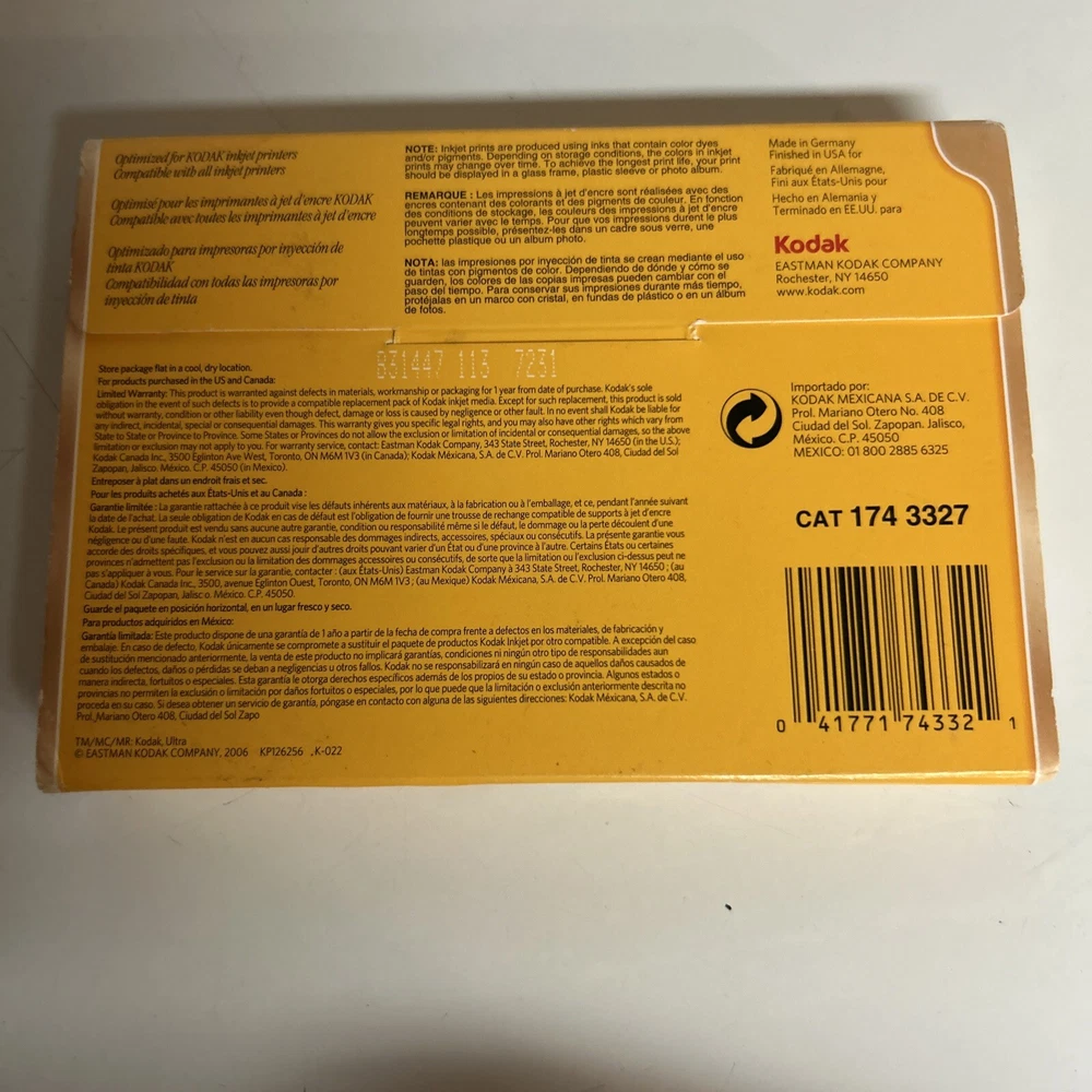 This Kodak Premium Photo Paper 100 Glossy 4x6 Sheets is an excellent choice for printing your favorite memories. It is compatible with a variety of inkjet printers from Canon, Lexmark, Dell, Epson, HP, and Kodak. The paper is designed with a glossy finish that brings out vibrant colors and sharp details in your photos. Each pack contains 100 sheets of 4x6 inch paper that is perfect for printing your favorite photos. The paper is made in Germany and is of high quality. With instant dry technology, you can print your photos quickly and easily. This paper is a great addition to your collection and is perfect for printing your memories. New in open box