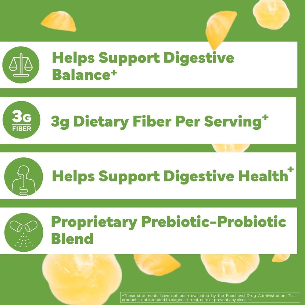 Konsyl Gut Health Prebiotic - Probiotic Fiber Gummies - Helps Support Digestive Health+ - Vegetarian Fiber Supplement Gummies for Adults- 56 Count Product Details Package Dimensions : 5.28 x 2.68 x 2.68 inches; 7.37 ounces Manufacturer : konsyl Brand: Konsyl Flavor: Pineapple Coconut Primary Supplement Type: Prebiotic-Probiotic Fiber Gummies Unit Count: 56.0 Ounce Item Form: Gummy Item Weight: 0.21 Kilograms Special Ingredients: Probiotic Diet Type: Gluten Free Product Benefits: Prebiotic - Probiotic Age Range (Description): Adult Proprietary Prebiotic Probiotic Blend 3G Dietary Fiber per Serving Supports Digestive Health⁺ Triple Strength Vitamin D3 Tropical Pineapple-Coconut Flavor