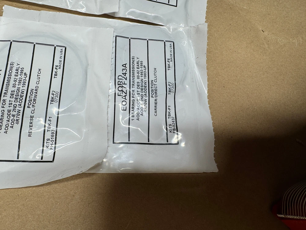 Koyo JTEKT Torrington Transmission Thrust Bearing Kit Ford 4R70W 4R70E 4R75E USA Koyo JTEKT Torrington Transmission Thrust Bearing Kit Ford 4R70W 4R70E 4R75E USA This is a high end kit, made by Koyo-JTEKT MADE IN THE USA. This is for the 4R70W 4R75W 4R70E 4R75E Automatic Transmissions. An extremely high number of Koyo bearings are used in automobiles. The performance demanded of these bearings is increasing due to the dramatic increase in vehicle performance, specifically engines, transmissions, hubs, steering systems and other electronic components. (low torque, long life, weight reduction, etc.). This kit includes: F6AP7F242BA - Output Ring Case 3L3P7F244AA - Forward Clutch/Long Sun Long Short Sun EOAZ7F231A - Reverse CL/Forward Clutch EOAZ7F243A - Carrier/Direct Clutch F3LY7F244A - Long Sun/Short Sun E1TZ7A166A - INT Clutch/Reverse CL Cars 88-24 & Trucks 81-94 3L3P7F240AA - Direct CL/Output Ring Compatible with / Fits Ford, Lincoln, Mercury Also fits a lot more not listed. 1997 - 1997 Thunderbird RWD 1997 - 2003 Mustang RWD 1997 - 1999 F250 RWD, 4WD 1997 - 2003 F150 RWD, 4WD 1997 - 2001 Explorer AWD, RWD, 4WD 1997 - 2003 Expedition RWD, 4WD 1997 - 1999 Econoline Super Duty 4 X 2 1999 - 2002 E450 Econoline Super Duty 4 X 2 1999 - 2003 E350 Super Duty RWD 1997 - 2002 E350 Econoline Club Wagon RWD 1997 - 1998 E350 Econoline RWD 2003 - 2003 E350 Club Wagon RWD 1997 - 2002 E250 Econoline RWD 2003 - 2003 E250 RWD 1997 - 2002 E150 Econoline Club Wagon RWD 1997 - 2002 E150 Econoline RWD 2003 - 2003 E150 Club Wagon RWD 2003 - 2003 E150 RWD 1997 - 2003 Crown Victoria RWD 1997 - 2003 Town Car RWD 1997 - 1998 Mark VIII RWD 1997 - 2001 Mountaineer AWD, RWD, 4WD 2003 - 2003 Marauder RWD 1997 - 2003 Grand Marquis RWD 1997 - 1997 Cougar RWD If there's something you're not sure about or have a question about anything, just send us a message by clicking "Ask a question" below the listing. Free Shipping is only for the inner 48 states (Large Freight Shipments Do Not Apply). ,