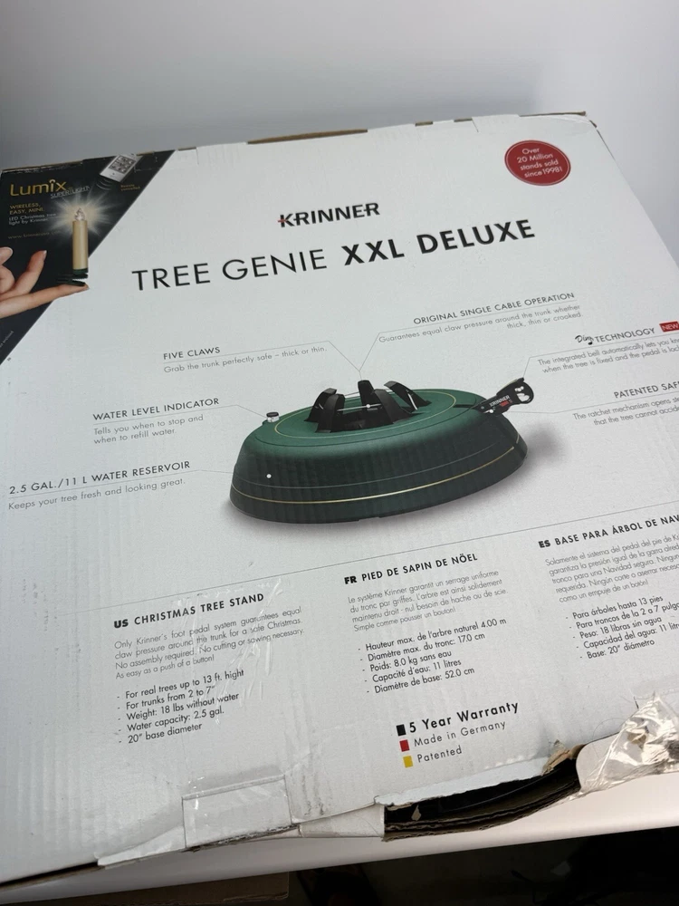 *free shipping ONLY to the lower 48 states. Thanks!* Elevate your Christmas tree game with this Krinner Tree Genie XXL Deluxe Christmas Tree Stand. The green plastic stand features a 5 claw system, ensuring a sturdy and secure fit for your tree. Made in Germany, this live tree stand is perfect for the holiday season and will add a touch of elegance to your home decor. Whether you're looking to hold up a small tree or a large one, this stand is designed to fit all your Christmas tree needs.