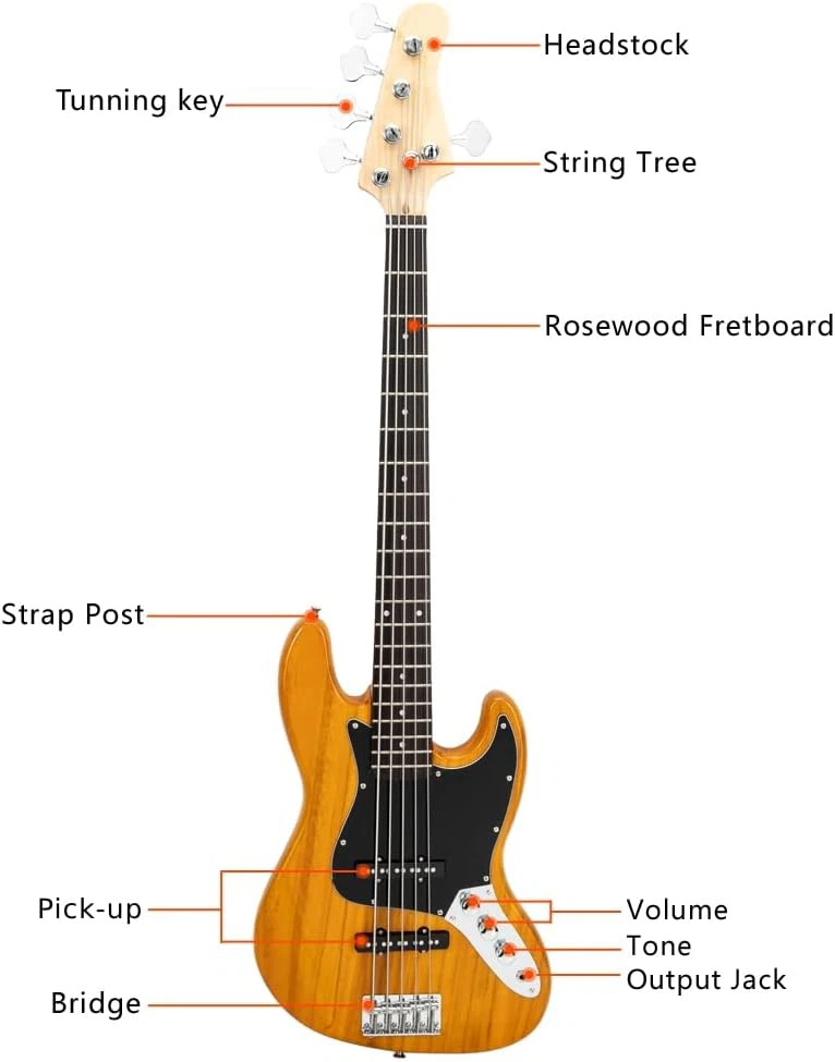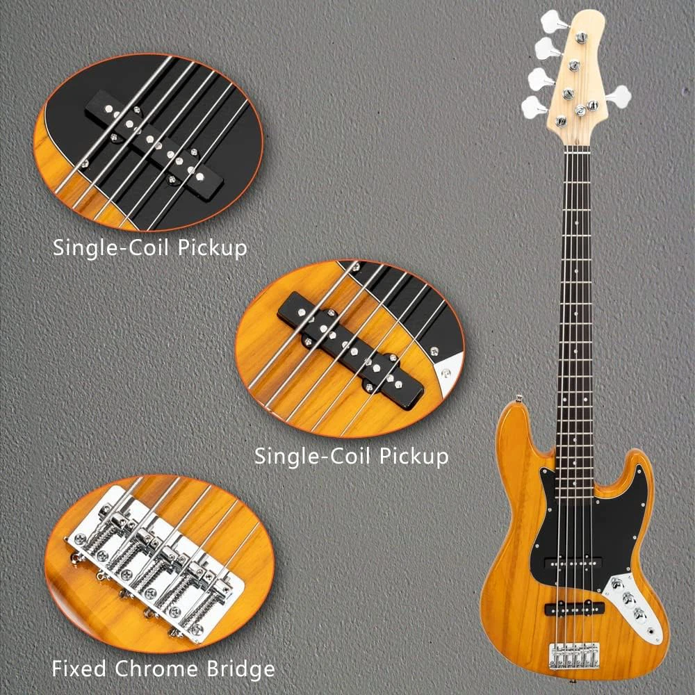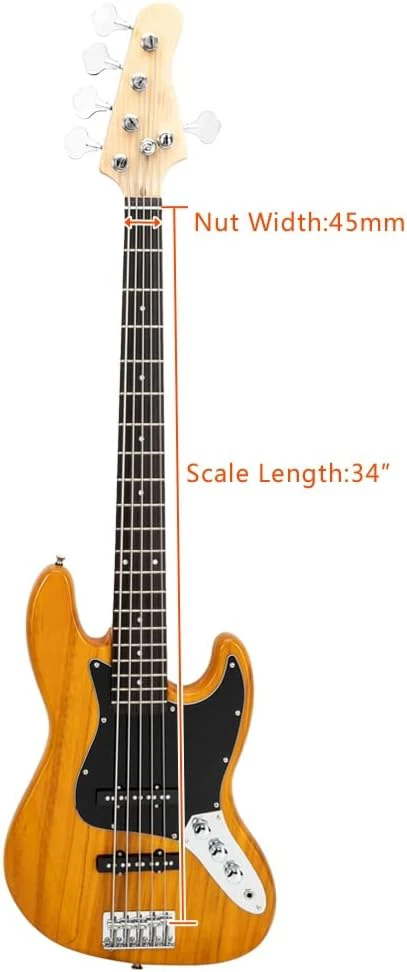 Stylish and Practical Design: The electric guitar's modern C-shaped contour design provides a comfortable feel for a variety of playing music styles. It also offers a classic tone and the single pickup produces a powerful bass sound With Rosewood Fingerboard: This bass features a rosewood fretboard for a brighter, sweeter sound and outstanding high-frequency finish. What's more, it is more suitable for music styles like POP, Jazz, rock, etc First Choice for Gifts: If your friends or family like modern music and this bass is a perfect choice. It's perfect whether it's for family gatherings, school talent shows, or for beginners to learn With Slotted Spindle Knob: The Ktaxon electric bass guitar features vintage-style flat-top knurled headstock knobs that provide smooth, accurate tuning Purchase with Confidence: It contains a bass, guitar bag, strap, a plectrum and wrench tool. We are committed to providing customers with a good shopping experience. If you have any questions or suggestions, please contact us and we will be happy to serve you Ktaxon Electric Bass Guitar, 5 String Full-Size Bass Guitars Beginner Kit 1. Style: Bass Guitar 2. Body Orientation: Right Handed Body: Paulownia 3. Neck and Fingerboard Neck: Maple Fingerboard: Rosewood Strings: 5 Frets: 20 Nut width: 1.772 in. Scale Length: 34" Pickups: Single-Coil Pickup; Single-Coil Pickup Control: Two Volume Controls; One Tone Control Hardware: Fixed(Chrome) Jack: 1/4" 5. Dimensions Guitar: 45.7"H x 13.58"L x 1.65"W Gutiar Weight: 7.38 lb 1 x Bass 1 x Bass Bag 1 x Guitar Strap 1 x Amp Wire 1 x Wrench Tool 1 x Plectrum