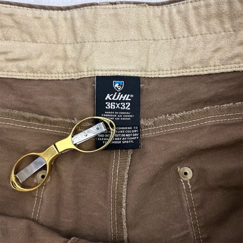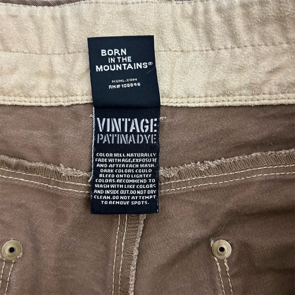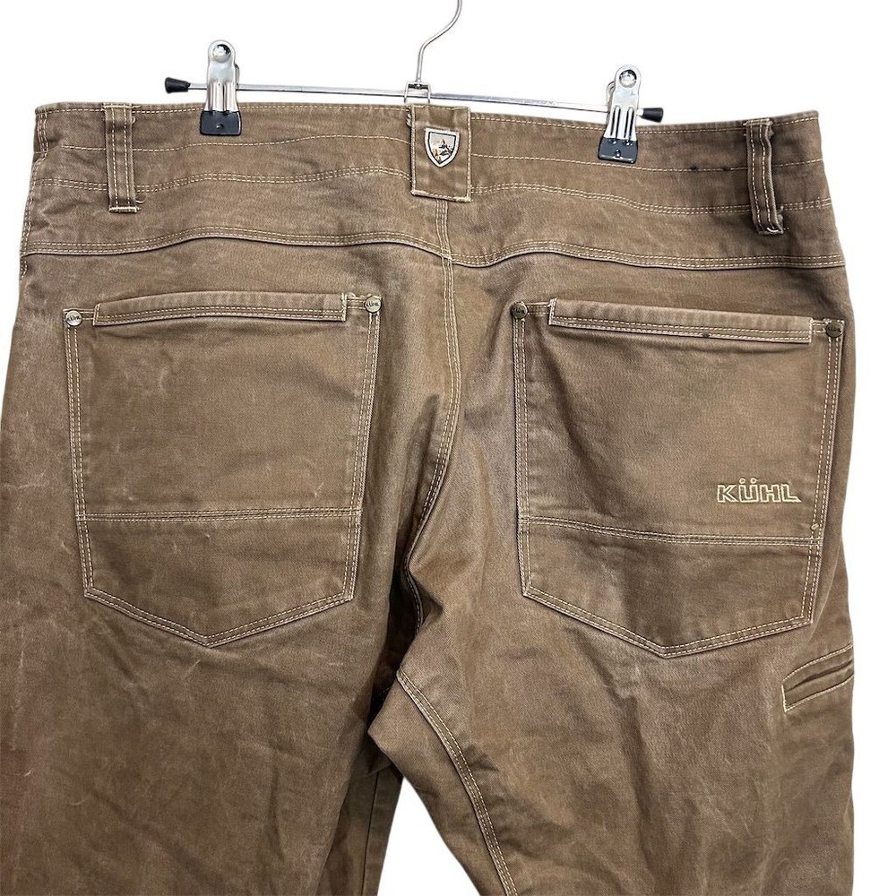 The Kuhl men's cargo pants in size 36 offer a regular fit with a 32-inch inseam. Made from a blend of cotton and spandex, these brown pants feature a flat front and straight leg style. Designed for casual occasions, they include articulated knees, gusseted crotch, scuff guard, and reinforced pockets. The pants have a mid-rise and a solid pattern, with a button closure and a 5-pocket design. Suitable for fall, they are machine washable. Model 5016. Pre-owned condition.