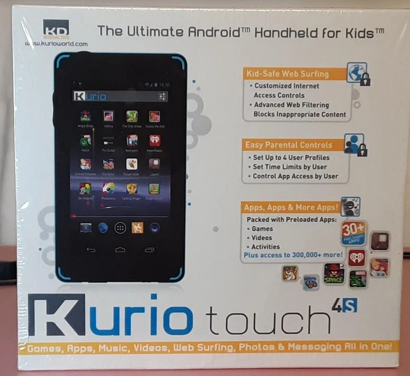 Very Hard to Find BRAND NEW Kurio Touch 4S Sealed in Original Factory Shrink Wrap orig. ToysRus price $99.98 This is the original Kurio S series tablet that is known all over the world as being one of the most well built, durable, and reliable tablets for kids ever made. The Kurio 7S was the most popular kids tablet ever on the market. This 4S which sold tens of thousands around the world is basically the kid brother of the 7S with most of the same operating system and as many of the same games & activities as they could fit. But the main reason kids love the 4S is because it looks just like mom & dad's cell phone and performs many of the same functions such as games, music, take photos & selfies, watch & record videos, kid-safe web browsing, message friends, read E-books, and carry it in your pocket. Sadly over the years Kurio tablets became less reliable. But this S series was built to last for years passing from older to younger sibling and many have done exactly that! Check out this amazing list of impressive features: > 4 inch 800x480 HD Touch Screen > Includes An Original Kurio Accessory Silicone & Plastic Case Stand that retailed for $19.98 > Award Winning Parental Controls including daily time limits and controlling individual app access > Set Up Complete Profiles for 4 Individual Users, it's like 4 kids having their own tablet > Dual Core Cortex A20 Processor > Mali 400 MP2 GPU makes gaming smooth and jitter free with no freezing > 8GB Storage Easily Expanded to 40GB with 32GB micro SD card > Front Selfie Camera and Rear Camera for photos and MP4 HD video recording > Kid-Safe Web Browsing > Micro USB Port Allows Connecting External Peripherals > 1 GB Ram Sufficient to Run All Preloaded Games Smoothly & Efficiently without lagging > 3.5mm Headphone Port Allows Attachment of All Wired Earphones & Headphones > Full Coverage Removable Silicone Bumper Guard Helps Protect Against Drops & Bumps > Built-In Microphone for Voice & Video Recording & Chatting > Many Popular Games Including Angry Birds Space, Fruit Ninja, Disney's Where's My Water & Cut the Rope, Hello Kitty Cafe, Talking Ginger, Pudding Monsters, and many more! > Educational Games include Dictionary, Read & Write Phonics, The Dip Drops, Alpha Grab, Monstr-o-Math, and more. > E-Books include Several Disney E-Book Stories, Aldiko Reader, MeeGenius, Little Red Riding Hood, and more. > Activity Apps include Toon Goggles, Coloring Apps for Boys & Girls, iHeart Radio, Booksy, Fotodanz, and more. > Choose Age Appropriate Apps and Add Them to Your Child's Profile > Take Photos and Decorate with Funny Add-Ons and Doodling on the Photo > What's In the Box: Includes Kurio Touch 4S Tablet, Kid-Size Ear Buds, Power Adapter, USB Cable, and USB Adapter Cable (male micro USB to female USB) for adding external peripherals