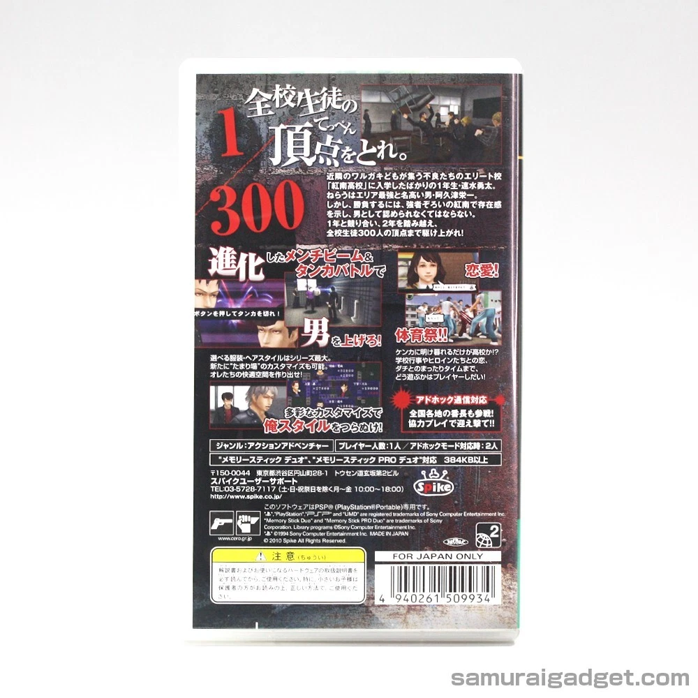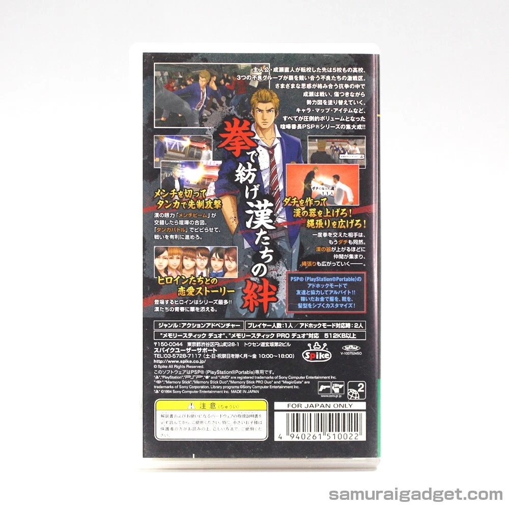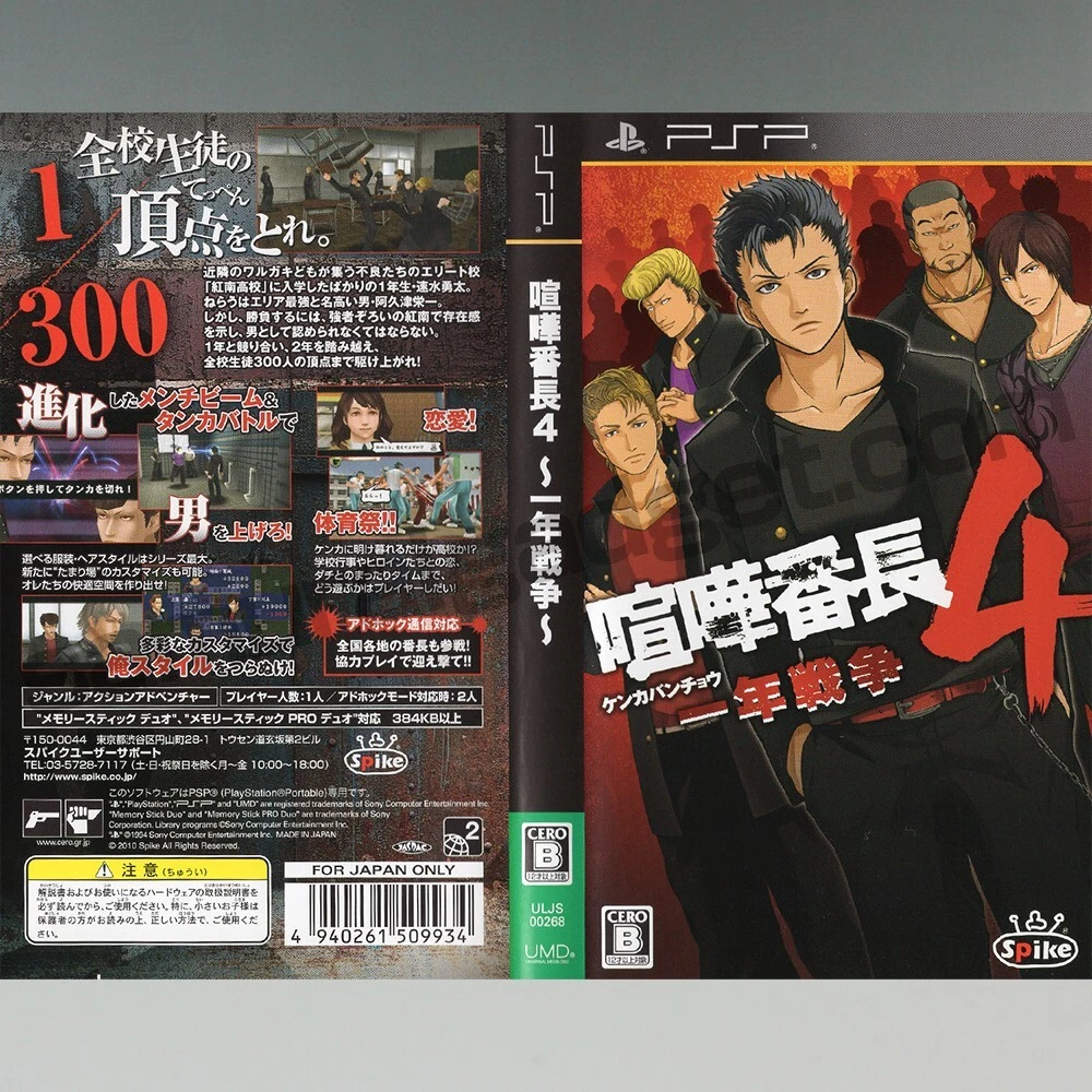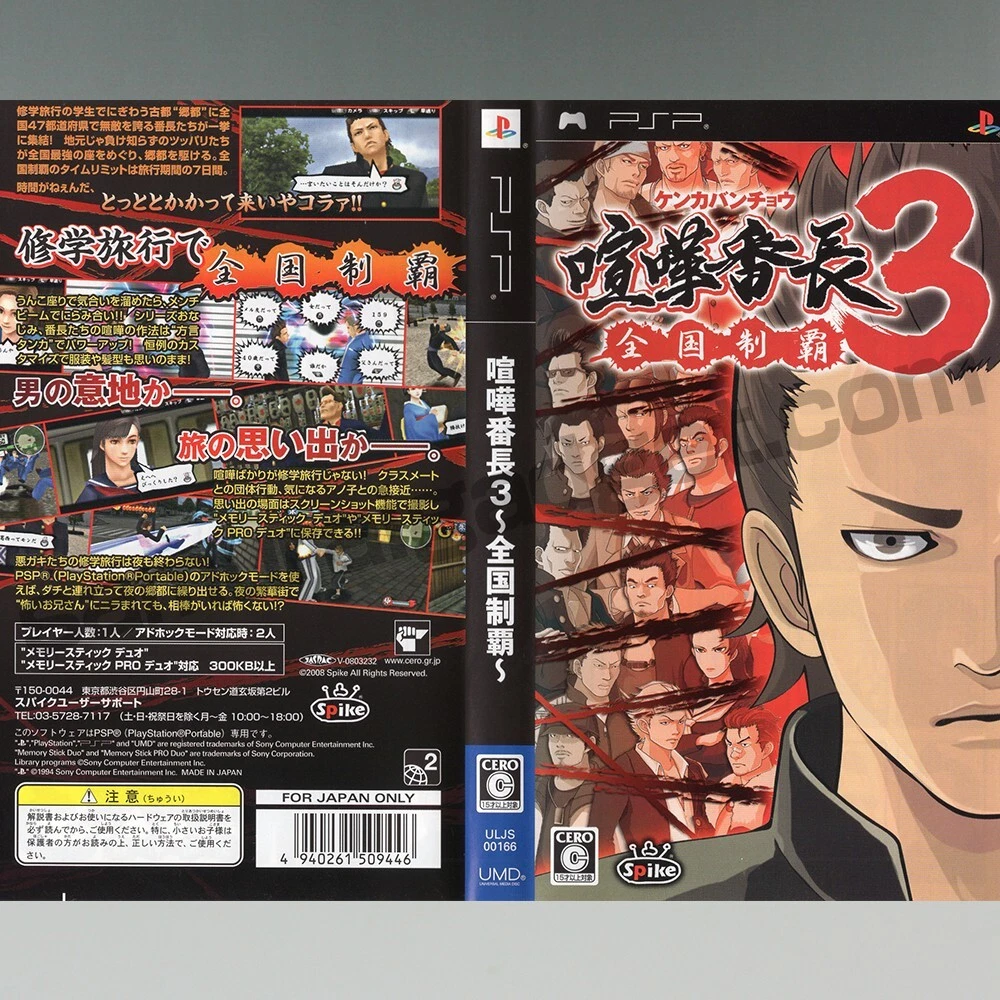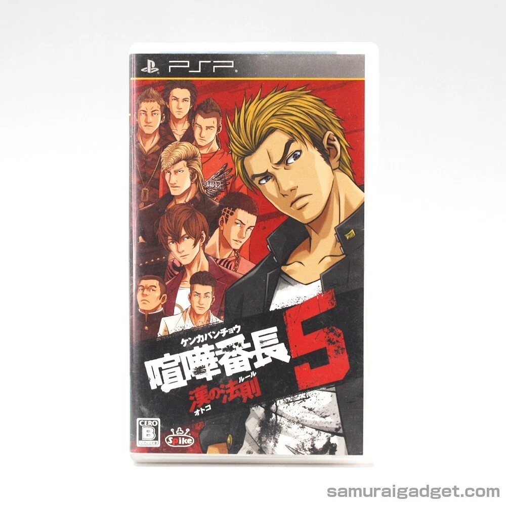 MPN: ULJM-05713, ULJM-05989, ULJS-00166, ULJS-00268, ULJS-00359 Kenka Banchou 5: The Rule of Men UPC: 4940261510022 Publisher: SEGA / Spike Game Name: Kurohyou 1+2 & Kenka Bancho 3+4+5 (5Games) Kenka Bancho 4: Ichinen Senso Release Year: February 25, 2010 Genre: Action & Adventure, Beat 'Em Up Features: Manual Included, Package Included Kenka Banchou 5: The Rule of Men Release Year: January 27, 2011 Kurohyou 2: Ryu Ga Gotoku Ashura-hen UPC: 4974365900762 Kurohyou: Ryu Ga Gotoku Shinsho UPC: 4974365900540 Kurohyou 2: Ryu Ga Gotoku Ashura-hen Release Year: March 22, 2012 Country/Region of Manufacture: Japan Language: Japanese Working Test: Done Kurohyou: Ryu Ga Gotoku Shinsho Release Year: September 22, 2010 Video Game Series: Kurohyou (Yakuza Ryu Ga Gotoku) / Kenka Bancho Kenka Bancho 3: Badass Rumble Release Year: November 27, 2008 Platform: Sony PSP Region Code: Region Free Kenka Bancho 4: Ichinen Senso UPC: 4940261509934 Kenka Bancho 3: Badass Rumble UPC: 4940261509446