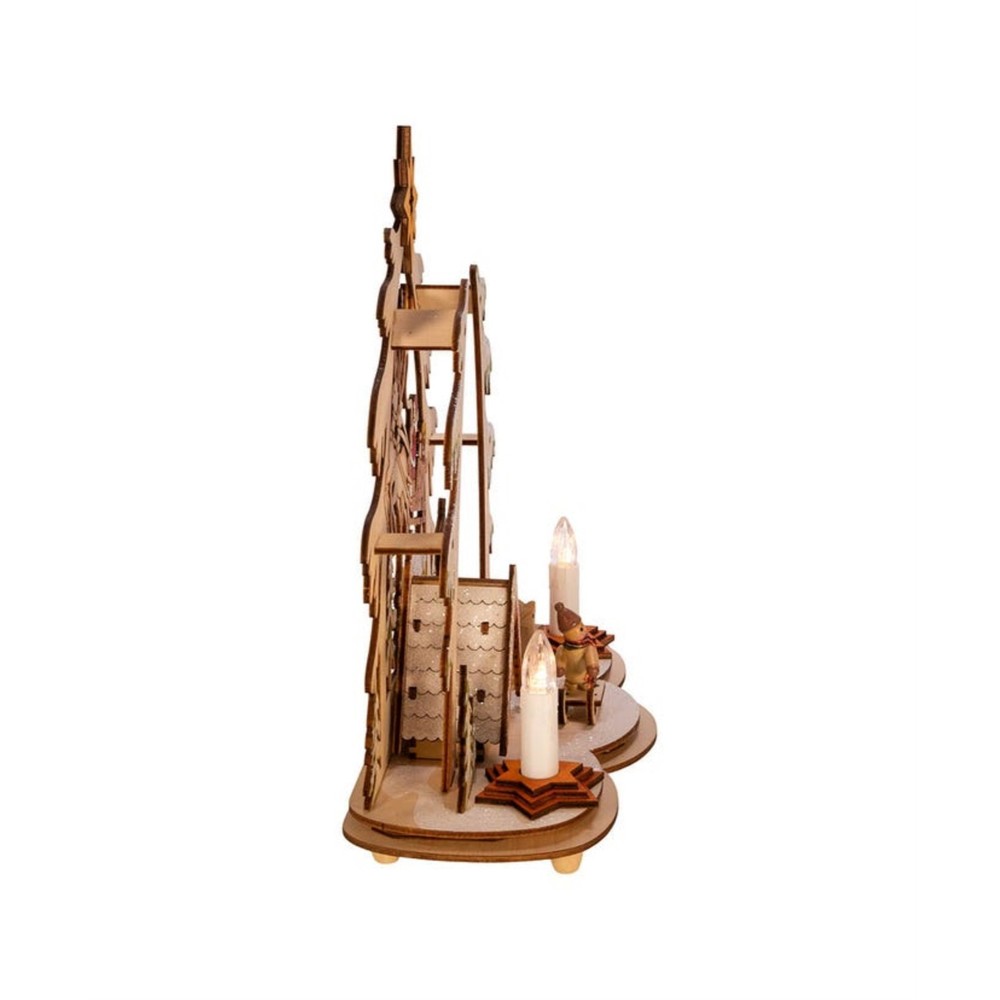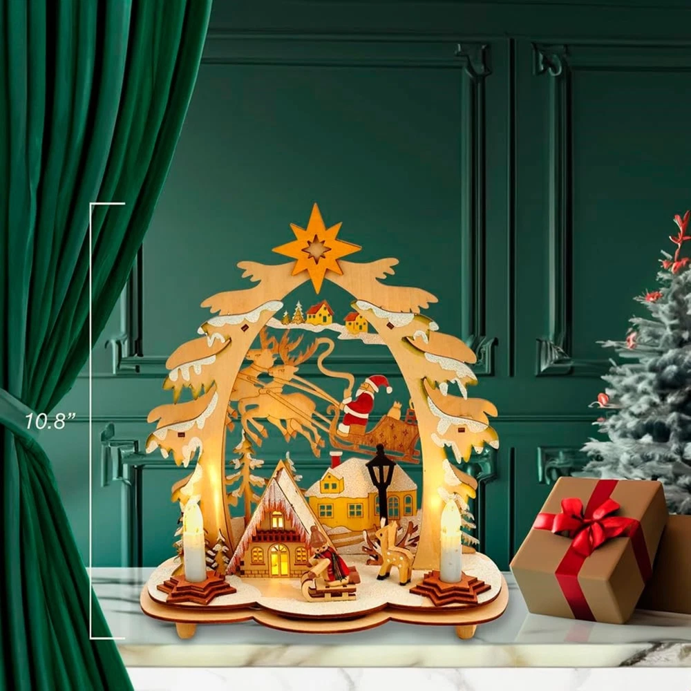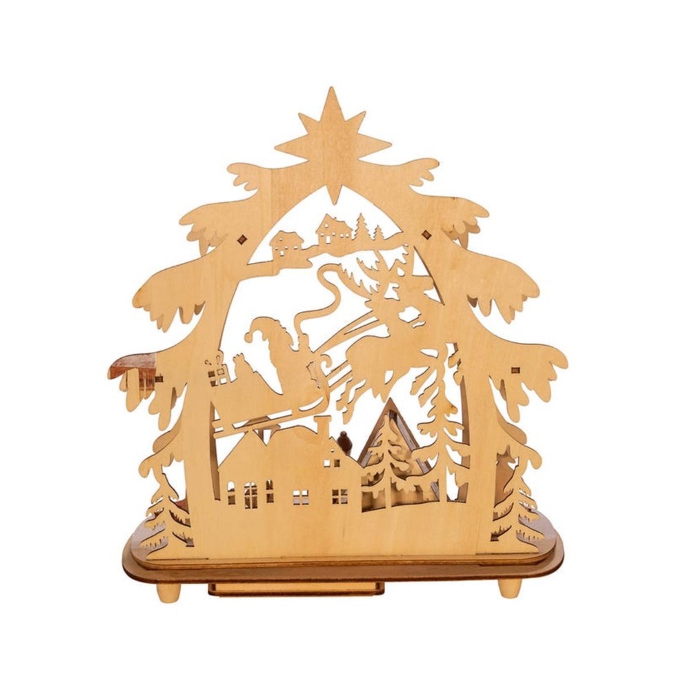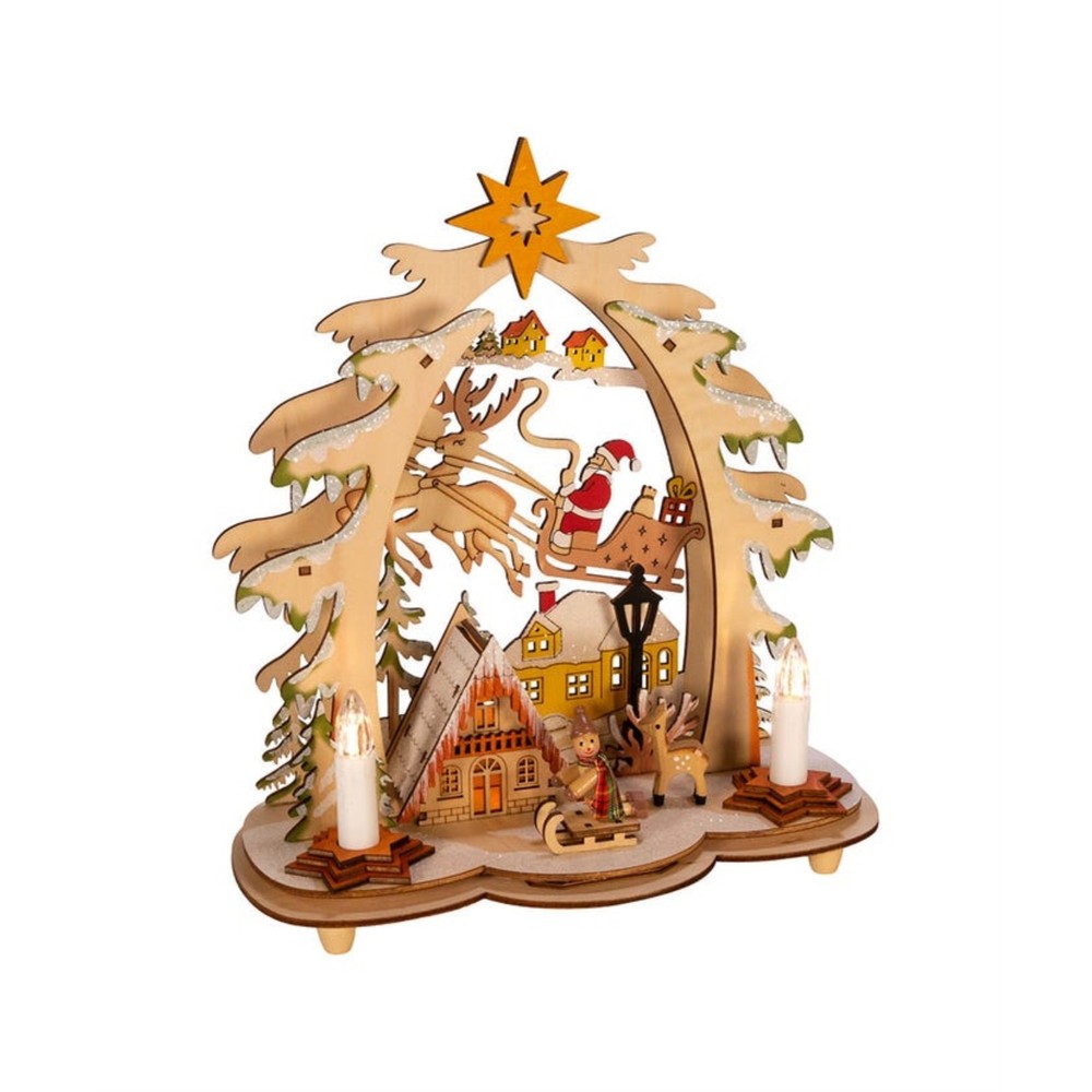 Kurt Adler Battery-Operated LED Lit Wooden Village House with Santa PRODUCT DESCRIPTION Bring traditional Christmas stylings with modern twists with this LED lit Wooden Village House scene from Kurt Adler! Key Product Features Intricate Festive Display: Features a highly-detailed backlit village scene complete with a sledding snowman, a foraging reindeer, and Santa Claus in his sleigh, delivering presents Quality Craftsmanship: Made of wood composite, bulb, iron and copper to create a stylish, warm decoration LED Lit: Illuminated by LED lights to create a warm, festive glow Battery Operated: uses 2 "AA" batteries (not included) Free-Standing Ornament: Stands upright on a small table, ledge, or any other flat surface This Battery-Operated LED Wooden Village House table piece from Kurt Adler is a beautiful and unique addition to any holiday décor. This table piece features multiple snow covered houses with Santa and his reindeer. There is an overarching tree with a Star of Bethlehem. When switched on, this village lights up with LED lighting for a festive glow.