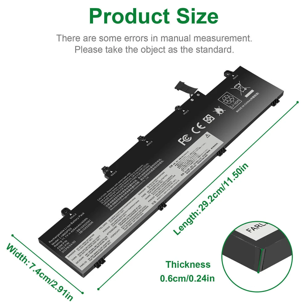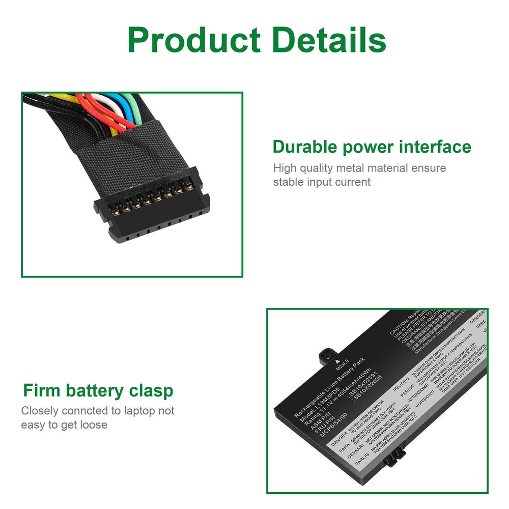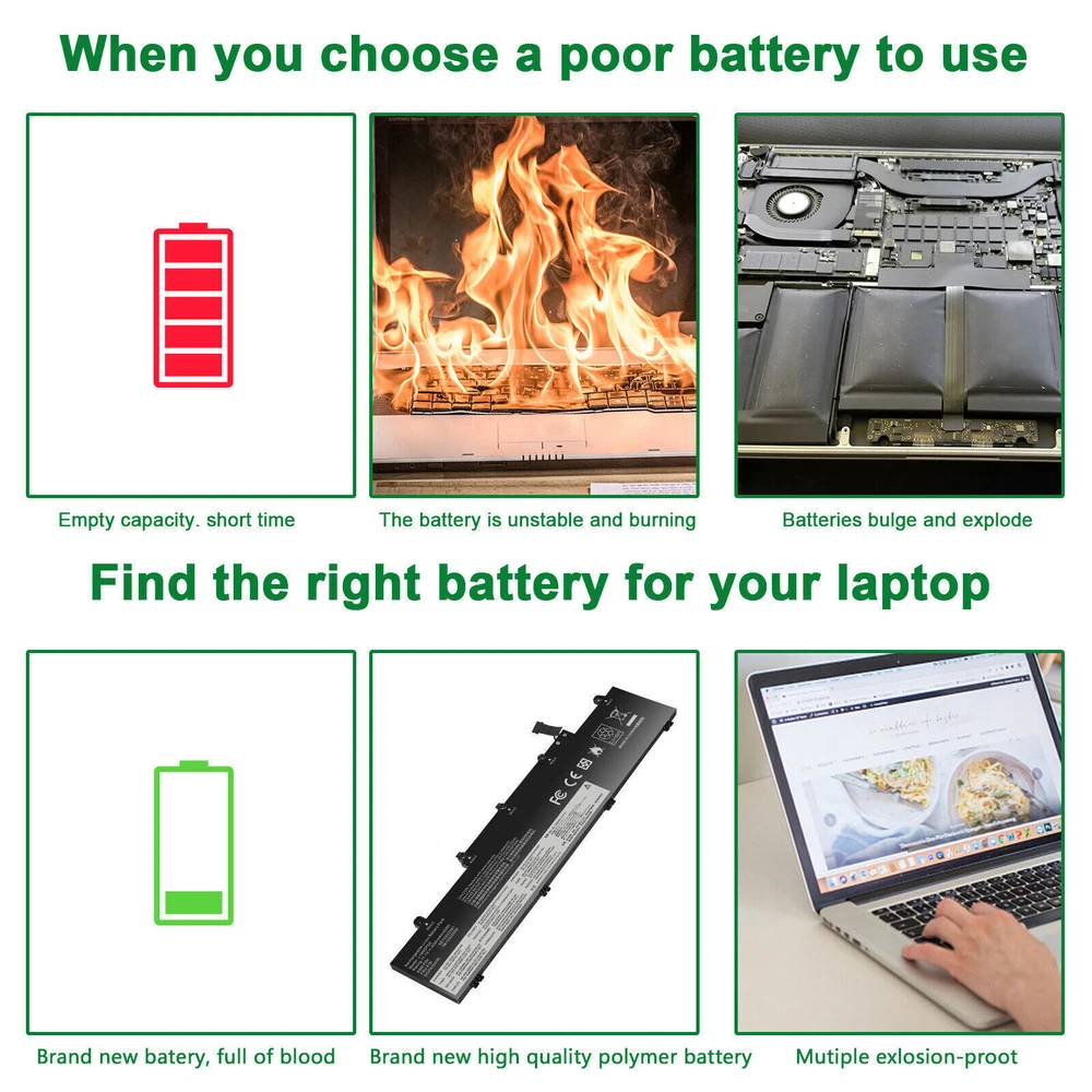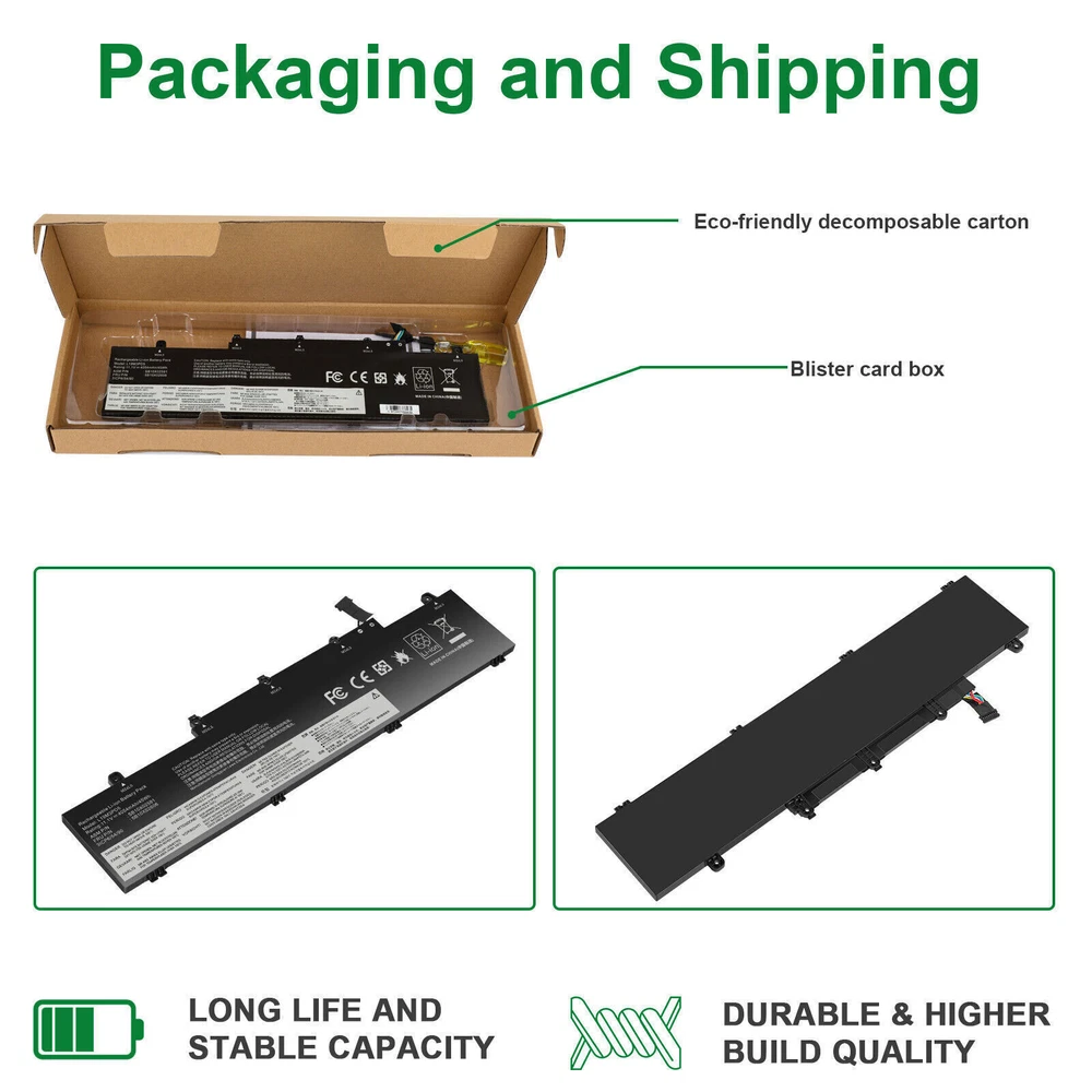 L19C3PD5 L19D3PD5 L19M3PD5 Battery For Lenovo ThinkPad E14 E15 2nd Gen 2020 FAST About us: ➡️We are a laptop battery manufacturer with more than many years , we are positioned for high quality, simplicity and durability. Our products are stable, safe and reliable in performance,and all batteries are made of Grade ''A'' cells . ➡️ If you have any question, pls feel free to contact us first instead of opening any form of case. Contacting our customer service is the best way to better cooperate with each other,thanks a lot. ➡️ Before purchasing, pls confirm that your model/capacity/size is compatible with your laptop . If you don’t know your model, you can provide us a picture of the appearance of the old battery for us to confirm. ➡️ Your positive feedback are the driving force for us to move forward. Specifications: Condition: Brand New , 'A' grade cells,100% Compatible! Battery type: Li-ion Battery Voltage: 11.1V Capacity: 45Wh Number of Battery Cells: 3 Life Cycles (times): 300-500 Certification: CE FCC RoHS Color: black as pictures Operation time: approx 1.5-3.5 hours Package including: 1×battery (in packing box) Compatible Part Numbers: L19M3PD5 L19C3PD5 5B10X02600 SB10X02597 L19D3PD5 5B10X02594 SB10X02605 5B10X02606 SB10X02591 L19L3PD5 5B10X02603 SB10X02608 L20C3PD4 5B11C73245 SB11C73240 L20D3PD4 5B11C73242 SB11C73241 L20M3PD4 5B11C73244 SB11C73243 L20L3PD4 5B11E24665 SB11E24664 3ICP6/54/90 NOTE: Not fit for Lenovo ThinkPad E14 1st Gen 2019 Series; Not fit for Lenovo ThinkPad E15 1st Gen 2019 Series. Compatible Model: Replacement for Lenovo ThinkPad E14 Gen 2 2020(Type 20T6, 20T7, 20TA, 20TB) series: ThinkPad E14 2nd Gen(20T6), ThinkPad E14 2nd Gen(20T6000MGE), ThinkPad E14 2nd Gen(20T6000RGE), ThinkPad E14 Gen 2 20T6CTO1WW, ThinkPad E14 Gen 2 20T6S0GB00, ThinkPad E14 Gen 2 20T60008AU, ThinkPad E14 2nd Gen(20T7), ThinkPad E14 2nd Gen(20TA), ThinkPad E14 2nd Gen(20TA000CGE), ThinkPad E14 2nd Gen(20TA000DGE), ThinkPad E14 2nd Gen(20TA000EGE), ThinkPad E14 Gen 2 20TA002SAU, ThinkPad E14 Gen 2 20TA002WAU, ThinkPad E14 Gen 2 20TACTO1WW, ThinkPad E14 Gen 2 20TAS02R00, ThinkPad E14 Gen 2 20TAS04L00, ThinkPad E14 Gen2-20TA000DGE, ThinkPad E14 2nd Gen(20TB). Replacement for Lenovo ThinkPad E15 Gen 2 2020(Type 20T8, 20T9, 20TD, 20TE) series: ThinkPad E15 G2(20T8), ThinkPad E15 G2(20T8000MGE), ThinkPad E15 G2(20T8000TGE), ThinkPad E15 G2(20T8000VGE), ThinkPad E15 Gen 2 20T8CTO1WW, ThinkPad E15 Gen 2 20T8S0AA00, ThinkPad E15 Gen 2 20T80008AU, ThinkPad E15 G2(20T9), ThinkPad E15 Gen2-20T9S00K00, ThinkPad E15 G2(20TD), ThinkPad E15 Gen 2 20TDCTO1WW, ThinkPad E15 Gen 2 20TDS02H00, ThinkPad E15 Gen2-20TD002MGE, ThinkPad E15 G2(20TE). Replacement for Lenovo ThinkPad E14 Gen 3 2021(Type 20Y7, 20YD, 20YE, 20YF) series: ThinkPad E14 Gen 3(20Y7), E14 Gen 3(20YD), E14 Gen 3(20YE), E14 Gen 3(20YF). Replacement for Lenovo ThinkPad E15 Gen 3 2021(Type 20YG, 20YH, 20YJ, 20YK) series; Replacement for Lenovo ThinkPad E14 Gen 4 2022(Type 21EB, 21EC, 21E3, 21E4) series; Replacement for Lenovo ThinkPad E15 Gen 4 2022(Type 21E6, 21E7, 21ED, 21EE) series; How to install a new battery? 1. You need to turn off the laptop and disconnect the power at the same time. 2. Disconnect the old battery from the motherboard to avoid unnecessary damage caused by disassembling the battery. Then unscrew the old battery and save it. 3. Take out the old battery, install the new battery on the battery box, tighten the screws, and connect the wires of the new battery. How to maintain a laptop? 1. New battery: When using a new battery, it is best to discharge to 5% for several cycles. Then charge to 95%. So that it can be fully activated. 2. Excessive use: Do not deplete the battery to 0% often, which will cause damage to the battery or shorten the service life. 3. Charging sequence: when charging, first install the battery, then turn on the power, after fully charged, first cut off the power, and then unplug the power plug. 4. Long-term storage: Please fully charge and store unused batteries. (Charge once a month) Do not store in low battery to avoid reducing. What should be noted when using the battery? 1.If your computer will not be used for a long time, it is recommended that you remove the battery and store the battery separately. 2.It is recommended that you store the battery in a dry environment with a temperature range of -10--35 degrees Celsius, and avoid sunlight. 3.As the damaged lithium-ion battery will pollute the environment, it also has a certain degree of danger. Please do not disassemble or discard at will. Payment Delivery details Warranty & Return About us Contact us Payment 1. We accept payment via Paypay only. 2. All payments must be prepaid. Delivery details 1. Items are generally shipped out within 24-48 hours after your payment has been cleared (Sat. & Sun. excluded.) 2. Orders from the United States will all be shipped out via USPS and FedEx. The shipment usually takes 3-7 business days( Exclude public holiday), if you need the item urgently, please contact us for detail before purchase. 3. We ship to US ONLY and do not support Collection. 4. All items will be shipped to buyer's paypal address. Please check your paypal address before place the order. 5. We are not responsible for wrong or undeliverable address. We reserve the right to charge the shipping fee again for returned items due to wrong address. Warranty & Return 1. We provide 30 days money back on non-defective, undamaged, unused and resalable products. Product is not eligible for refund after the 30-day refund period has expired. 2. Our warranty does not extended to any products that are physically damaged or that are not under normal operating conditions as a result of misuse or improper installation on the buyer/user's part. 3. For all returned products, Please contact us for the returning address and Pls no return case. 4. In all cases, buyers pay shipping fees at their own cost to return products for exchange or refund. We will 