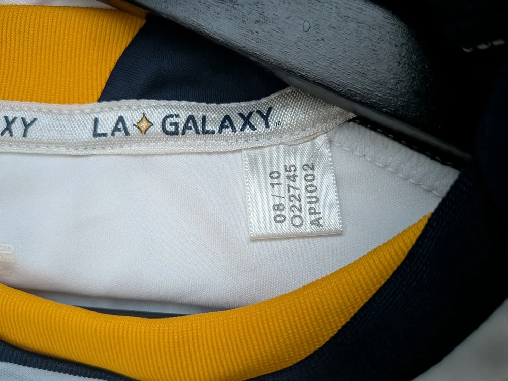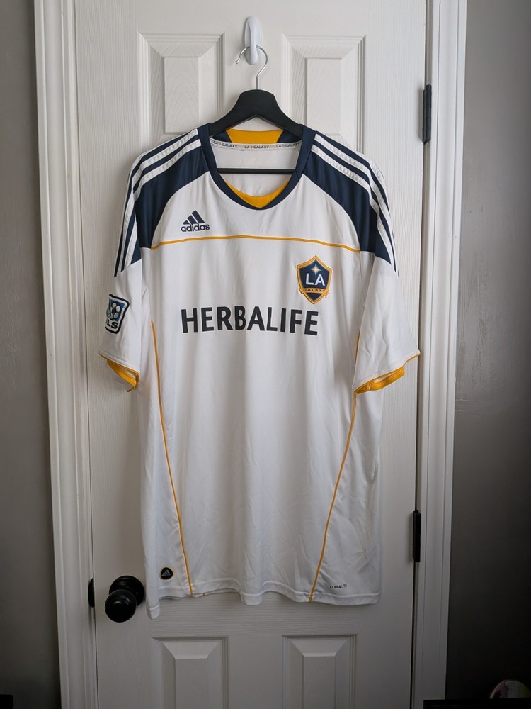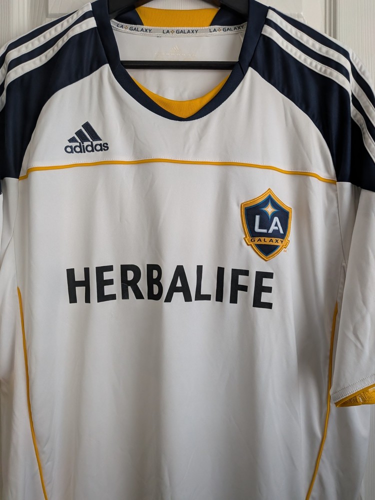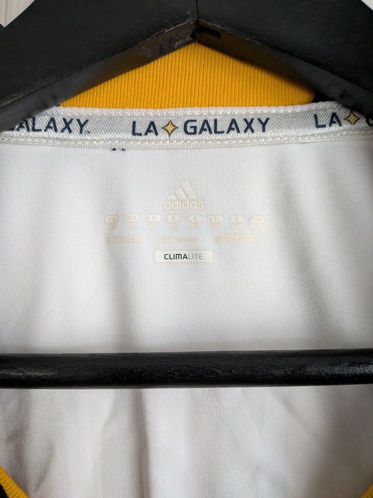 The LA Galaxy Home 10/11 Beckham XL Adidas Jersey is a white soccer jersey officially licensed by Major League Soccer (MLS) and featuring iconic player David Beckham from the LA Galaxy team. Made by Adidas, this jersey is designed for men in size XL and is perfect for fans of MLS and soccer enthusiasts looking to support their favorite team in style. The product is made in Thailand and is ideal for wearing during MLS events or games to show team pride and player admiration.