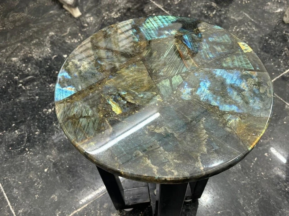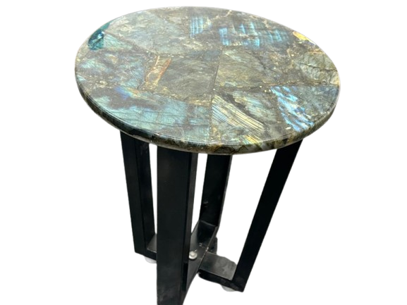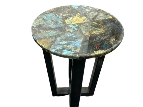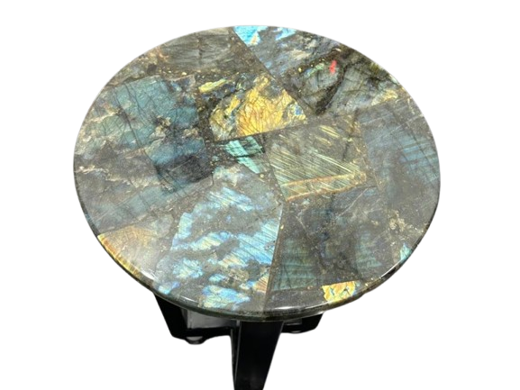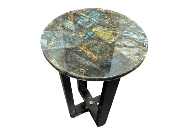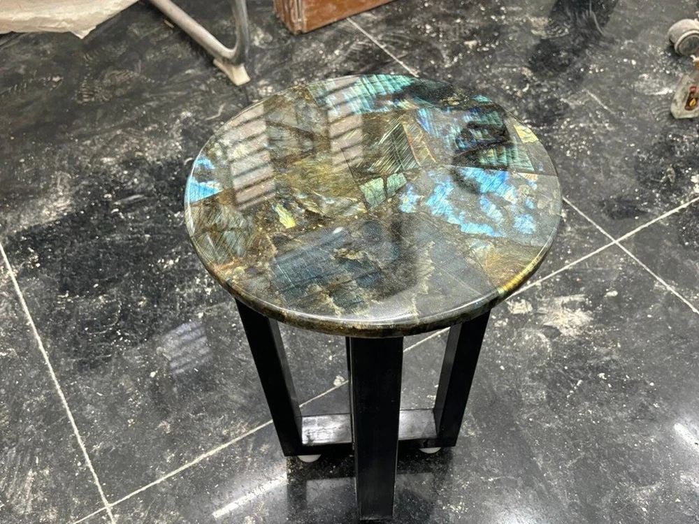 Add a touch of luxury to your home with this stunning corner table made from labradorite stones. The table has a round shape and measures 12 inches in length and width, with a height of 18 inches. It is perfect for use in the entryway, porch, bedroom, living room, or home office/study, and has a geometric pattern with glowing stones that make it a unique and eye-catching piece of furniture. This table is indoor and outdoor use, and has a unit quantity of one. It is FSC certified and comes with a manufacturer warranty of one month. The table is easy to clean with a damp cloth and does not require any tools for assembly. The packaging is export quality, and the table is personalized to meet your needs.