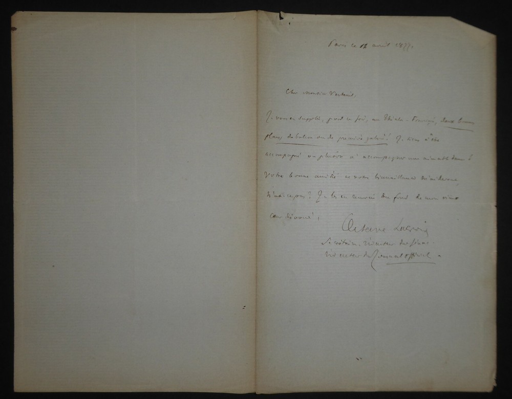Octave LACROIX DE CRESPEL. Lettre autographe signée et datée du 17 avril 1894, Paris. Lettre en une page adressée à une connaissance "Monsieur Verteuil" afin de lui demander un service au nom de leur bonne amitié et de sa bienveillance. Dimensions : 13.5 x 21 cm. 1 page. Etat : Bon état malgré une déchirure au coin supérieur gauche (recto) et un coin corné sur le coin supérieur droit. Légère usure sur le bord droit. Octave Lacroix de Crespel, né à Égletons le 15 mars 1827 et mort le 8 juillet 1901, est un journaliste et poète français. Wikipédia Envoi soigné dans un emballage rigide et étanche. N’hésitez pas à visiter ma boutique et affiner vos recherches en fonction des catégories qui vous intéressent. Ma boutique L'Art Délivré. Lettres autographes, vieux papiers, livres anciens, photographies, gravures, timbres… Nous expertisons et/ou rachetons dans toute la France vos lettres, collections de lettres et livres anciens. Merci de votre visite. Jérôme KAYSER. Octave LACROIX DE CRESPEL. Lettre autographe signée et datée du 17 avril 1894, Paris. Lettre en une page adressée à une connaissance "Monsieur Verteuil" afin de lui demander un service au nom de leur bonne amitié et de sa bienveillance. Etat : Bon état malgré une déchirure au coin supérieur gauche (recto) et un coin corné sur le coin supérieur droit. Légère usure sur le bord droit. Octave Lacroix de Crespel, né à Égletons le 15 mars 1827 et mort le 8 juillet 1901, est un journaliste et poète français. Wikipédia N’hésitez pas à visiter ma boutique et affiner vos recherches en fonction des catégories qui vous intéressent. Ma boutique Lettres autographes, vieux papiers, livres anciens, photographies, gravures, timbres… Nous expertisons et/ou rachetons dans toute la France vos lettres, collect
