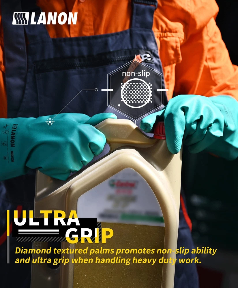 Professional Chemical Gloves - The ergonomically shaped reusable work gloves are made of premium nitrile, have excellent elasticity and durability, offer high resistance to chemicals, acid, alkali, solvent, and mechanical risks, also can maintain the high performance for the oily environment. Comfortable and Durable - With 15Mil (0.38 millimeter) thickness flocked liner, these heavy duty gloves are very soft, easy to pull on and off. The extended cuffs provide effective barrier protection for wrist and forearm from splashes, abrasives and dangerous chemicals. Great Grip - The non-slip particle textured palm chemical resistant gloves offer good grip to grab the wet and greasy parts. They passed the highest level 4 (at least 8000 cycles) of abrasion resistance test, level 1 (1.2 index) of blade resistance test and level 1 (20 newton) of puncture resistance test. Multipurpose - The NBR work gloves are latex free, better solutions for people with sensitive skin. They are ideal for handling chemicals industry, petrochemical, mechanical manufacturing, mining, agriculture, farm, gardening, construction, automotive industry, forestry, car washing, household cleaning and more. Next Level Performance - LANON industrial gloves for hand protection are certificated by CE 0598 CAT III, with Standards EN 388:2016, EN 420, EN ISO374-5:2016, EN ISO374-1:2016/Type A, and meet CA Prop.65 regulations for phthalates.