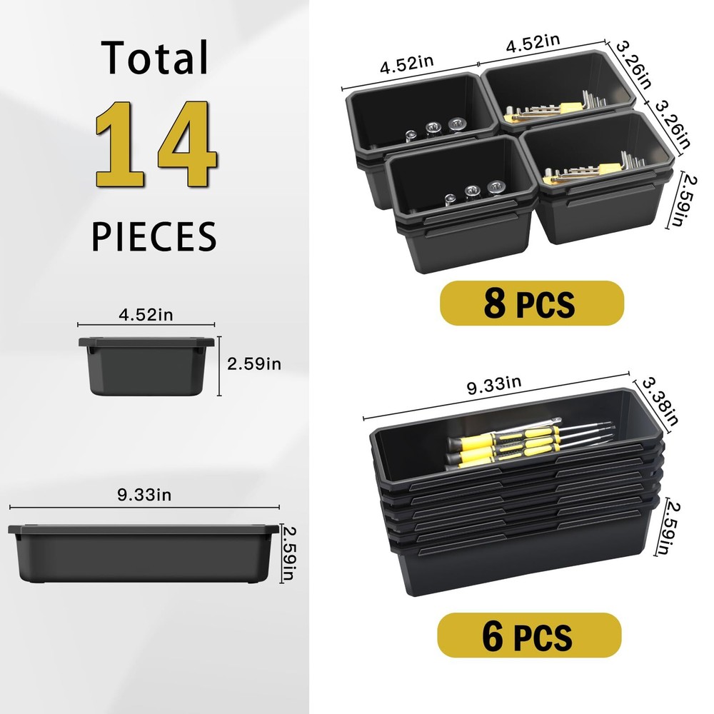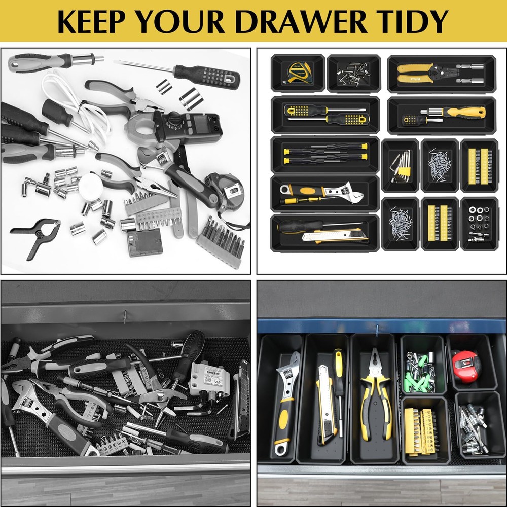 LARBANKE Toolbox Organiser,14-Piece Storage Box Set, Connectable Storage Box,Internal Tray with Non-Slip Granules,Toolbox for Garage Workshops, Repair Shops and Home Use [Durable and Sturdy]Desktop drawer organiser tray set is made of high quality plastic material, the tray is able to withstand 220lbs, durable and not easy to be deformed, the organiser box can meet the majority of life scenarios on the use of the organiser tray. [Interlocking Design] The tool organiser is designed with interlocking design. You can use these products in any arrangement, you can use the storage box alone or mix and match. The organiser makes tools of different sizes and shapes neatly arranged in any environment. The organiser makes the tool trolley, roller tool box and workbench more neat and tidy, and you can easily select the mechanical tools you need to improve your work efficiency. [ORGANISE YOUR TOOLS] The organizer tray comes in two sizes, perfect for storing tools such as slip joint pliers, combination wrenches, screwdrivers, hobby knives, kitchenware, cutlery, beauty supplies, scissors, long-nosed pliers, saws, rulers, blades, nails, screws, bolts, hairpins, washers, clips and any other small parts. [Anti-slip effect] The inner wall has anti-slip bumps design with anti-slip effect, in addition, when you place the storage box in a drawer or toolbox, the storage box can remain in its original position, with certain stability and anti-slip force. [MULTIPLE USE SCENARIOS] These tool box organisers are perfect for organising your tool box, tool trolley, roller tool box, workbench and more. These tool organisers can also be used in the kitchen, bathroom, dresser or office - keep your items organised with this multi-purpose desktop drawer organiser tray. You can place it wherever you need it. [Durable and Sturdy]Desktop drawer organiser tray set is made of high quality plastic material, the tray is able to withstand 220lbs, durable and not easy to be deformed, the organiser box can meet the majority of life scenarios on the use of the organiser tray. [Interlocking Design] The tool organiser is designed with interlocking design. You can use these products in any arrangement, you can use the storage box alone or mix and match. The organiser makes tools of different sizes and shapes neatly arranged in any environment. The organiser makes the tool trolley, roller tool box and workbench more neat and tidy, and you can easily select the mechanical tools you need to improve your work efficiency. [ORGANISE YOUR TOOLS] The organizer tray comes in two sizes, perfect for storing tools such as slip joint pliers, combination wrenches, screwdrivers, hobby knives, kitchenware, cutlery, beauty supplies, scissors, long-nosed pliers, saws, rulers, blades, nails, screws, bolts, hairpins, washers, clips and any other small parts. [Anti-slip effect] The inner wall has anti-slip bumps design with anti-slip effect, in addition, when you place the storage box in a drawer or toolbox, the storage box can remain in its original position, with certain stability and anti-slip force. [MULTIPLE USE SCENARIOS] These tool box organisers are perfect for organising your tool box, tool trolley, roller tool box, workbench and more. These tool organisers can also be used in the kitchen, bathroom, dresser or office - keep your items organised with this multi-purpose desktop drawer organiser tray. You can place it wherever you need it. Shipping from the USA All of our products are shipped from the USA, ensuring quick delivery to your destination. Payment We offer the following payment methods: PayPal, credit card, bank transfer, and eBay's secure payment system. Free Shipping & Free Returns Shipping within the USA is FREE. Additionally, any return is absolutely free for you. Risk-Free Purchase You have the option to return an item within 30 days without any justification. We cover the return shipping costs! Fast Shipping We ship immediately upon receipt of payment. Generally, the package is delivered within 2-3 days in the USA. If it takes longer, we will contact you. Quality and Costs Made in Europe, USA, China No customs fees or additional charges Total satisfaction guarantee Invoice with declared VAT available upon request in .pdf format Feedback Your feedback is very important to us. After you pay for your purchase, you will automatically receive positive feedback from us.