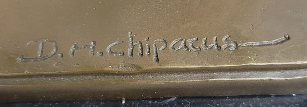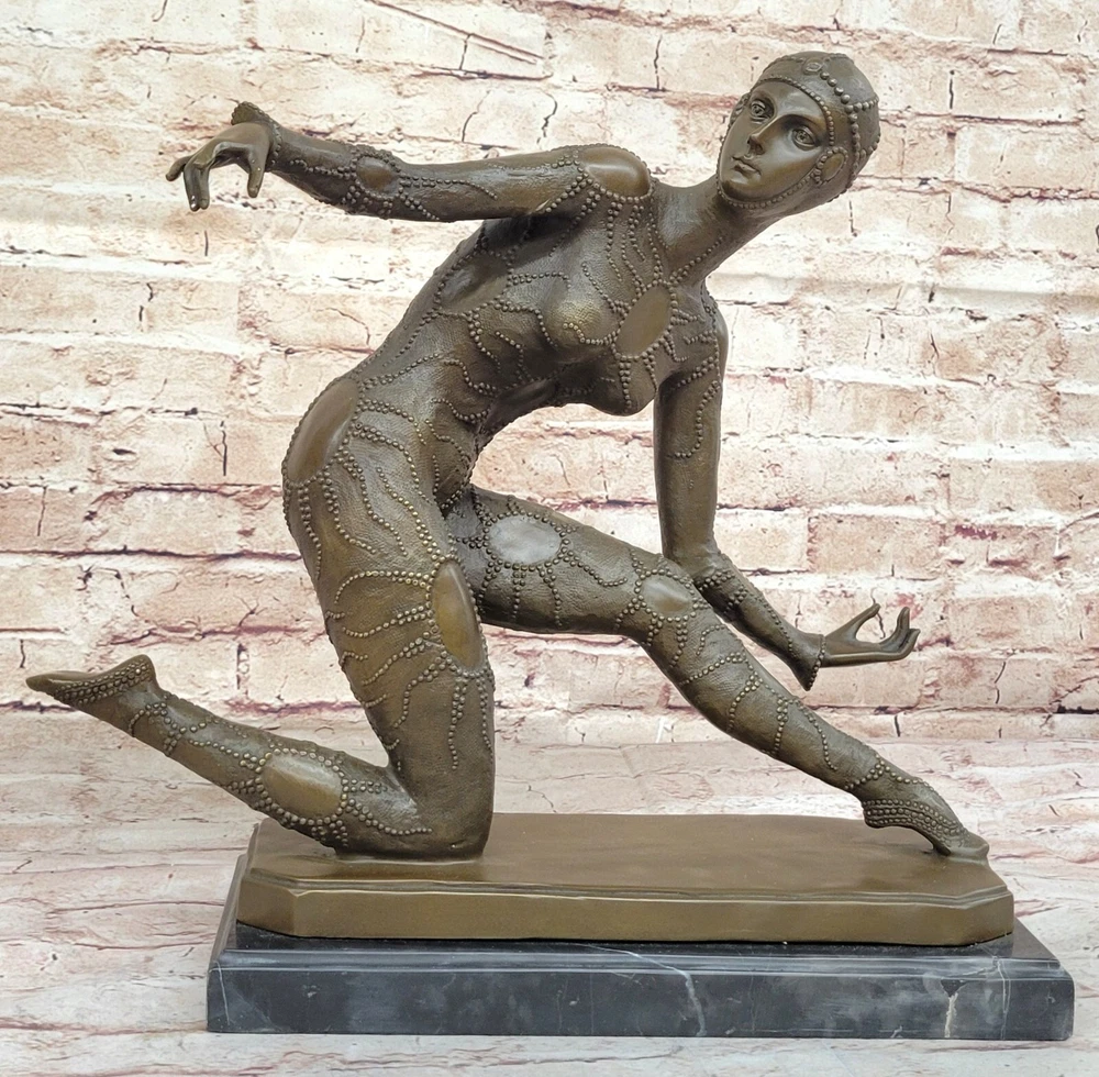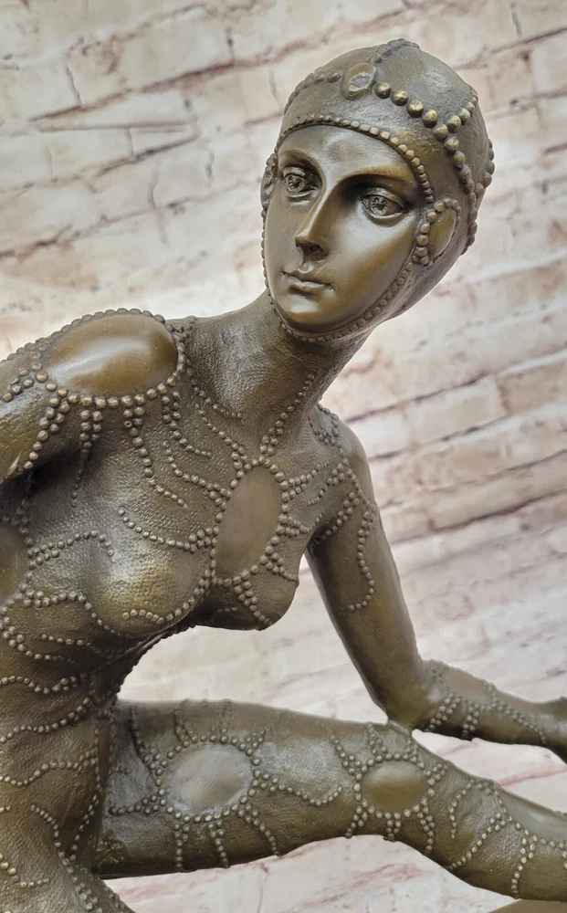 Condition: This sculpture is in Perfect condition Bronze Dimensions with Marble Base: Height 15"" X Width 16"" Marble Dimensions:13"" X 6"" Height without base:14"" Weight:25 LBS Inventory:41115B16814 This exquisite Art Deco Dancer on a marble base is a brilliant showpiece crafted by the renowned artist D.H. Chiparus. The dancer is adorned in elegant decoration, capturing attention and aspiring to be the highlight of any event. The bronze art object portrays a captivating scene with the woman kneeling down and bending forward in a hot and mesmerizing show.The sculpture stands on a rectangular marble base, adding a touch of sophistication to its presentation. As a valuable and finely detailed piece, it serves as an exceptional decoration for any showroom, exhibition, or for collectors who appreciate the beauty of Art Deco craftsmanship. The meticulous design and craftsmanship make this bronze art object a true eye-catcher, demonstrating filigree intricacy and precision comparable to the original.The artist's signature on the footprint position ensures the authenticity of this exquisite creation. Through meticulous production control, the piece maintains top-quality standards, making it a museum-quality bronze that captures the essence of Art Deco elegance and grace. This sculpture is not only a visual delight but also a testament to the skill and artistry of D.H. Chiparus.