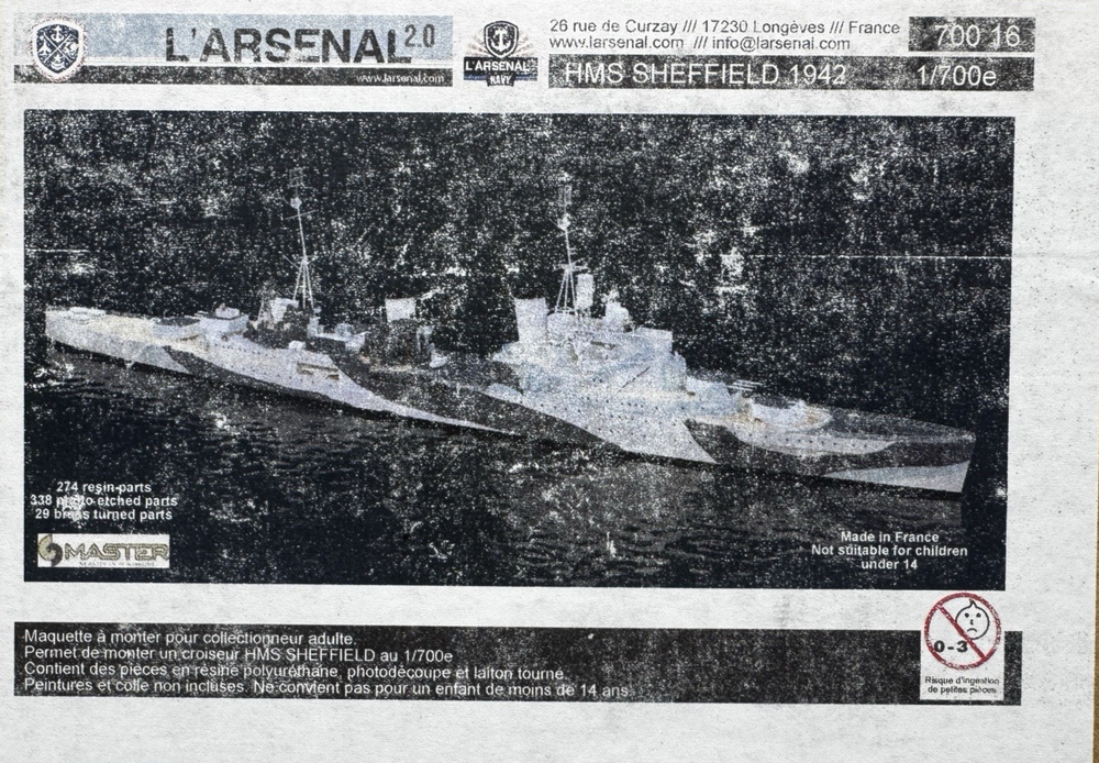 The L'Arsenal 1/700th HMS Sheffield 1942 Delux Kit Resin Model is a highly detailed model kit depicting the HMS Sheffield, a British cruiseliner that served during World War II. Made of high-quality resin, this unassembled kit features a 1:700 scale replica of the ship, complete with accurate details and features. Perfect for hobbyists and collectors interested in militaria, this model kit is a great addition to any collection and allows for a hands-on building experience.