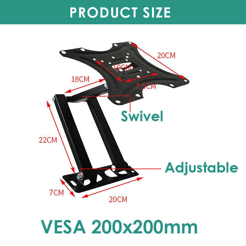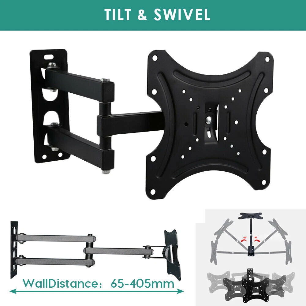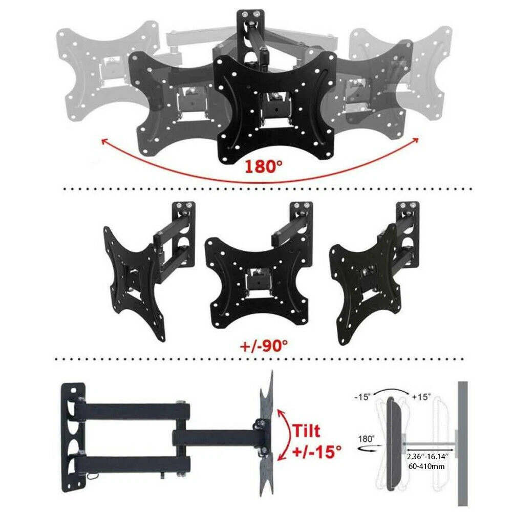 17-42 Inch TV Rack Monitor Universal Rotating Telescopic TV Storages Rack Wall Mount Bracket Description : Do you want to catch up on that thrilling series while lying on the couch after work but just can't find the right angle to watch? Strain no more! This TV wall mount bracket will make sure you never miss a moment of your favorite program. With this bracket, your TV can tilt up or down and rotate 180° horizontally. This TV wall mount bracket is suitable for most of 17"-42" flat screen TVs. No more sore necks or strained eyes with this versatile TV wall mount. Will this mount fit your TV? 1. Check the VESA of your TV whether it is under 200mm x 200mm; 2. Check the weight of your TV whether it is lighter than 55lbs; 3. Check whether your TV is within 17" to 42"; Features: Reliable Quality: This heavy-duty bracket, made from premium cold-rolled steel, means your TV will stay sturdy and stable. It's designed for flatscreens TV's and can carry a load of up to 55lbs. You can be confident that your TV won't run into any "whoopsies" while viewing. Just install the bracket on the wall, mount your TV, and choose a corner to enjoy it. It's that easy! Full Motion for Optimal Viewing: Full motion Mount your TV on this bracket to watch your favorite movie at the most comfortable angle. With a 180° left to right range of motion and upward and downward tilt of +15~-15°, this TV mount puts your screen at the perfect position for you or anyone to enjoy. Flexible and Wide Application: The bracket can extend, tilt, and swivel, anyway you please. Fits flatscreen TV sizes of 17"-42" (for example: 17" 19" 21" 25" 29" 34" 37" 40" 42"). Save Space: This TV wall bracket has an adjustable wall space from 400mm. Planning to have company over for the evening? Simply retract the moveable arms to place into a fixed position to save space for your guests. Easy Installation: Step-by-step instructions and all the necessary hardware is provided, single stud installation simplifies the placement of the TV/monitor on the wall. Removable TV plate designed for single-person installation which helps you to install this TV wall mount without any hassle. Specifications: Type Full Motion TV Wall Mount Bracket Color Black Material 2.0 mm thick Cold-rolled Steel Suitable TV Sizes 17"-42" Load Capacity 25kg/55lbs Adjustable Tilt (-15 degrees, +15 degrees) | Swivel (-90 degrees, +90 degrees) Max VESA Mounting Pattern 200 x 200 mm (8"x8") Use for TV, Monitor, Projector, LCD, LED, OLED, Plasma Available VESA range: 200mm x 200mm (8"x8") 200mm x 100mm (8"x4") 100mm x 100mm (4"x4") 75mm x 75mm (3"x3") Package Included: 1 x Full Motion TV Mount Bracket 1 x Assembly Manual Payment Delivery details Return Contact us Feedback Payment We only accept the paypal payment methods. All major credit cards are accepted through secure payment processor PayPal.(* If you use e-check on PayPal, delivery may take longer, as we will hold your order until your e-check clear) Delivery details Item will be shipped within 2 business day after confirmed payment. (Not including weekend or public holidays) Please verify your address during checkout. We are not responsible for any wrong or undeliverable addresses. All items will be checked strictly before shipping and it will be shipped to your PayPal address. Estimated delivery time is 1-5 working days (Not including weekend or public holidays) Delivery times may vary particularly during peak periods or unexpected weather conditions. In event of a very unlikely slight delay, your patience would be highly appreciated. We do not provide pick up or local collection service so far. Return We accpet return within 30 Days of dispatch. For exchange buyer MUST return the defective item for 1 to 1 exchange, return cost due to buyer. For free shipping means we paid the shipping fee on your behalf, that fee will be deducted. In case return cause by wrong buy, return postage will be at buyer side also. Please contact us immediately about any your return before shipping back the Once the item has shipped the regular return policy applies. Notifying us ahead of time will help us to ensure that your return is dealt with promptly upon arrival. Contact us We guarantee 100% Buyer Satisfaction. We are increasingly expanding international markets based on high quality products, excellent service, reasonable priceboas and timely delivery. Please contact us at any time for more information.We work hard to make sure EVERY CUSTOMER 100% approvingly. Feedback Very appreciated for your support. I hope you are happy with your purchase. We maintain high standards of excellence and strive for 100% customer satisfaction! Feedback is very important to us. We request that you contact us immediately BEFORE you give us or feedback, so that we can satisfactorily address your concerns. If you have any problem, please feel free to contact us via ebay message, we will reply your email within 24 hours (except weekends and holidays). We will do our best to solve your problem as soon as possible. We appreciate your continued patience and willingness to work with us. Thank you for choosing us and have a great day! Type Brackets Style/Adjustment Tilt & Swivel Fits TV Screen Size Up To 42" VESA Hole Pattern 50 mm x 50 mm, 75 mm x 75 mm, 100 mm x 100 mm, 200 mm x 200 mm Color black Brand Unbranded MPN Does Not Apply