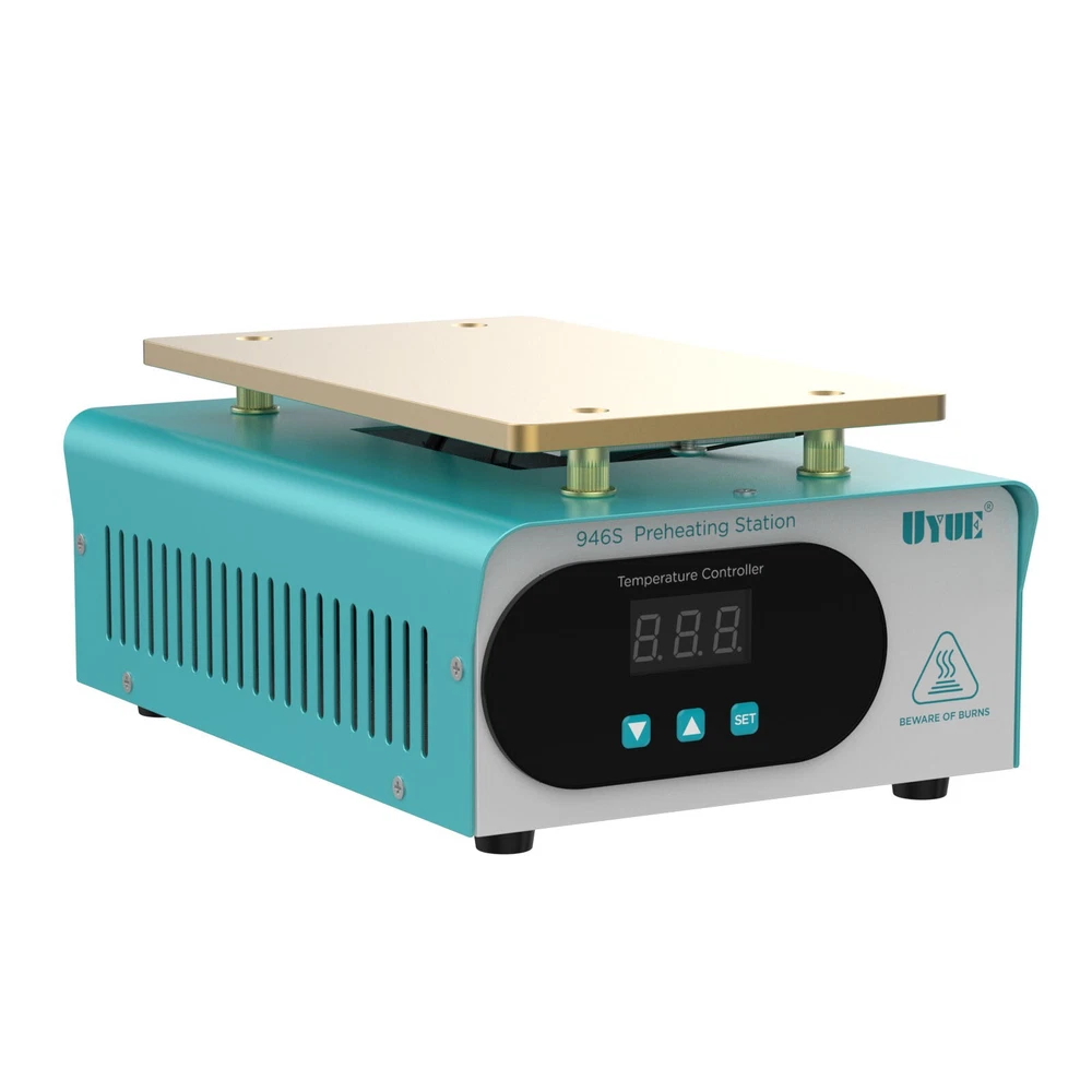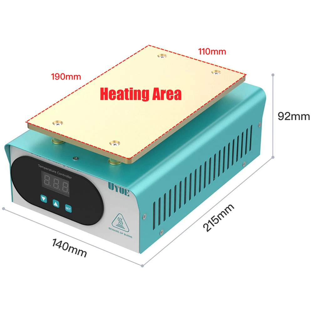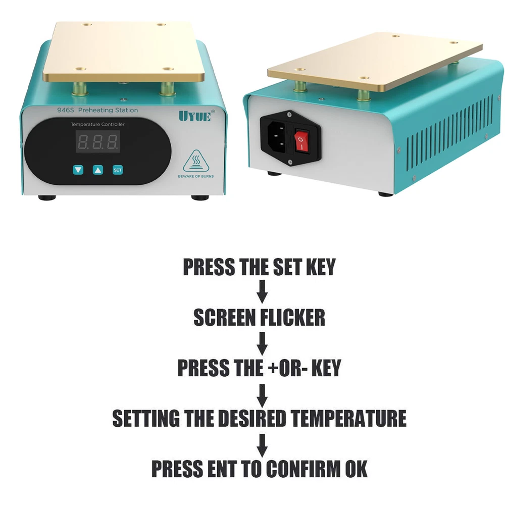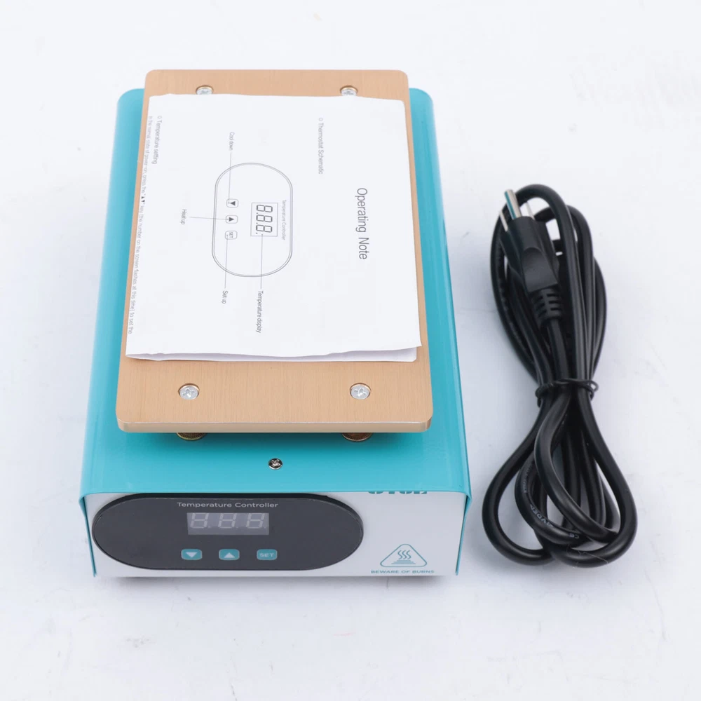 How to Use 1. Press the "SET" key to enter the temperature preset mode. 2. Press the"▲" or "▼" key to adjust the temperature up or down. 3. Press the "SET" key again to confirm after presetting the temperature. Specification Model: 946S Color: Blue Plug: US Voltage: 110V Power: 400W Heat Area: 190*110mm/7.48*4.33inch Plug: US Standard Display: LED Digital Screen Heat Generation Mode: PTC Heating Element Temperature Range: 50-180℃/122-356℉ Material: Iron, Aluminum Surface Treatment: Painting, Oxidation Gross Weight: 1.72kg/3.79lbs Package Size: 25.5*20*13.5cm/10.04*7.87*5.31inch Package Included 1* LCD Separator Machine 1* Power Cord 1*English Manual LCD Screen Separator Heating Hot Plate Removal Repair Machine cellphone Repair LCD SCREEN SEPARATOR MACHINE Mobile Phone Tablet Screen Separator Heating Plate Repair Tool LCD Screen Separator 400W Description There is a high chance that the phone screen is broken just the surface lens is broken, not the LCD screen inside it. With this screen separator, you can greatly reduce the cost of changing your screen. This machine uses a PTC heater and an aluminum heating plate, which heats up quickly and is very simple to operate, even if you do not know the circuit or the brush can easily operate. How to Use 1. Press the "SET" key to enter the temperature preset mode. 2. Press the"▲" or "▼" key to adjust the temperature up or down. 3. Press the "SET" key again to confirm after presetting the temperature. Specification Model: 946S Color: Blue Plug: US Voltage: 110V Power: 400W Heat Area: 190*110mm/7.48*4.33inch Plug: US Standard Display: LED Digital Screen Heat Generation Mode: PTC Heating Element Temperature Range: 50-180℃/122-356℉ Material: Iron, Aluminum Surface Treatment: Painting, Oxidation Gross Weight: 1.72kg/3.79lbs Package Size: 25.5*20*13.5cm/10.04*7.87*5.31inch Package Included 1* LCD Separator Machine 1* Power Cord 1*English Manual Key Features Sturdy and Durable: Its body is made of high-quality iron through painting, making it hard and not easily damaged. The aluminum heating plate has high strength and good corrosion resistance after oxidation, so it can be used for a long time. Precise Temperature Control: You can select the right temperature with the temperature adjustment key for more precise temperature control to make screen separation easier. The LED display allows you to observe the temperature better. High Performance: The screen separator machine has a built-in PTC heater that heats up quickly, so that the screen can start separating in 3-5 minutes of preheating. The heating plate is made of aluminum, which conducts heat quickly and evenly, making the machine work more efficiently. Good Heat Dissipation: Multiple cooling holes on the housing ensure better cooling performance and more stable operation in high-temperature environments. High Compatibility: It has a large heating plate size of 7.48*4.33inch and is suitable for all brands of mobile phones with a screen size of less than 8". Save Money: This machine separates the broken glass from the LCD, and if the LCD is still working well, you only need to replace one glass screen instead of the entire screen assembly, which saves you money. Safe to Use: The machine is equipped with a built-in fuse to ensure that the machine will not burn out during operation, which guarantees the safety of the use process. Quality Service: We stand behind all our guests and look forward to assisting you with your purchase. It is our pleasure to answer your confusion and questions. So please feel free to contact us if you have any problems with the product. Details One-touch Start Button: This screen separator is designed with a one-touch start button for your convenience. And the power jacks and switches of the machine are located on the back of the machine, adjacent to each other, making it more convenient for you to operate. Rounded Corners: The corners of the machine are rounded to effectively avoid scratching your hands during operation. Anti-slip Foot Pads: There are four anti-slip foot pads on the bottom to make the machine more stable during work. Application It is a machine for repairing damaged screens by separating the LCD from the lens. It is suitable for all brands of mobile phones with a screen size of fewer than 8 inches. Notes When you are a new repairer, we suggest you better practice your skills with some damaged LCD components. Please allow the slight color difference caused by the shooting light and 1-3cm error due to manual measurement, and make sure you do not mind before ordering. Payment Delivery details Terms of sales About us Contact us Payment We accept ebay payment 。 Fees such as import duties, taxes are not included in the item price or shipping costs. These charges are the buyer's responsibility. Delivery details Shipping: 2-9 working days to: USA Terms of sales We maintain high standards of excellence and strive for hundred percent customer satisfaction. Feedback is very important to us. We hope that you contact us immediately before you give neutral or negative feedback, so that we can address your concerns. It is impossible to address issues if we do not know about them! About us Your satis faction is our ultimate goal. We work hard to earn your trust and future business. Our certified technicians have tested each item before shipping. The unit comes with 1 year limited warranty on all manufacturing defects. a) If you receive a defective item, you may return it or ask for a discount. Please contact us within 14 days after you receive the package. b) What you returned must be intact and in its original packaging as re? u. Customer is responsible for shipping costs of the returned item. c) We will cover the cost of shipping back t with the shipping rate indicated in the registration page. We will send you a new unit or refund the full payment you paid. Thank you. Contact us Business Hour Business Hour: Monday To Friday: 8:30 AM to 5:00 PM (Beijing 