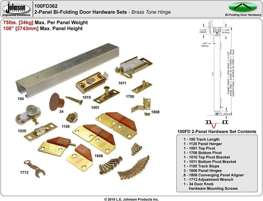 Johnson 4-Panel Hardware Set 36" - 2 Door System HEAVY DUTY - Bi-fold closet door hardware kit for 1" to 1 3/4" thick panels. COMMERCIAL GRADE - 75 pound capacity, heavy gauge steel pivot components hold heavy doors securely in place. PATENTED DESIGN - Heavy-duty tricycle hangers distribute weight equally and support heavy solid core door panels. EASY-TO-USE - 2-piece non-mortise hinge enables door panels to be installed or removed by simply lifting off. MADE IN USA - Manufactured in the United States. Part number .