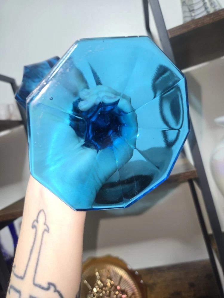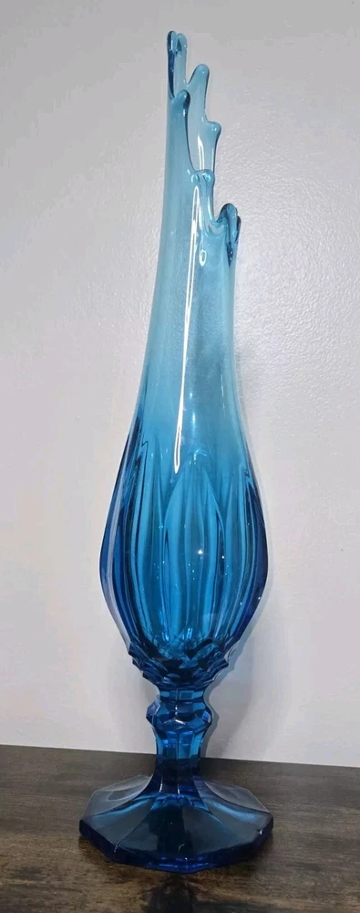 This beautiful vase from L.E. Smith's Blue Dominion collection is a stunning piece of hand-blown glass. With a glossy finish and a dominating blue color, it's sure to catch the eye of any Mid-Century Modern enthusiast. The vase measures 22 inches in height and has nine fingers, making it a unique and original piece. Crafted in the United States using traditional glass-making techniques, this vase is an impressive addition to any collection. The backstamp is impressed and the production style is stretch glass, adding to its authenticity. This original piece is perfect for displaying flowers or as a stand-alone decorative item.