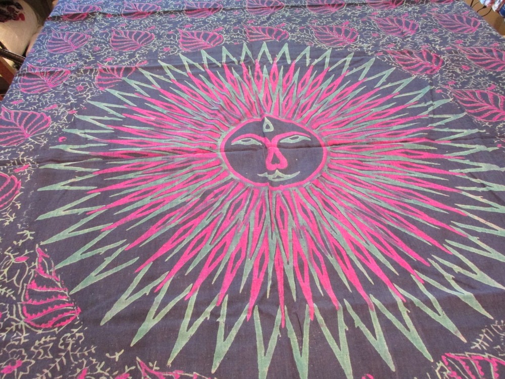 This listing is for a light, cotton bed spread or tapestry that measures 64 x 90. It features a large center design. The rest of the tapestry is covered by large batik leaves. Please note that there is a sun bleached streak on one of the folds. Please see the other tapestries that I will be listing. 111625 Please write if you have any questions and thanks for looking. Please see all of my listings .