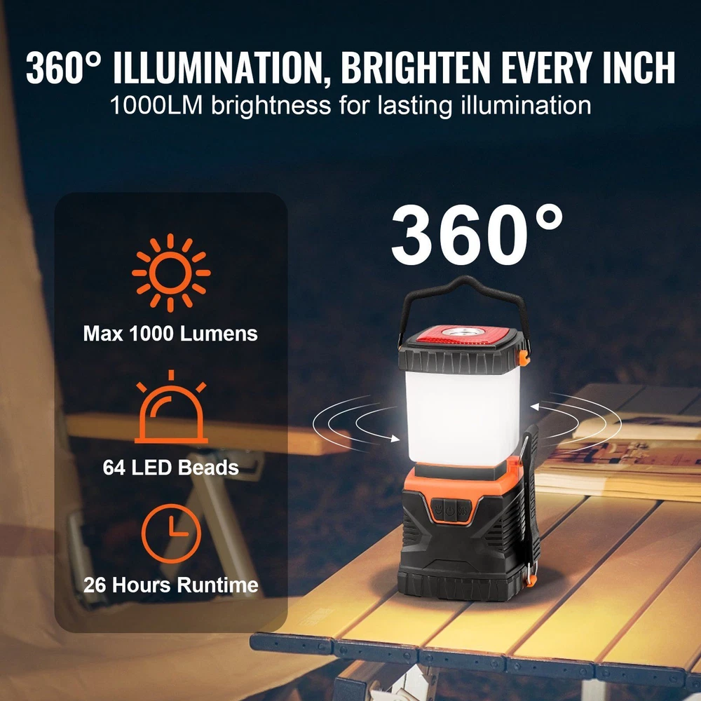 All-in-One LED Camping Lantern Light up your space with 64 LED beads and 360° illumination. Choose from 2 illumination modes to brighten up any room or outdoor area. Ideal for making your adventures more pleasurable and your home brighter Enjoy up to 26 hours of light with the built-in 4400mAh battery. Plus, use our camping light as a power bank in emergencies to keep your devices charged. Stay prepared and connected no matter where you are. Our camping flashlight with a convenient hook on the bottom and metal handle on the top makes it easy to hang in tents or from trees for hands-free lighting and added security. So you can focus on what matters most during your adventures. Switch between cold white, warm white, high brightness, and flashing modes with a quick press of the button. Customize your light to fit your needs and enhance your experience. Suitable for camping, hiking, and power outages. Our portable camping lantern is a must-have for outdoor adventures, ensuring you have reliable light wherever you go. Take it along for any adventure and light up your journey.