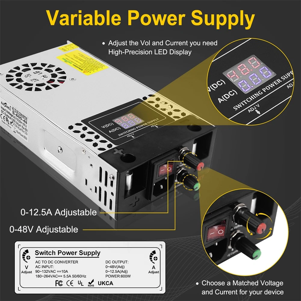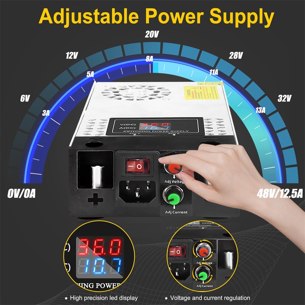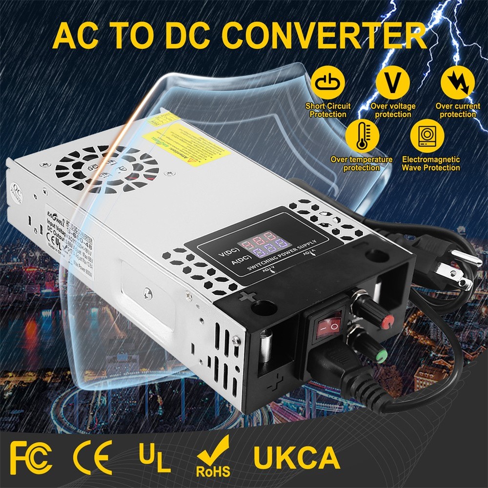 2-100Pack Diamond Protector for Hot Wheels Team Transport Clamshell Diecast Case 11.29 USD Free shipping Walkie Talkie Shock Collar for Dogs Training Collar 4921ft with Remote Control 26.49 USD Free shipping 1-10pcs Finger Flush Pulls for Closet Pocket Sliding Barn Door Handle Set 8.69 USD 8.0 USD 3-7 Tier Clear Acrylic Collector Card Display Stand Rack Shelf For Trading Cards 14.19 USD Free shipping 1-10X Magnetic Slab Case Protector For BGS Graded Cards Stackable Metal Bumper 15.59 USD Free shipping US Solar Power LED Light Sign House Street Door Address Plaque Number Plate Lamp 23.99 USD Free shipping Wood Earring Display Rack Stand Holder For Stud Hook Earrings Jewelry Organizer 12.69 USD Free shipping 1-20X Magnetic Slab Case Protector For PSA Graded Cards Stackable Metal Bumper 18.49 USD Free shipping Wireless Electric Dog Fence Pet Containment System Shock Collars For 1/2/3 Dogs 22.56 USD 8.0 USD For Samsung Galaxy S23 Ultra 5G S Pen Stylus Black SPen Replacement SM-S918 13.39 USD 8.0 USD Product Description Features: - The converter's wide range of DC 0-48V easily adjusts the output voltage of your device. Suitable for 5V, 9V, 12V, 24V, 36V and 48V devices with a voltage accuracy of 0.1V. - The converter is equipped with an LED screen, heat sink and cooling fan to ensure safe and efficient operation. the LED screen displays the output voltage while the heat sink and cooling fan maintain the temperature, even during high power use. - This power supply requires no installation and is easy to use to regulate the output once it is wired up. The potentiometer is built into the power supply. The output parameters can be adjusted by simply turning the potentiometer. - Overload protection, overvoltage protection and short circuit protection will protect your equipment from damage. Note: The default input voltage is 220V. Before use, please switch the input voltage to 110V/220V according to the voltage in your city. - Wide range of applications The power supply has variable applications. It can be used as a 5V 12V 24V 36V 48Vpower supply for RV, automotive, Labtop, computer, laboratory, CCTV, etc. Caution: - The maximum current is 12.5A. However, the actual current depends on the load. The current is 12.5A no matter how much voltage is adjusted and cannot be adjusted. It can be used for 2A 3A 5A 10A 12.5A devices. Please ensure that you use devices up to 12.5A. - This device is an adjustable voltage power supply, so please make sure that the rated voltage of the device is used. After connecting the input power supply, adjust the output voltage to the required voltage before connecting the device for use. - The power supply will automatically recognise the maximum current when connected to the device, the current can only be adjusted downwards, not upwards (to protect the safety of the device, the adjustment will damage the connected device). - When using the motor, do not allow the rated power of the motor to exceed 50% of the power supply. (e.g. if the maximum power of the power supply is 600W, the maximum power can only be used with a 300W motor) Specifications: Input voltage & frequency range: 110V-120V / 220V-240V Frequency range: 47-63Hz Output adjustment range: adjustable throughout (rated output voltage) Output voltage: DC 0-48V Output current: 0-12.5A Rated power: 600W Conversion efficiency: >83% Leakage current: <1mA/240V AC Load stability: ±1% Temperature coefficient: ±0.03%/°C (0 to 50°C) Inrush current: Cold start current 20A/110 10A/220V Overload protection: 105% to 200% (rated load), self recovery Over-voltage protection: 115% to 135% (rated output voltage) Short circuit protection: self-recovery Output start time: ≤2S@120VAC ≤1.0S@230VAC Output holding time: ≥10mS@120VAC,≥20mS@230VAC Insulation strength: input-output: AC1500V,1min; input-case: AC1500V,1min; output-case: DC500V,1min Operating environment: -10℃~50℃; 20%~90%RH (no condensation) Safety standard: Design reference EN/UL60950 EMC standards: Design reference EN55022 Class B; EN61000-4-2/-3/-4/-5/-6/-11 Package includes: 1 x switching power supply 1 x power cable 1 x metal clip 1 x screw 1 x Mounting bracket