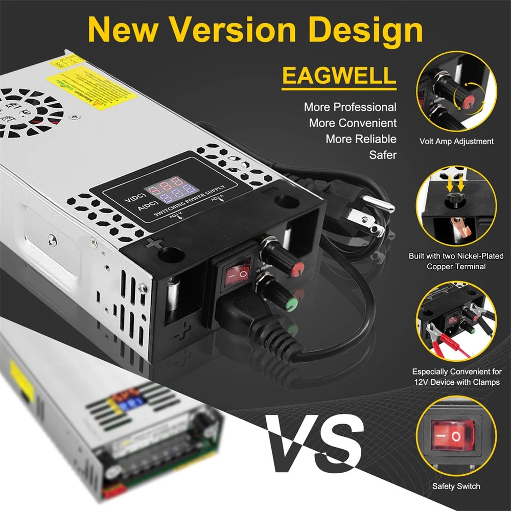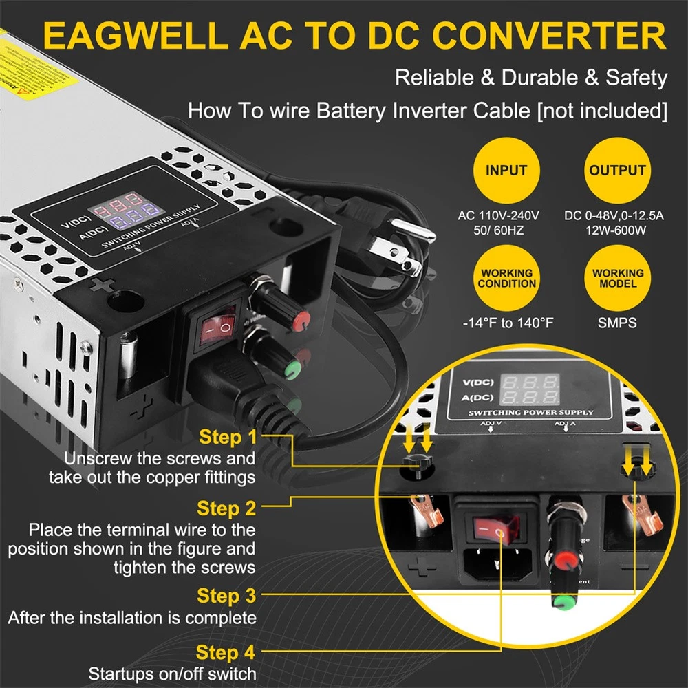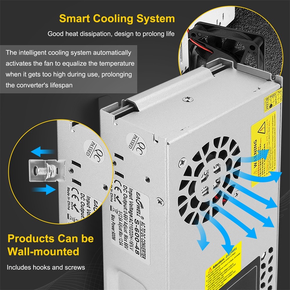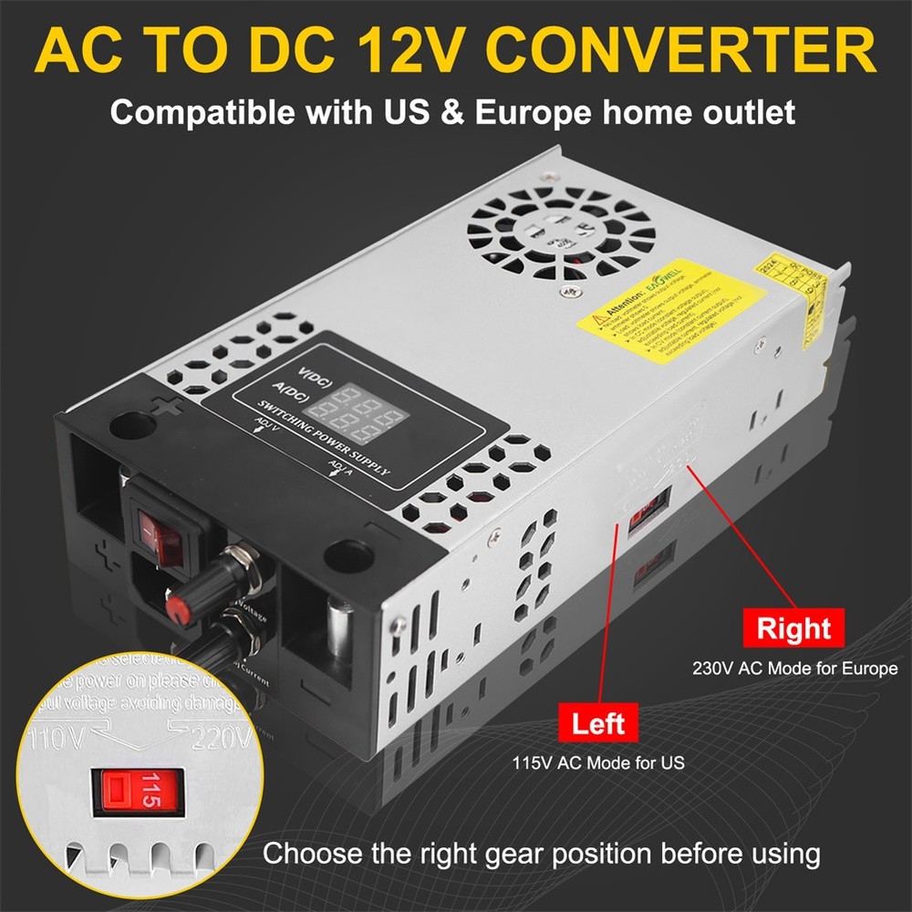 2-100Pack Diamond Protector for Hot Wheels Team Transport Clamshell Diecast Case 11.29 USD Free shipping Walkie Talkie Shock Collar for Dogs Training Collar 4921ft with Remote Control 26.49 USD Free shipping 1-10pcs Finger Flush Pulls for Closet Pocket Sliding Barn Door Handle Set 8.69 USD 8.0 USD 3-7 Tier Clear Acrylic Collector Card Display Stand Rack Shelf For Trading Cards 14.19 USD Free shipping 1-10X Magnetic Slab Case Protector For BGS Graded Cards Stackable Metal Bumper 15.59 USD Free shipping US Solar Power LED Light Sign House Street Door Address Plaque Number Plate Lamp 23.99 USD Free shipping Wood Earring Display Rack Stand Holder For Stud Hook Earrings Jewelry Organizer 12.69 USD Free shipping 1-20X Magnetic Slab Case Protector For PSA Graded Cards Stackable Metal Bumper 18.49 USD Free shipping Wireless Electric Dog Fence Pet Containment System Shock Collars For 1/2/3 Dogs 22.56 USD 8.0 USD For Samsung Galaxy S23 Ultra 5G S Pen Stylus Black SPen Replacement SM-S918 13.39 USD 8.0 USD Product Description Features: - The converter's wide range of DC 0-48V easily adjusts the output voltage of your device. Suitable for 5V, 9V, 12V, 24V, 36V and 48V devices with a voltage accuracy of 0.1V. - The converter is equipped with an LED screen, heat sink and cooling fan to ensure safe and efficient operation. the LED screen displays the output voltage while the heat sink and cooling fan maintain the temperature, even during high power use. - This power supply requires no installation and is easy to use to regulate the output once it is wired up. The potentiometer is built into the power supply. The output parameters can be adjusted by simply turning the potentiometer. - Overload protection, overvoltage protection and short circuit protection will protect your equipment from damage. Note: The default input voltage is 220V. Before use, please switch the input voltage to 110V/220V according to the voltage in your city. - Wide range of applications The power supply has variable applications. It can be used as a 5V 12V 24V 36V 48Vpower supply for RV, automotive, Labtop, computer, laboratory, CCTV, etc. Caution: - The maximum current is 12.5A. However, the actual current depends on the load. The current is 12.5A no matter how much voltage is adjusted and cannot be adjusted. It can be used for 2A 3A 5A 10A 12.5A devices. Please ensure that you use devices up to 12.5A. - This device is an adjustable voltage power supply, so please make sure that the rated voltage of the device is used. After connecting the input power supply, adjust the output voltage to the required voltage before connecting the device for use. - The power supply will automatically recognise the maximum current when connected to the device, the current can only be adjusted downwards, not upwards (to protect the safety of the device, the adjustment will damage the connected device). - When using the motor, do not allow the rated power of the motor to exceed 50% of the power supply. (e.g. if the maximum power of the power supply is 600W, the maximum power can only be used with a 300W motor) Specifications: Input voltage & frequency range: 110V-120V / 220V-240V Frequency range: 47-63Hz Output adjustment range: adjustable throughout (rated output voltage) Output voltage: DC 0-48V Output current: 0-12.5A Rated power: 600W Conversion efficiency: >83% Leakage current: <1mA/240V AC Load stability: ±1% Temperature coefficient: ±0.03%/°C (0 to 50°C) Inrush current: Cold start current 20A/110 10A/220V Overload protection: 105% to 200% (rated load), self recovery Over-voltage protection: 115% to 135% (rated output voltage) Short circuit protection: self-recovery Output start time: ≤2S@120VAC ≤1.0S@230VAC Output holding time: ≥10mS@120VAC,≥20mS@230VAC Insulation strength: input-output: AC1500V,1min; input-case: AC1500V,1min; output-case: DC500V,1min Operating environment: -10℃~50℃; 20%~90%RH (no condensation) Safety standard: Design reference EN/UL60950 EMC standards: Design reference EN55022 Class B; EN61000-4-2/-3/-4/-5/-6/-11 Package includes: 1 x switching power supply 1 x power cable 1 x metal clip 1 x screw 1 x Mounting bracket