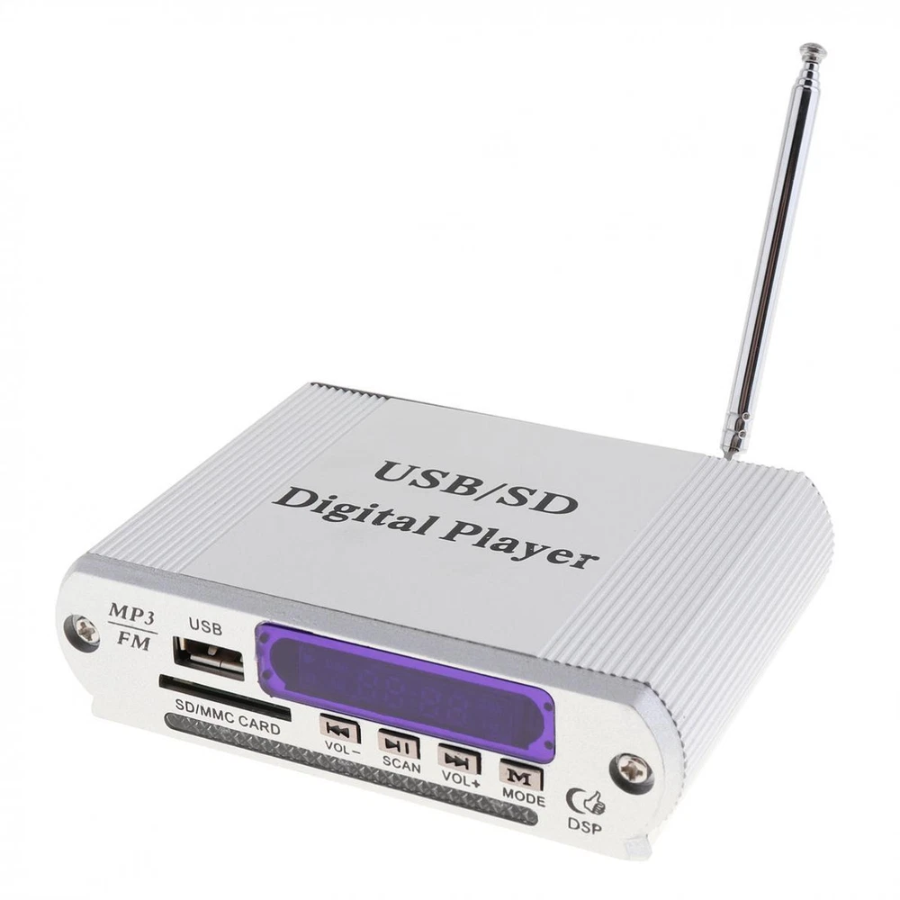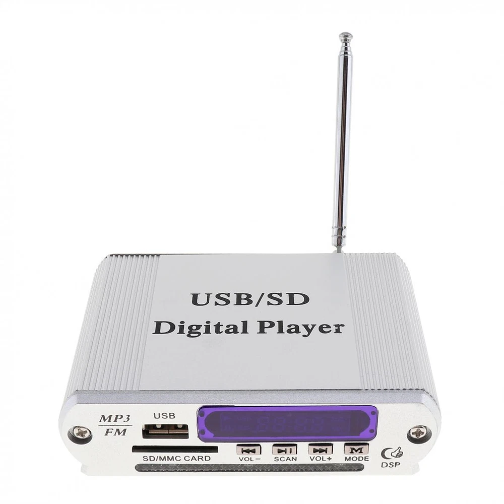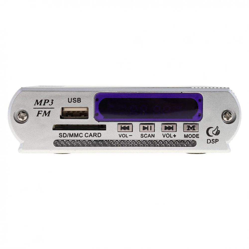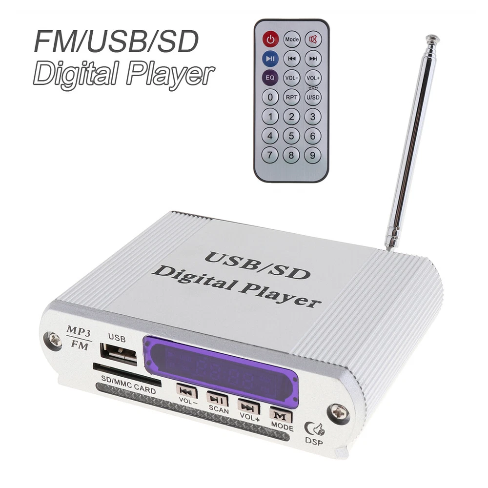 Description Item Description: Package Including: Package Including: 1 x LED Display 1 x Remote Control Frequency Response: 20Hz - 20KHz Impedance: 4 - 8Ω Out Power: Dose not apply Number of Channels: 2 Audio Sensitivity: 0.25mv-50mv Material Type: Aluminum Alloy Frequency Range (Hz): 87.5MHz - 108.0MHz Signal To Noise Ratio: Dose not apply Display: Dazzle color electricity LED level display Format: MP3 / FM MP3 In Memory Type: USB / SD Support: USB / SD / MMC card Color: Silver Controls and Buttons: - 4-Electronic keypad control - Power on/off control - Mode button - Vol+ / Forward button - Vol- / Backward button - Play / SCAN button - Power off / on Features: - Comes with USB port, support mp3 music play from U disk. - Dazzle color electricity LED level display. - 4-Electronic keypad control makes performance easier. - Support mp3 music play from SD / MMC card. - It supports FM radio play(FM: 87 ~ 108MHz), and can store station under FM mode. - It is two channel output. - Sound mode digital display. - Revolutionary amplifier technology, ultra compact design, light weight. - Remote control make your performance more convenient in a long distance. Place of Application: Car/ Motorcycle Product Weight: 170 G / 6.00 Ounces Product Dimensions (L*W*H): 17.0*13.5*3.5 CM / 6.69*5.31*1.38 Inches Package Weight: 185.0 G / 6.53 Ounces Package Dimensions (L*W*H): 17.0*13.5*3.5 CM / 6.69*5.31*1.38 Inches Retail Packaging: Yes, Blister Packaging Payment 1. When put the order in the awaiting payment,Payment must be paied within 20days. 2. We accept payment by Paypal 3.Please write down your special requests (color, size, etc.) in the NOTE when you make payment. 4.TOTAL AMOUNT includes the final price plus S&H(Shipping and Handling). Shipping 1. We only ship to eBay confirmed address 2. Item will be shipped within 48 hours after payment received, excluding weekends and holidays. 3. Most orders are delivered within the stated shipping time at the time of purchase 4. Shipping are not available for PO BOX, Parcel locker, Parcel collect 5. If you don't receive your shipment within 35 days after payment, please feel free to contact us. We will take proper actions to solve the problem for you Retrun 1.notify us by message before returning 2.Contact us within 30 days of receiving the item