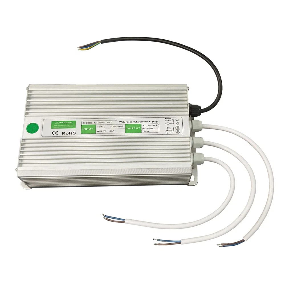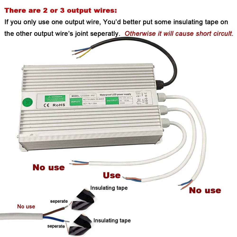 Applications: Adaptor designed specifically for our LED Lamp or strip light.Its high quality and new power supply for 3825 5050 5630 3014 2835 7020 led strip Light, Wireless Router, ADSL Cats, HUB, Switches, Security Cameras. Audio/Video Power Supply etc, it is easy connection and simplicity to use. Package included: 1x Power Supply. * Notice 1: The input: In order to be safe, please note the Live Wire, Neutral Wire, Ground Wire. If you connect wrong, power supply will not work. * Notice 2: The output: Please note Positive and negative pole. With the functions of overvoltage protection, short circuit protection and overload protection. Why does it stop working? Maybe the overcurrent protective switch (in the power supply) disconnect. You need to wait about 10 minutes. It will be auto recovered. Then reconnected it. Then it will work well. Input: AC 110v; Output: DC 12V ; Waterproof IP67, for outdoor indoor use. Constant voltage output, to ensure the stability of the power supply; With the anti-interference function, to ensure the long-life LED lamps; With the functions of overvoltage protection, short circuit protection and overload protection Please Note: No installation instruction, wiring cable, on/off switch, or screws come with this Unit. Professional installation of qualified electrician is required. Notice 1, The input: In order to be safe, please note the Live Wire, Neutral Wire, Ground Wire. If you connect wrong, power supply will not work. Notice 2, The output: Please note Positive and negative pole. Why does it stop working? Maybe the overcurrent protective switch (in the power supply) disconnect. You need to wait about 10 minutes. It will be auto recovered. Then reconnected it, it will work well.