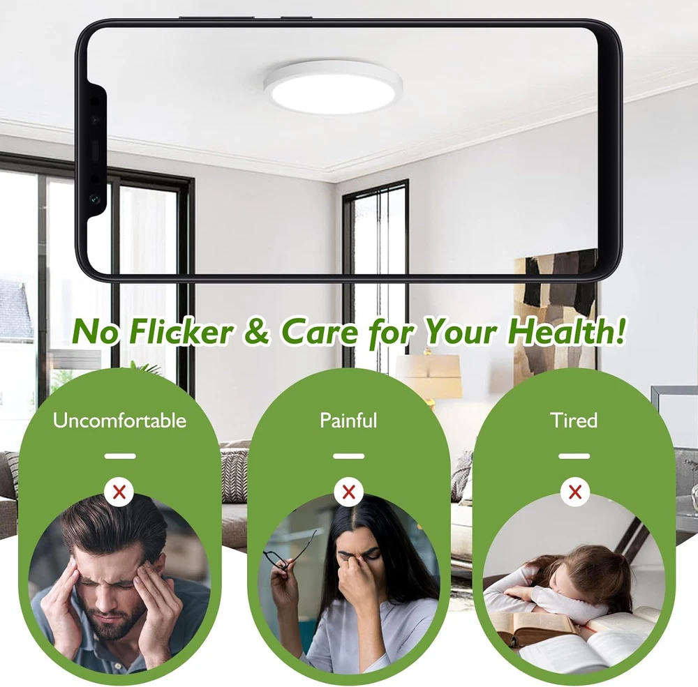 【Energy Saving & Dimmable】This LED ceiling light is only 15W, yet has an output brightness of 1200LM. That means we use lower wattage, but higher brightness output to help you make your monthly electricity bill lower and lower - our ceiling light saves almost 90% of energy compared to traditional lamps. In addition, our flush mount ceiling light uses an advanced dimming chip that ensures smooth dimming without flicker or buzz, so our light is very friendly to your eyes. (Dimmer not included) 【Super Reliable & Durable Material】Our ceiling lamp is made of high quality plastic, you don't need to worry about it fading, rusting or corroding as time goes by. The surface of the light is designed to be enclosed, which makes it dust-proof and easy to clean. Our LED flush mount ceiling light is sturdy, durable, long-lasting and very safe to use - which is expected to provide a lifetime up to 30,000 hours, which more than 27 years at a standard usage time(3 hrs per day). 【Ultra-thin & Wide Application】We designed this ceiling LED light with simple but not boring lines and super slim body, it can increase the modern and stylish charm to your house. Our 7 inch flush mount fixture has a thickness of only 0.8 inches, which is very perfect for low profile. This LED light fixture is also suitable for kitchen, bedroom, hallway, living room, closet, stairway, restaurant, hotel, office and so on! 【Easy Installation】Our ceiling light fixture is hardwired and no assembly required. With a slide and lock design mounting plate, the low profile ceiling light fits most Junction Boxes, making installation easy and secure. Besides, the package includes all the mounting accessories and step-by-step instructions, so you can easily get a beautiful improvement to your home in just a few minutes. 【Worry-free to Buy】This round LED ceiling light makes a thoughtful gift for your friend or loved one who needs a extra light. The high quality non-flammable plastic cover prevents electrical shorts caused by electrocution, leakage and other potential disaster risks. If you have any problems, we are glad to provide help. We care about every feedback and cherish every opportunity to give you a perfect shopping experience! Product Description Are you tired of lights that are hard to install and cost you a lot of time? Are you looking for a ceiling light that doesn't require much space? Can you no longer stand the flickering and buzzing lights? Are you frustrated with the high bill of electricity you spend on lighting? Then, Brightever LED Flush Mount Ceiling Light Fixture is the ideal choice for you! This dimmable ceiling light is only 0.8 inch thick, making it perfect for low profile areas. With a dust-proof surface, it takes the hassle out of your daily cleaning. Thanks to the high quality LED chips that provide plenty of even, flicker-free light (up to 1200LM), this close to ceiling light fixture is bright and protects your eyes from glare for your everyday use. This flush mount light fixture combines a minimalist design and the clean lines, adding a minimalist and modern appeal that matches most styles of decoration. Our 15W LED ceiling light is equivalent to a traditional 130W incandescent bulb, saving up to 90% of energy for you and cutting your electricity bill for lighting. The efficient hallway light also has an outstanding lifespan of over 30,000+ hours, which largely reduces the frequency of lamp replacement. Product Specifications Color: 5000K Daylight White Luminous Intensity: 1200LM Watts: 15W Lifespan: 30000 Hours Featuring a super slim body (0.8 inch only) and smooth surface with no bulges, this modern ceiling light is suitable for low ceilings and is perfect for a variety of decorative styles. This porch ceiling light is dimmable, you can smoothly adjust the brightness of the light to meet your different needs, and it works well with most dimmers. (Please note: dimmer not included). The enclosed design of the surface makes this LED closet light well sealed and no dust can get inside. You only need to gently wipe the surface of it to complete the cleaning. How convenient! Super easy to install! Installation can be done in just 3 steps. Mount the crossbar to the ceiling, then connect the wires, and finally fix the light to the crossbar. You can easily do it yourself, saving you a lot of time as well as the cost of an electrician.