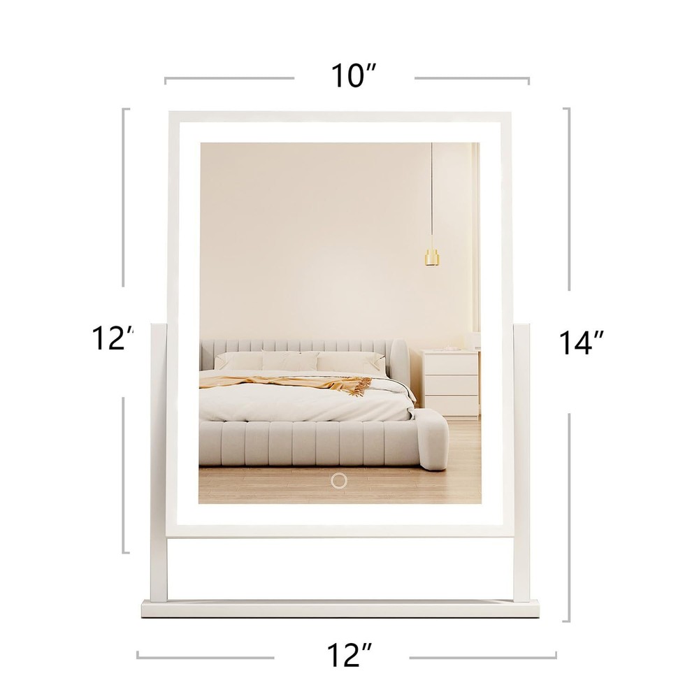 Natural and Bright Lighting: with warm light/daylight settings and adjustable brightness, provide a clean and bright reflection and allow you to get the most natural application of makeup, even at night mirror Smart Touch Control: Simply turn on/off the light and adjust the brightness by touching the sensor switch on the screen Sturdy Construction and High Quality LED : Strong, solid feel with metal frame and base, built to withstand heavy use. Gorgeous and superior reflective mirror built to last with top quality material. Non-replaced LED bulbs with 50,000 hours life span; no need to replace the bulbs Perfect Size: Overall frame (12" L x 14" H ) allow you to get your entire face in view at once. Large enough to be used for makeup, grooming, or even dressing. 180-degree free rotation can fix at any position to give you the perfect viewing angle Perfect Gift: With the hollywood style design, this dream makeup mirror with lights can be an elegant decoration for your both your bedroom and vanity area. Making this the best gift for makeup lovers