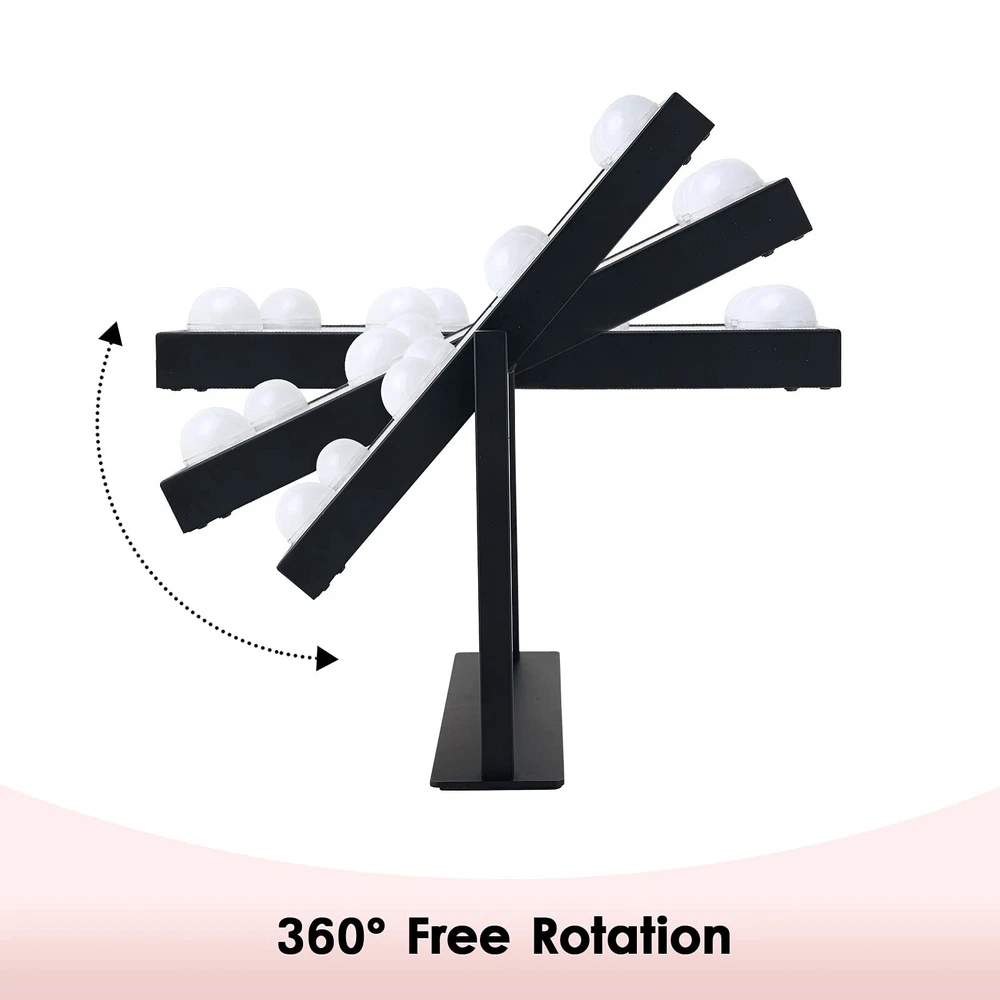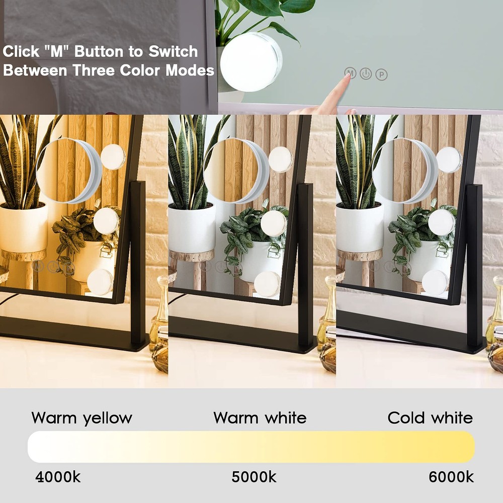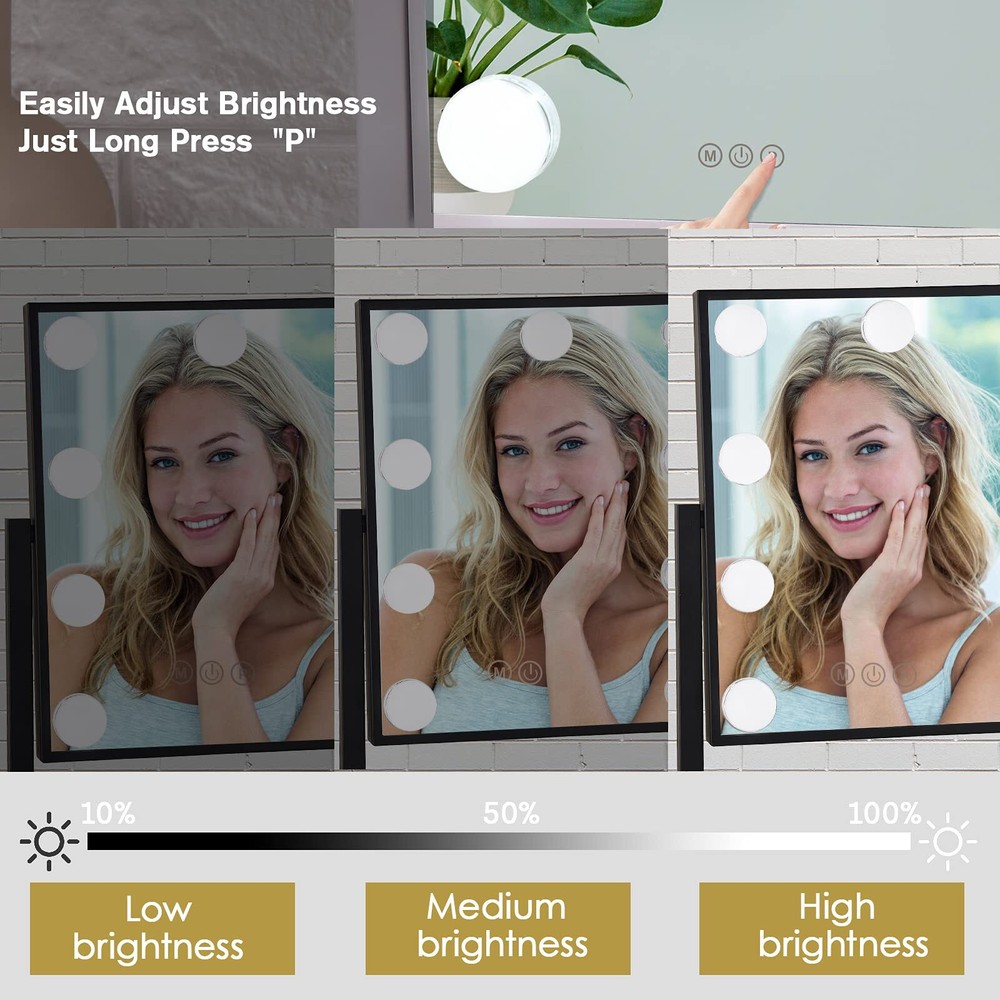 Perfect Size: The makeup mirror (11.8" L x 10" H) allow you to get your entire face in view at once. Large tabletop mirror is large enough to be used for makeup, grooming and even dressing. 360 degree rotation can be fixed in any position, providing you with a perfect perspective Natural & Bright Lighting: Lighted makeup mirror surrounded by 9pc LED bulbs with day light / cool light / warm light settings, adjustable brightness is meet to your personal makeup requriement Smart Touch Control & Memory Function: Simply turn on/off the vanity mirror, touch the sensor switch on the screen to adjust the brightness. Memory function makes this lighted vanity makeup mirror return to the same brightness it was on before being switched off Metal Frame & High Quality LED Bulbs: The Tabletop Vanity Mirror Made of top materials, sturdy and durable. The pre-installed LED bulb has a life span of up to 50,000 hours, soft light protect your eyes Great Vanity Mirror: The Hollywood Style Makeup Cosmetic Mirrors with Lights can add elegant decoration to your bedroom and dressing table area. Make it the best mirror for makeup lovers