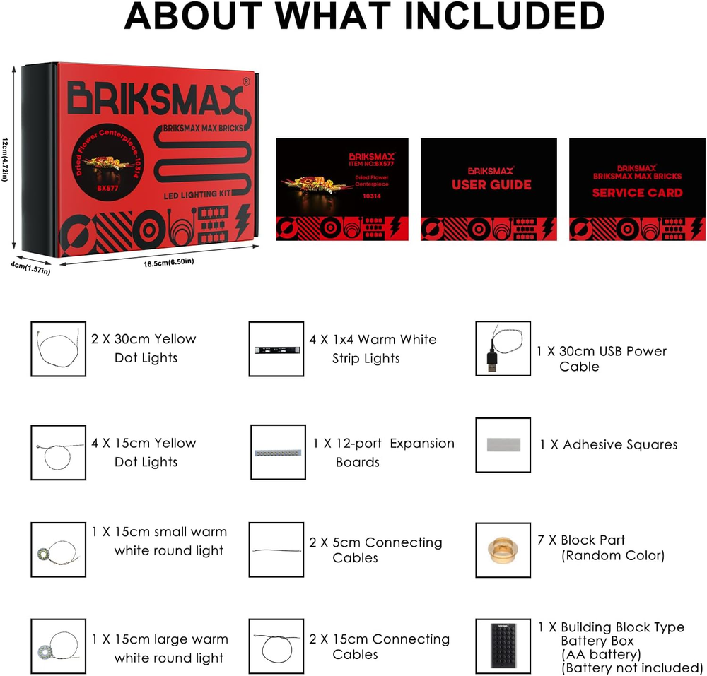 Led Lighting Kit for Lego-10314 Dried Flower Centerpiece - Compatible with Lego Icons Building Set- Not Include Lego Set Innovative Design: Designed for Lego 10314,with this light kit, you can bring your Lego Dried Flower Centerpiece from dark to bright, make it come to life. Brilliant Crafts: On the premise of using safe and reliable materials, using different lights and hiding the lines can make the model display effect is more perfect. It is a great addition for model collectors who want to add more details to their sets. Simply Install: With a step-by-step instruction, you will find an easier way to enjoy the pleasant DIY process and make a huge upgrade to your favorite building kit. Warm Service: We always do our best to provide good quality products as well as excellent service to our customers. If you have difficulties with your product, please send us an email, we will help you solve the problem in time. Note: LED light included only.All LEGO sets showed in images and videos are not included. Product Description Unique lighting design for Lego 10314 Dried Flower Centerpiece You'll be amazed when you're done installing. Your LEGO models will no longer be overshadowed. Instead, it glows with the help of a lighting kit. So give your LEGO sets a whole new look by upgrading them with the BRIKSMAX LED Lighting Kit. The video showcases the product in use. The video guides you through product setup. The video compares multiple products. The video shows the product being unpacked. NOTE: Only LED light is supplied. All LEGO sets shown in pictures and videos are not included. With this light kit, you can bring your Lego set from dark to bright, make it come to life. 1 Light up LEGO 2 Good Decoration For a brighter effect, USB is recommended.The power supplyshould be less than 5v to avoid burning. It comes with colored installation instructions, a user guide, and a service card. 1 Convenient Power 2 Easy to Install The battery box does not include batteries. Scan the code to get the tutorial video. Does this product contain LEGO bricks? The product is lighting only, LEGO bricks are not included. Does the battery case include batteries? We do not provide batteries. How to start installing your bricks? 1. The package contains paper installation instructions. 2. You can scan the QR code on the box to obtain the installation video and PDF instruction. Light Source Type Light Emitting Diode Item model number 10314 Style 10314 Dried Flower Centerpiece Bulb Features Multiple Colors/Lighting Effects Power Source Battery Powered Mounting Type Table Mount Material Plastic Color [Gwp] Number of Light Sources 1 Country of Origin China Item Weight 7.7 ounces Are Batteries Included No Shape Flower Manufacturer recommended age 8 years and up Voltage 5 Volts EU Spare Part Availability Duration 5 Years Finish Type Painted Product Dimensions 6.5 x 4.72 x 1.57 inches 4.72 inches x 6.5 inches x 1.57 inches. Weight: 7.7 oz Shipping from the USA All of our products are shipped from the USA, ensuring quick delivery to your destination. Payment We offer the following payment methods: PayPal, credit card, bank transfer, and eBay's secure payment system. Free Shipping & Free Returns Shipping within the USA is FREE. Additionally, any return is absolutely free for you. Risk-Free Purchase You have the option to return an item within 30 days without any justification. We cover the return shipping costs! Fast Shipping We ship immediately upon receipt of payment. Generally, the package is delivered within 2-3 days in the USA. If it takes longer, we will contact you. Quality and Costs Made in Europe, USA, China No customs fees or additional charges Total satisfaction guarantee Invoice with declared VAT available upon request in .pdf format Feedback Your feedback is very important to us. After you pay for your purchase, you will automatically receive positive feedback from us.