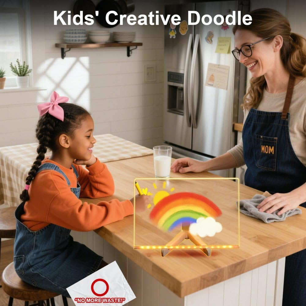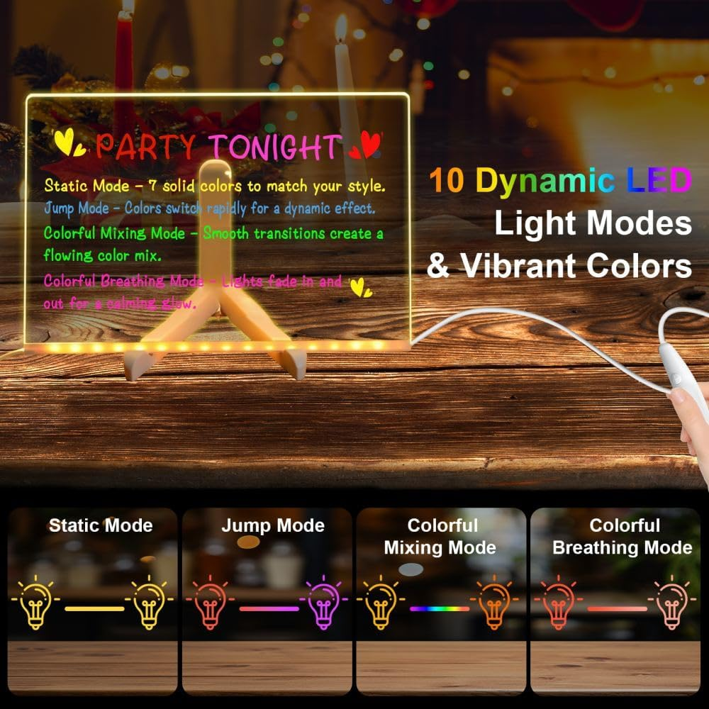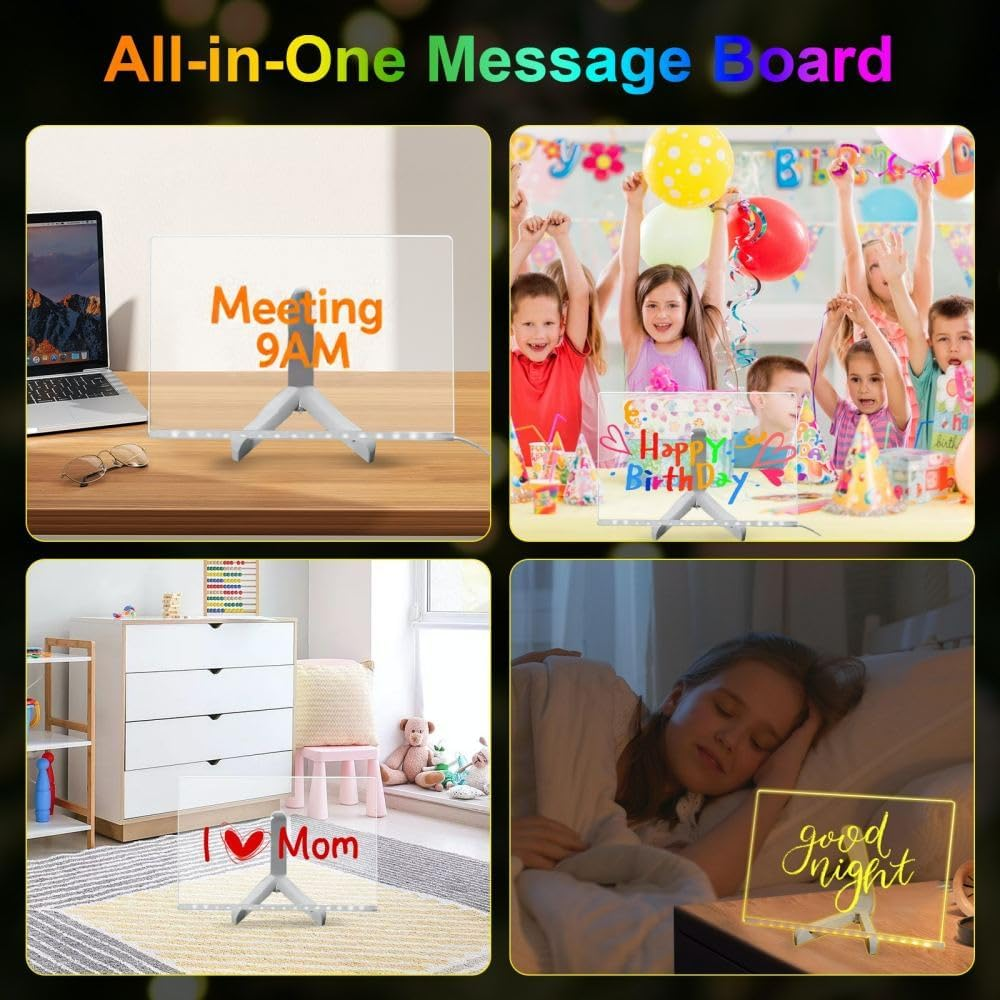 1. 【10 Dynamic LED Light Modes & Vibrant Colors】 Elevate your space with 7 dazzling colors and 10 lighting effects! This LED light board creates mesmerizing doodle glow displays for parties, offices, or home decor. Switch between static/fade/flash modes to set the perfect ambiance—ideal for highlighting memos, menus, or creative artwork 2. 【Professional-Grade Acrylic Dry Erase Surface】 Engineered for high-traffic use! The acrylic dry erase board features a scratch-resistant, crystal-clear surface that erases flawlessly—no ghosting or stains. Perfect for daily task lists, project planning, or collaborative brainstorming in busy offices 3. 【All-in-One Message Center for Modern Spaces】 Your ultimate communication hub! This led message board shines in offices (meeting reminders), homes (grocery lists), and venues (event signage). Its eye-catching glow ensures no note goes unnoticed, blending function with stylish decor 4. 【Eco-Friendly & Stress-Free Cleaning】 Maintain perfection in seconds! New marks? Erase instantly with the included tool. Dried stains? Lightly spritz water, then wipe with a damp cloth + dry towel. No chemicals needed—this magic board stays pristine for years 5. 【Versatile Decor & Functional Gift】 Transform spaces effortlessly! Use as a glowing menu board in cafes, motivational quote display in workspaces, or party welcome sign at events. Packaged as a sophisticated gift set loved by professionals and creatives alike Product description The video showcases the product in use. The video guides you through product setup. The video compares multiple products. The video shows the product being unpacked. LED Light Up Message Board Merchant Video