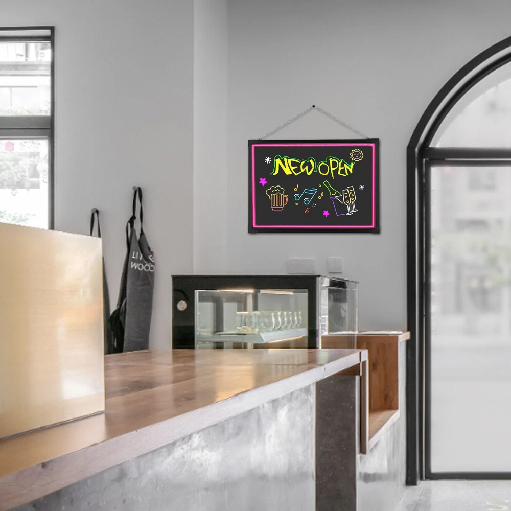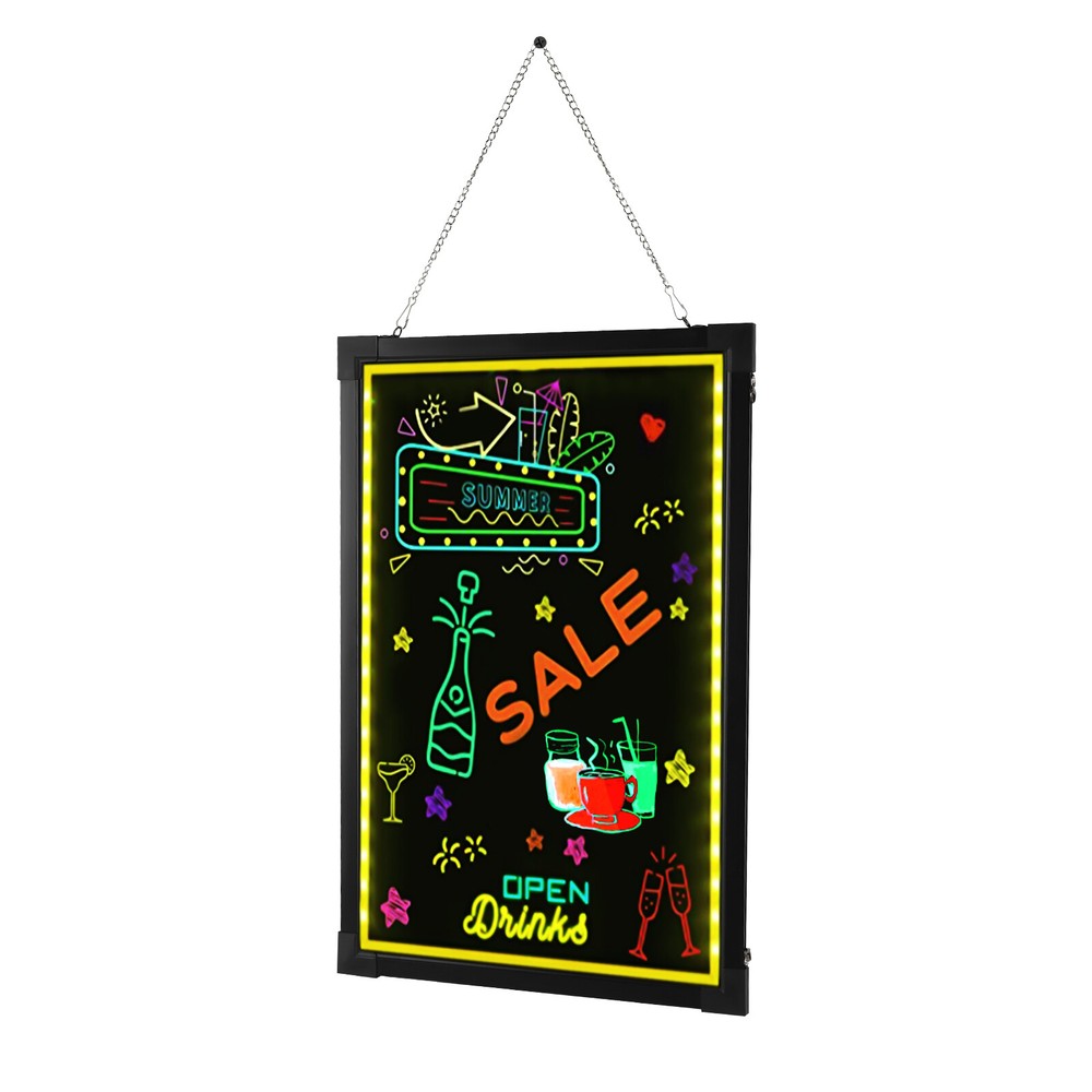 Illuminated LED Message Writing Board Specification Material: Tempered Glass, Aluminum Alloy, PP Color: Black Light Source: LED(5050) Plug: US Standard Power: 0.36W Voltage: AC110-240V DC12V 1A Power Supply: Plug-in/8*AA Batteries(Not Included) Light Colors: Red, Green, Purple, Yellow, Pink, Blue, White Fluorescent Colors: Red, Green, Purple, Yellow, Pink, Blue, White, Orange Number of Light Effects: 18 Length of Power Cord: 2m/6.56ft Working Temperature: -40~60℃/-40-140℉ Product Size: 50*70cm/20*28in 40*60cm/16*24in 60*80cm/24*32in Package Included 1x Led Writing Board 8x Fluorescent Pens 1x Remote Control 1x USB Controller 1x Cloth 1x Clear Chain 1x Power Cord with Plug 1x English User Manual LED Light Up Writing Board Flashing Illuminated Message Menu Sign Board 3-Size Description Description This LED message writing board with 7 color variations and 18 combinations of light effects can attract customers' attention with its eye-catching highlighter and brilliant light effects to bring excellent promotional effects. Such an innovative and unique promotion assistant is a must-have for milk tea stores, bars, and restaurants. Specification Material: Tempered Glass, Aluminum Alloy, PP Color: Black Light Source: LED(5050) Plug: US Standard Power: 0.36W Voltage: AC110-240V DC12V 1A Power Supply: Plug-in/8*AA Batteries(Not Included) Light Colors: Red, Green, Purple, Yellow, Pink, Blue, White Fluorescent Colors: Red, Green, Purple, Yellow, Pink, Blue, White, Orange Number of Light Effects: 18 Length of Power Cord: 2m/6.56ft Working Temperature: -40~60℃/-40-140℉ Type Middle Size Small size Large Size Size 50*70cm/20*28in 40*60cm/16*24in 60*80cm/24*32in Package Size 77.8*59*5.5cm/30.62*23.22*2.16in 66*48.5*5.5cm/25.98*19.09*2.16in 86.5*59*5.5cm/34.05*23.22*2.16in Gross Weight 4kg/7.71lbs 3kg/6.61lbs 5.5kg/12.12lbs Net Weight 3.5kg/7.71lbs 2.5kg/5.51lbs 5kg/11.02lbs Package Included 1x Led Writing Board 8x Fluorescent Pens 1x Remote Control 1x USB Controller 1x Cloth 1x Clear Chain 1x Power Cord with Plug 1x English User Manual Key Features High-quality Materials : This LED message writing board is made of a white translucent tempered glass panel, aluminum alloy frame, and PP back panel. These high hardness and impact-resistant materials make the product sturdy and durable. Convenient and Harmless : The included highlighter will be wiped clean easily without dirt and dust keeping you away from the harmful chalk dust of traditional chalk, which is more healthy and convenient. Impressive and Attractive : The product features 7 colors of light and 18 combinations to bring you a dynamic, colorful and attention-catching display to attract more customers' attention for you. The black PP back panel contrasts with the colorful highlighter and light effect, presenting a visual feast. Energy-saving and Environmental Friendly : The product's power of only 0.36 watts makes it more energy-saving and environmentally friendly as it does not consume too much power even for long-time use. The long-life, recyclable LED light source is more eco-friendly. DIY Fun : Equipped with eight colors of highlighters and an easy-to-wipe glass panel, the message writing board is also an ideal tool for drawing and doodling. Travel with your child to the ideal kingdom of imagination and color! Large Area : The enlarged LED message writing board (3 sizes) provides you with enough space to write slogans, prices, products, and other content to attract customers. And the larger layout with gorgeous lighting is more eye-catching. Simple Operation : The product is equipped with a remote control that allows you to adjust the light color and combination of light effects with just one click, which is very convenient and flexible. Dual Power Supply : The product can be powered by both a power cord and battery to suit different scenes indoors and outdoors. Multi-functional : This LED message writing board is a good substitute for conventional blackboard, teaching board, party decoration, electronic message board, light-up whiteboard, wedding decoration board, digital signage, etc. Protective Packaging : The product is carefully packed in cardboard boxes to avoid damage during transportation. The protective packaging allows the product to reach you intact. Customer Service : We aim to provide quality products and services. If you have any problems, please feel free to contact us. We will reply and solve the problem for you as soon as possible. Details Hooks : Both sides of the product are equipped with hooks to allow you to hang it horizontally and vertically to present different effects. Anti-collision Corners : The four corners of the product are equipped with anti-collision protectors to effectively prevent collisions. Transparent Chain : Transparent chain with hooks allows you to hang the writing board easily. Controller : Connect the controller to the LED board, and adjust the light by pressing the button above. When using the remote control, you can adjust the light and switch by pointing at the controller. Application This product is used for decoration, billboards, blackboards, etc. at home, in shops, bars, restaurants, etc. How to Use the Fluorescent Pen 1. Cover the pen with the cap and shake it up and down several times to make the ink flow more smoothly. 2. Press the pen tip up and down against the contact surface. 3. The pen is ready to write when the ink comes out. 4. Please remember to cover the pen after use to prevent staining elsewhere. Notes Wiping with a towel dipped in water is not recommended. Please use the included cleaning cloth. Please read the user manual carefully before use. Please note that the batteries are not included because of aviation safety policy, you need to prepare eight AA batteries. Please allow the slight color difference caused by the shooting light and 1-3cm error due to manual measurement. Please make sure you do not mind before you order. Welcome to the yiyiukmall ! We are committed to 