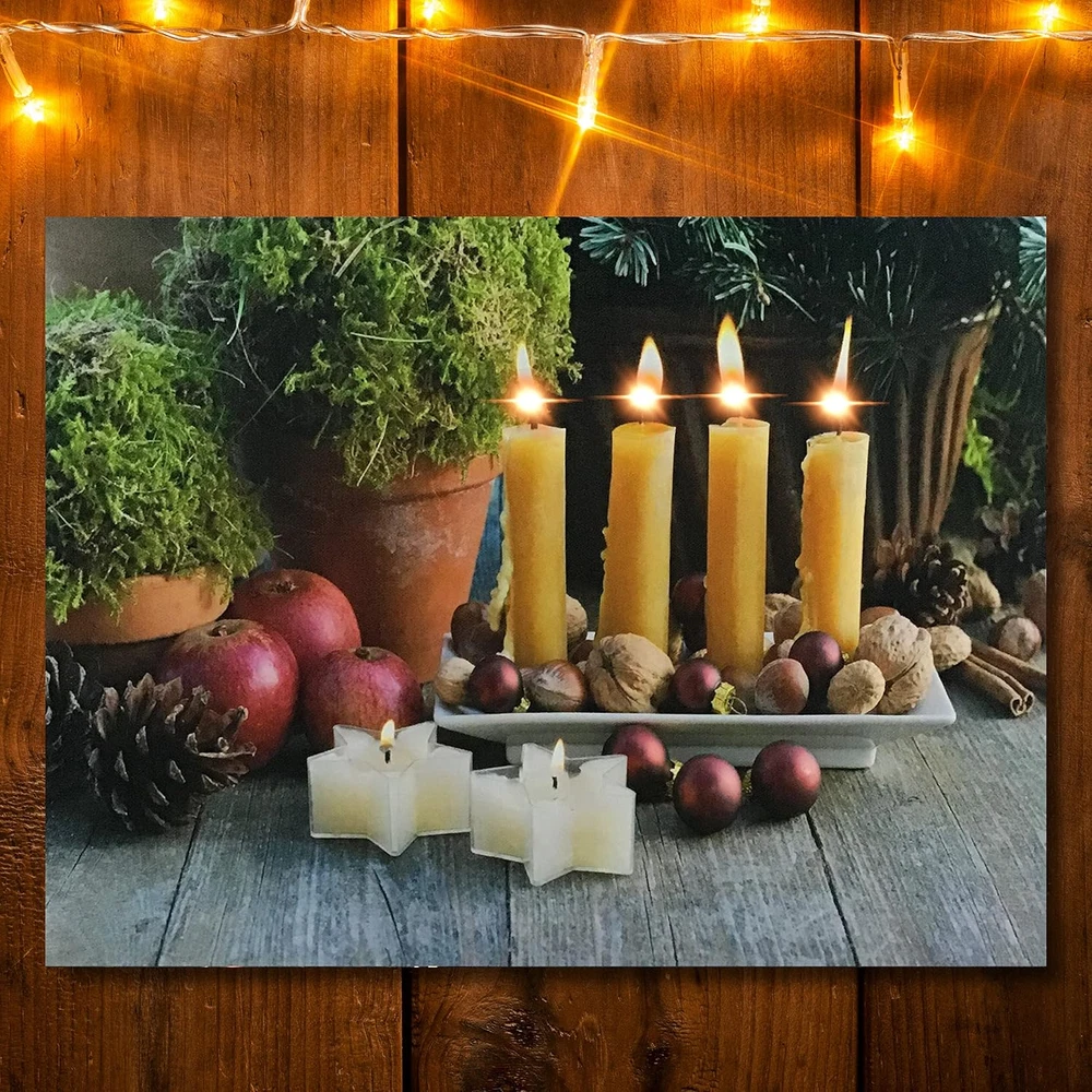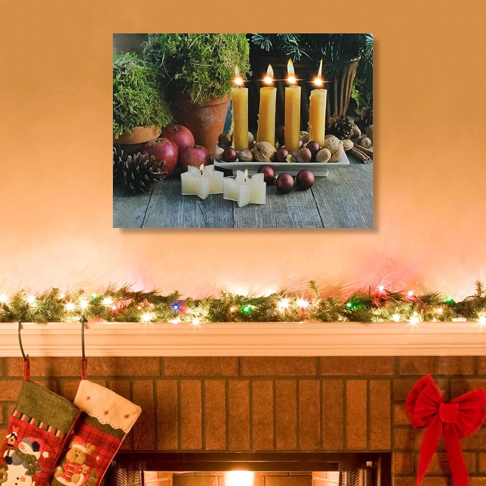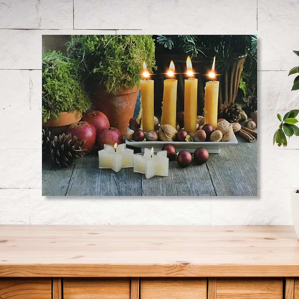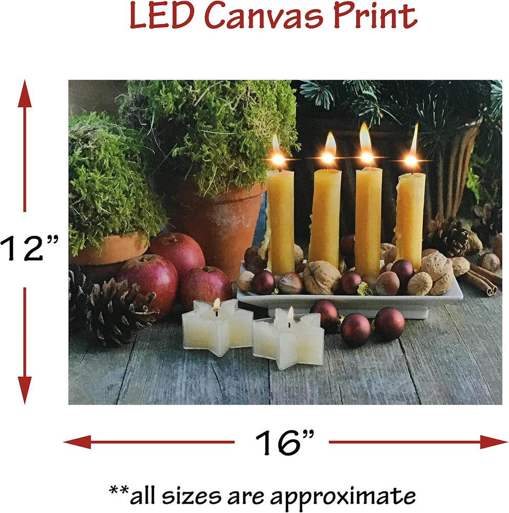 This gallery-wrapped canvas print is sure enhance any home décor. LED Lights that flicker like real candles are hidden inside to create the beautiful illusion of candlelight on the artwork. Hangs on the wall. Requires 2 AA batteries, not included. Measures 12" x 16" and is 3/4" thick Stunning Lighted Candles come to life with LED lights These liight up pictures from Banberry Designs are battery operated with an on/off switch on the side of each print. High resolution printing on premium artistic canvas. GALLERY STRETCHED CANVAS on a wood frame. MEASURES: 12" x 16" and is 3/4 Inch thick. Requires 2 AA Batteries (Not Included). On/Off Switch on side of frame Lighted candles canvas print is sure to enhance any home décor. LED Lights that flicker like real candles are hidden inside to create the beautiful illusion of candlelight on the artwork. Hangs on the wall. Requires 2 AA batteries, not included. Measures 12" x 16" and is 3/4" thick