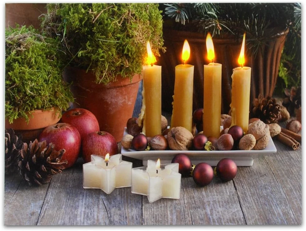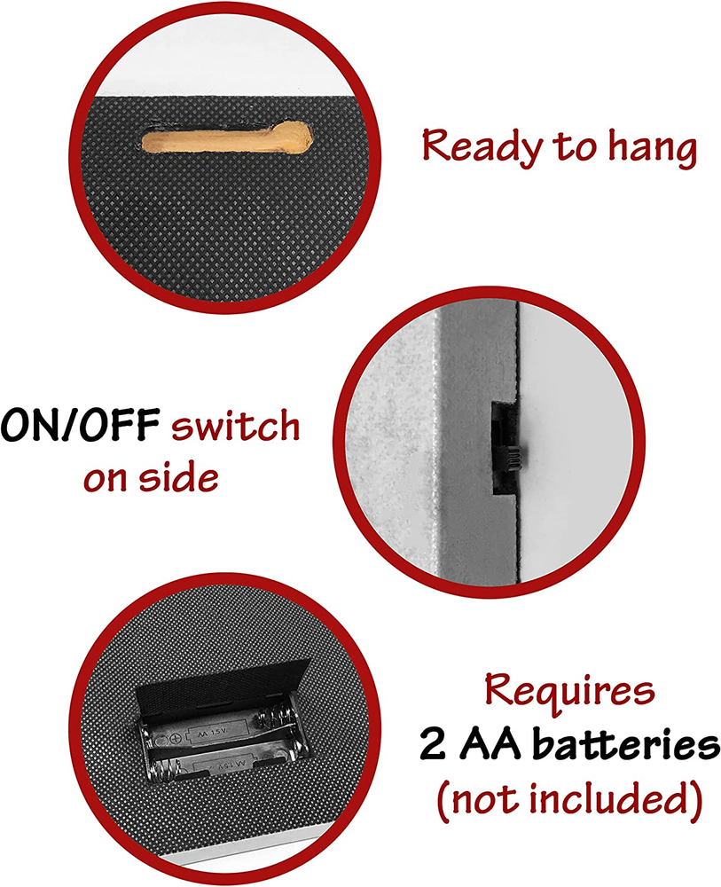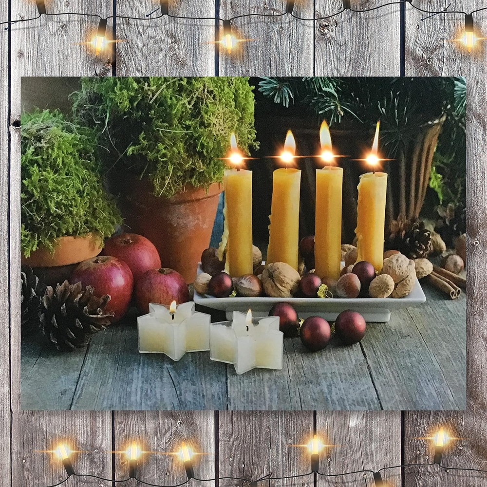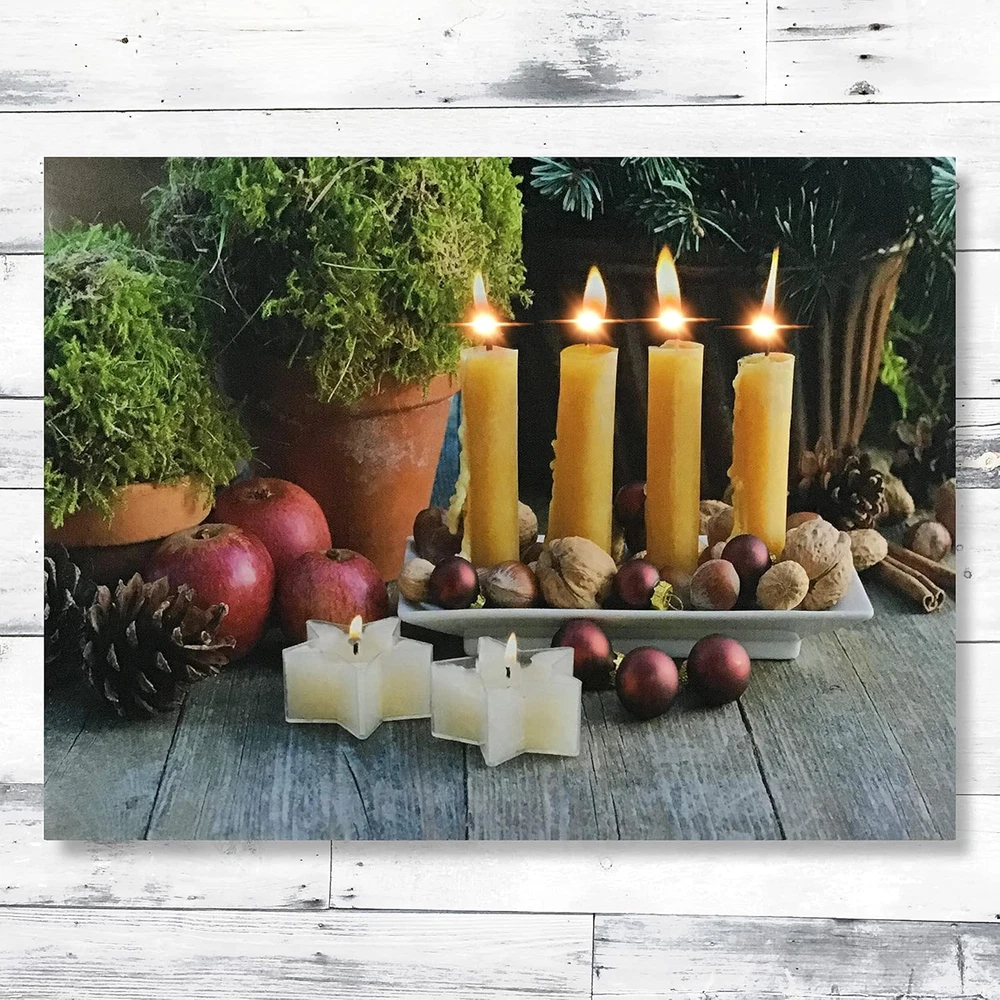 This gallery-wrapped canvas print is sure enhance any home décor. LED Lights that flicker like real candles are hidden inside to create the beautiful illusion of candlelight on the artwork. Hangs on the wall. Requires 2 AA batteries, not included. Measures 12" x 16" and is 3/4" thick Stunning Lighted Candles come to life with LED lights These liight up pictures from Banberry Designs are battery operated with an on/off switch on the side of each print. High resolution printing on premium artistic canvas. GALLERY STRETCHED CANVAS on a wood frame. MEASURES: 12" x 16" and is 3/4 Inch thick. Requires 2 AA Batteries (Not Included). On/Off Switch on side of frame Lighted candles canvas print is sure to enhance any home décor. LED Lights that flicker like real candles are hidden inside to create the beautiful illusion of candlelight on the artwork. Hangs on the wall. Requires 2 AA batteries, not included. Measures 12" x 16" and is 3/4" thick