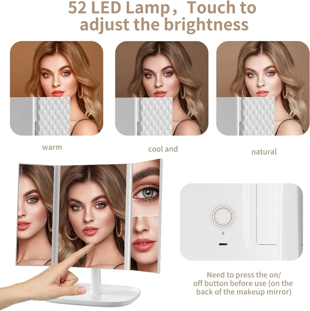 Dual Power Supply Makeup mirror with light is powered by USB charging cable or 4 AAA batteries; USB cable included, charger and batteries not included. High quality UV coating is used to make the mirror shiny and smooth, thus preventing surface scratches, fingerprints and oil stains. 360 Degree Swivel and Tri-Fold The dresser mirror can be adjusted up and down 360 degrees and then fixed to ensure a perfect and comfortable viewing angle. The foldable design saves valuable dresser space, and the folded mirror decorates your dresser with a delicate leather texture. 1X/2X/3X Magnification HD Mirror Illuminated makeup mirror has 3 panels for magnification and wide angle viewing; see your face clearly for a flawless makeup look, perfect for desktop makeup and handheld use. The illuminated makeup mirror offers a wide angle view, creating an ultra clear view of your skin. About this item Abs 52 LED & 3Color Lighting Modes- The makeup mirror brightness can be adjusted by touching the sensor switch. On/off button on the back of the mirror. Very suitable for use in dimly lit areas. The light is natural and soft, bright but not dazzling, protecting your eyes. The base recess can hold Jewelery cosmetics, watch, earrings, bracelets, etc.to meet our daily needs. 1X/2X/3X Magnification HD Mirror - Illuminated makeup mirror has 3 panels for magnification and wide angle viewing; see your face clearly for a flawless makeup look, perfect for desktop makeup and handheld use. The illuminated makeup mirror offers a wide angle view, creating an ultra clear view of your skin, making your outfit easier and perfect, perfect for applying eyeliner, mascara, grooming eyebrows and trimming. Dual Power Supply - Makeup mirror with light is powered by USB charging cable or 4 AAA batteries; USB cable included, charger and batteries not included. High quality UV coating is used to make the mirror shiny and smooth, thus preventing surface scratches, fingerprints and oil stains. This compact mirror with light is not only great for your bedroom but also makes a great travel lighted mirror for your daily out and about. 360 Degree Swivel and Tri-Fold - The dresser mirror can be adjusted up and down 360 degrees and then fixed to ensure a perfect and comfortable viewing angle. The foldable design saves valuable dresser space, and the folded mirror decorates your dresser with a delicate leather texture. Perfect gift for women - Birthday gift, Valentine's Day gift, Mother's Day gift, Christmas gift for teenage girl, family, wife or girlfriend, or other special day gift. This compact mirror with light is not only suitable for your bedroom, but also a perfect travel lighted mirror for your daily outings. Thanks to the detachable design, it can be easily carried everywhere.