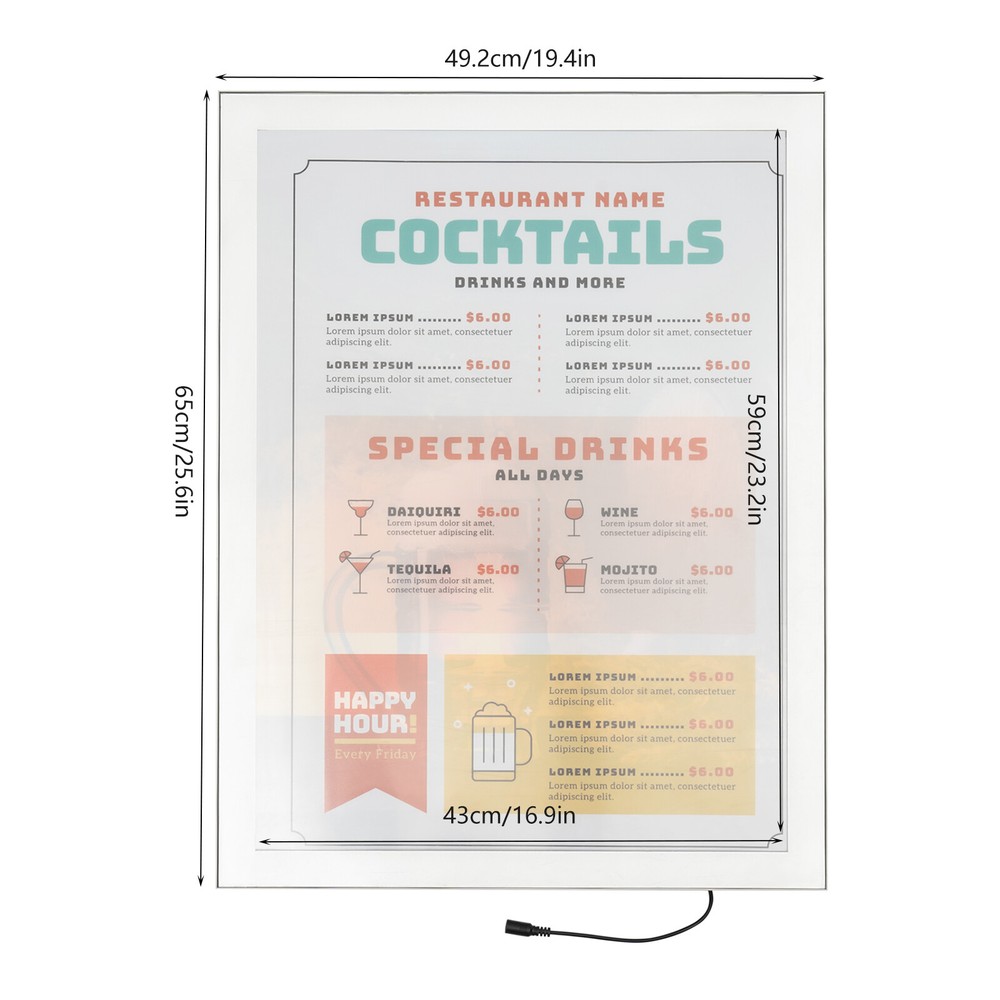 Specification Color: Silver Theme: Movie Style: Modern Shape: Rectangular Assembly Required: Yes Target Audience: Unisex Adult Material: Acrylic, Aluminum Alloy, PVC Process: High-Temperature Baking Paint, Spraying Mount Type: Wall Mount, Vertical, Horizontal Frame Type: Poster Frame, Magnetic Frame Power Cord Length: 1.2m/3.9ft Applicable Poster Size: A2 Plug Type: US Standard Power Source: Corded Electric Light Source: LED SMD Beads ( Included ) Power Consumption: 12W Color Temperature: 9000-10000K CRI: >85 Efficiency: E Adapter Model: JCH-1230 Input: AC 100-240V, 50/60Hz, 1A Output: 12V, 3A Product Thickness: 18mm/0.71 in Outer Frame Size(L*W): 65*49.2 cm/ 25.6*19.4 in Inner Frame Size(L*W): 59*43cm/23.2*16.9 in Package Size: 70*50*6cm/27.56*19.69*2.36 in LED Movie Poster Frame LED Light Box Wall Mount Photo Menu Display Sign Holder Led Movie Poster Frame Led Light Box Wall Mount Photo Menu Display Sign Holder Description Our Led Poster Frame Is Ideal for Commercial Promotion and Attracting Attention. Its Gorgeous Artistic Effects Help You to Deliver Eye-catching Promotional Messages and Thus Get More Footfall to Your Shopping Mall or Event. It Is Made of High-quality Materials and Has High Brightness, Which Would Be Ideal for Replacing a Regular Chalkboard Display Board! Key Features Build to Last: High-quality Acrylic, Aluminum Alloy, Pvc, High-temperature Paint Baking Process, and Spraying Technology Make the Item Durable and Solid, with Good Wear Resistance , Corrosion Resistance , and Resistance to Deformation, It Can Better Keep Beautiful and Practical Without Frequent Replacement. Energy Saving: High-quality Energy-saving Led Lights Are up to 85% More Energy Efficient than Halogen Lights. the Low Energy Consumption(18w) Makes It Consume less Electricity but Has a High Brightness Output That Can save You Money on Your Electricity Bill. Powerful Tool: This Eye-catching Led Poster Frame Lights up Your Pictures, Photos, Posters, Marketing Advertisements, Promotional Activities, Important Information, Etc. like a Neon Sign and Attracts the Attention of Customers/Viewers Day and Night, so Your Shop Will Have More Traffic. It Also Adds a Unique Vibe to Your Bedroom, Thus Showing Your Elegant Life Attitude to Everyone. Large and Bright: the Large Size( 23.2*16.9in ) Can Bring You a Wide Visual Experience. the Led Light Source with High Color Rendering (>85) and 9000-10000k Color Temperature and the Nanocrystal Light Guide Plate with Uniform Brightness Make This Product Deliver a Bright and Evenly-distributed Illumination Across the Entire Frame Surface, Ensuring a Shadow-free and Spots-free View of Your Movie Poster. Adjustable Brightness: You Can Use the Equipped Dimmer Switch to Steplessly Adjust the Brightness You Want According to the Usage Environment so That the Whole Display Can Be Bright and Not Harsh. Magnet Adsorption Design: the Magnet-absorption Design Allows You to Easily Pull out the Panel with the Equipped Suction Cup, Making It Effortless to Install/Disassemble and Replace Posters. Beautiful Appearance: the Simple Rectangular Structure and Stylish Silver Frame Give the Product a Unique Sense of Modernity and Design, Which Is an Attractive Decoration. Simple Installation: Its Simple Structure, Thin Frame(0.71inch), and Hanging Hooks Allow You to Vertically or Horizontally Install This Product on the Wall with Screws. Ideal Gift: with a Stylish Appearance and Practical Functions, This Item Is an Excellent Gift for Your Family, Friends, and Loved Ones Who Want to Make an Exhibition, Advertisement, or Decoration. Customer Service : We Are Honored That You Have Chosen Our Product. We Have Sufficient Confidence in the Quality of the Product so That You Can Buy It Confidently. but If You Have Any Questions, You Can Contact Our Customer Service, He Will Patiently Answer and Solve Your Problems. Details Long Power Cord: It Comes with a 3.94ft Long Power Cord for Added Convenience and Mobility. Acrylic Cover: It Ensures the Uniform Distribution of Light and Allows for Clear Visibility of Printed Materials and Posters, As Well As Protects Artwork from Dust and Direct Light to some Extent. Application This Product Is Very Suitable for Movie Theaters, Promotions, Retail Stores, Restaurants, Art Displays, Trade Shows, Banks, Hospitals, Libraries, Counters, Offices, Companies, Bars, Menu Boards, Jewelry Stores, Hotels, Studio s, Milk Tea Stores, Cafes, Shopping Centers, Metro Stations, Airports, Train Stations, Storefronts, and Other Household and Commercial Indoor or Outdoor Areas for Exhibition/Advertising/Decoration. Steps to Replace the Poster Pull out the Panel with the Equipped Suction Cup, Remove the Old Poster Fit Your Image and Close the Cover. Specification Color: Silver Theme: Movie Style: Modern Shape: Rectangular Assembly Required: Yes Target Audience: Unisex Adult Material: Acrylic, Aluminum Alloy, Pvc Process: High-temperature Baking Paint, Spraying Mount Type: Wall Mount, Vertical, Horizontal Frame Type: Poster Frame, Magnetic Frame Power Cord Length: 1.2m/3.9ft Applicable Poster Size: A2 Plug Type: Us Standard Power Source: Corded Electric Light Source: Led Smd Beads ( Included ) Power Consumption: 12w Color Temperature: 9000-10000k Cri: >85 Efficiency: E Adapter Model: Jch-1230 Input: Ac 100-240v, 50/60hz, 1a Output: 12v, 3a Product Thickness: 18mm/0.71 in Outer Frame Size(L*W): 65*49.2 Cm/ 25.6*19.4 in Inner Frame Size(L*W): 59*43cm/23.2*16.9 in Package Size: 70*50*6cm/27.56* 19.69*2.36 in Gross Weight: 2.5kg/ 5.51 Lbs Net Weight: 2kg/ 4.41 Lbs Package Included 1* Led Poster Frame 1* Adapter 1* Dimmer Switch 2* Sample Posters 1* Power Cord 1* Suction Cup Notes Please Do Not Have Important Content Within at Least 10mm of the Edge of the Screen. Please Tear off the Protective Film Before Using It. Please Allow the Slight Color Difference Caused by the Shooting Light and the 1-3 Cm Error Due to Manual Measurement, and Make Sure You Do Not Mind Before Ordering. Payment 
