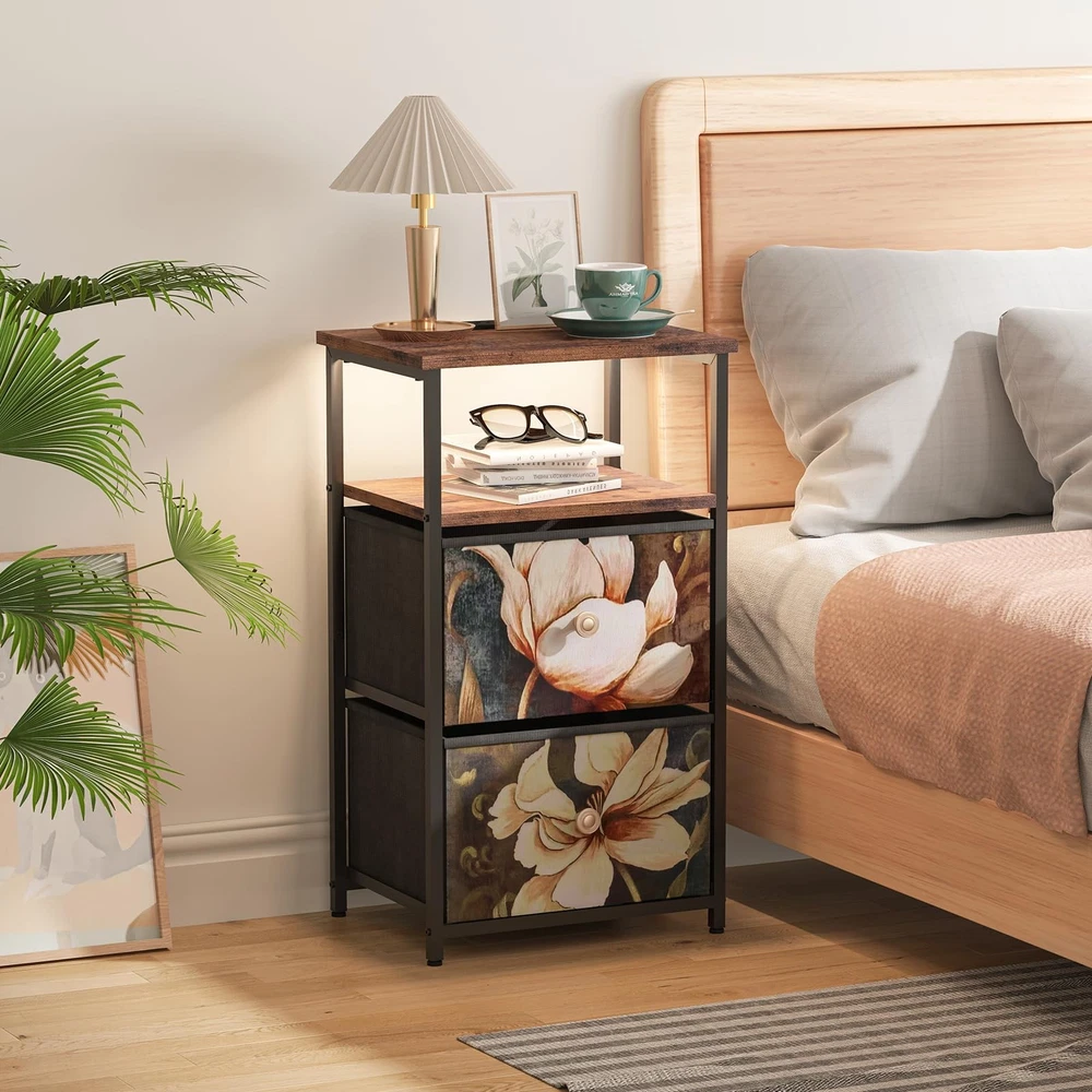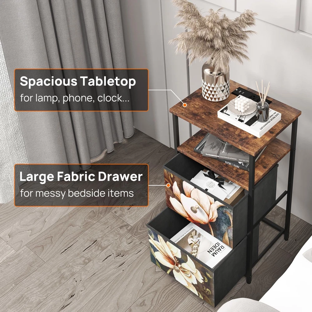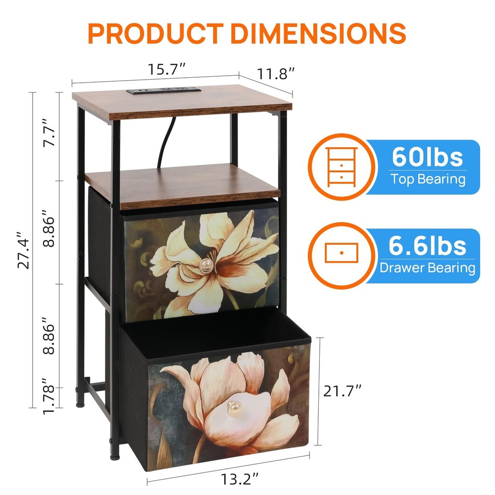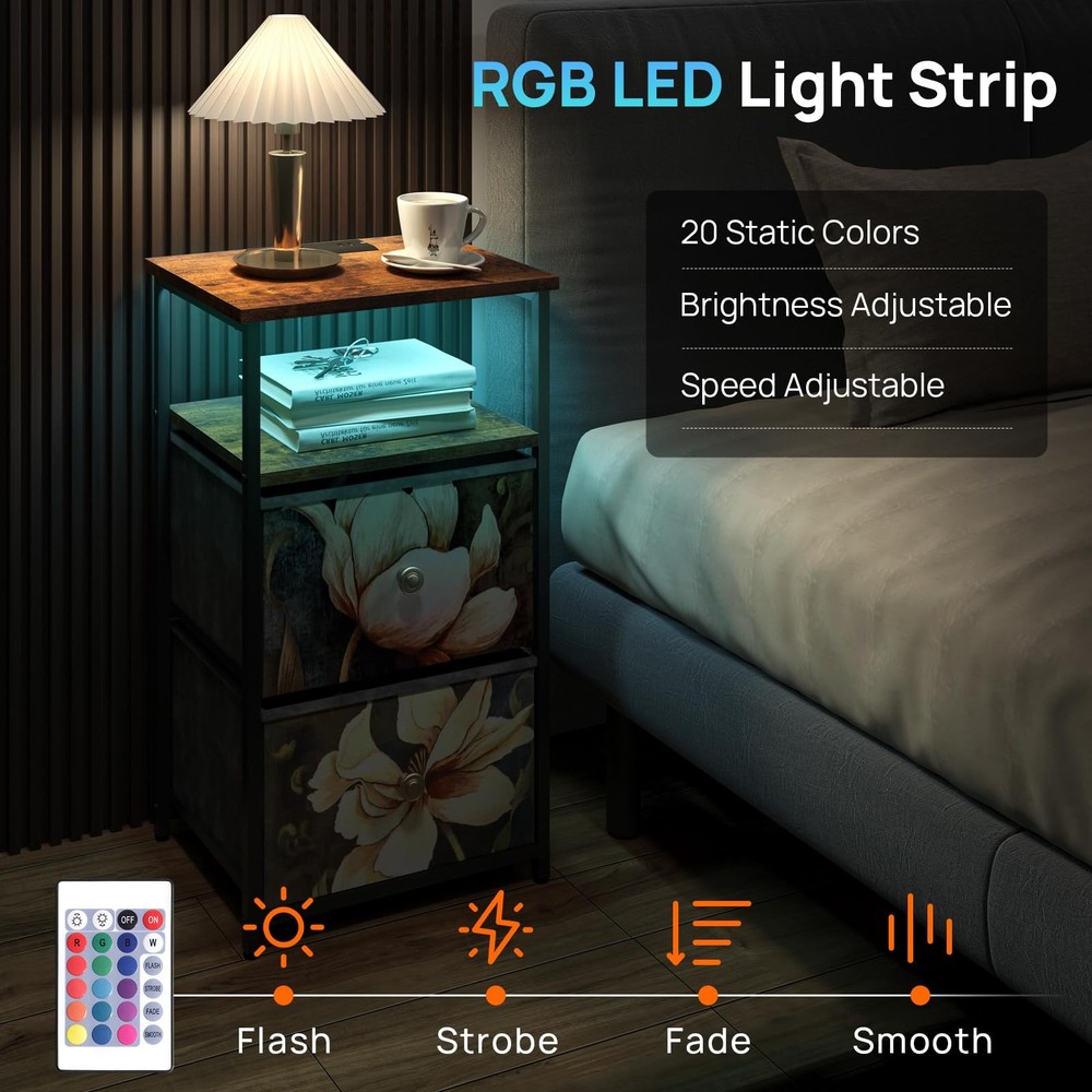 βοΈγππππππ&πππππππ ππππππππγThe retro-style bedside table with drawers is made of high-quality materials, blending non-woven fabric and black metal frame to create an elegant atmosphere in your home while ensuring longevity and reliability for daily use. Wearing adjustable feet will protect your floor from scratches and ensure stability on uneven surfaces. πγππππππππππ πππππππ πππππγOpen shelves can hold books, game consoles, tape recorders, and more. Two fold-out fabric drawers with handles and provide ample space to store bedside items. Each fabric drawer offers generous storage space, perfect for keys, toys, socks, underwear and other accessories. β‘γπππππ πππππ ππππ πππππππ πππππππγThe nightstand adds 2 AC outlets and 2 USB ports along with a 4.7-foot power cord to provide more charging points for bedtime, allowing you to simultaneously charge your desk lamp, cell phone, Bluetooth headphones, watch, iPad, and more. Well-placed sockets also prevent cable clutter when charging multiple devices. πγππ ππππππ πππ πππππππ πππππγThe bedside table features charming colorful RGB LED light strips that emit a soft glow, perfect for bedroom environments. Use the remote control to adjust 20 color brightness modes and speed levels. The bed side table/night stand also doubles as a night light, helping you conquer your fear of the dark. π€΅π»γππππ ππ ππππππππγEnd table dimensions: 15.7" L x 11.8" W x 27.4" H. All tools and accessories are included in the package and you can follow the instructions to assemble the bedside table in 15 minutes. The small wooden dresser does not take up much space, you can use it as a bedside table in the bedroom, a convenient coffee table next to the sofa.