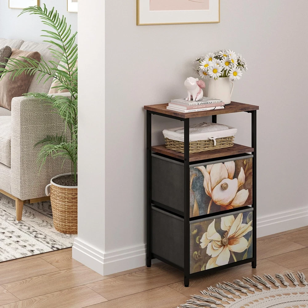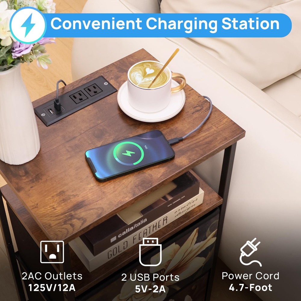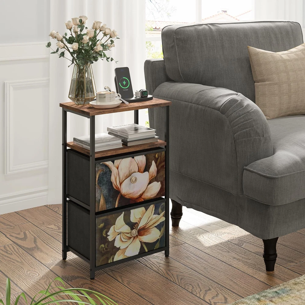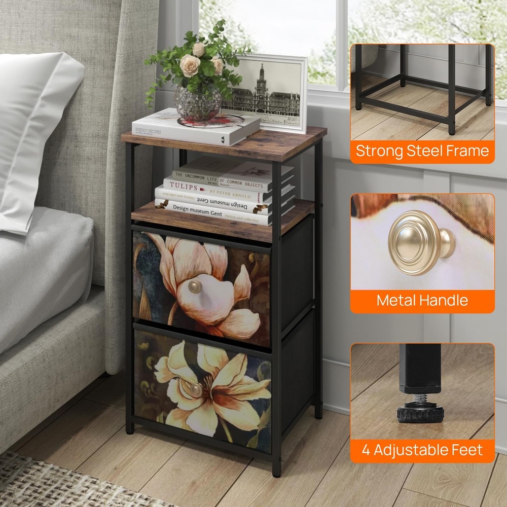 βοΈγππππππ&πππππππ ππππππππγThe retro-style bedside table with drawers is made of high-quality materials, blending non-woven fabric and black metal frame to create an elegant atmosphere in your home while ensuring longevity and reliability for daily use. Wearing adjustable feet will protect your floor from scratches and ensure stability on uneven surfaces. πγππππππππππ πππππππ πππππγOpen shelves can hold books, game consoles, tape recorders, and more. Two fold-out fabric drawers with handles and provide ample space to store bedside items. Each fabric drawer offers generous storage space, perfect for keys, toys, socks, underwear and other accessories. β‘γπππππ πππππ ππππ πππππππ πππππππγThe nightstand adds 2 AC outlets and 2 USB ports along with a 4.7-foot power cord to provide more charging points for bedtime, allowing you to simultaneously charge your desk lamp, cell phone, Bluetooth headphones, watch, iPad, and more. Well-placed sockets also prevent cable clutter when charging multiple devices. πγππ ππππππ πππ πππππππ πππππγThe bedside table features charming colorful RGB LED light strips that emit a soft glow, perfect for bedroom environments. Use the remote control to adjust 20 color brightness modes and speed levels. The bed side table/night stand also doubles as a night light, helping you conquer your fear of the dark. π€΅π»γππππ ππ ππππππππγEnd table dimensions: 15.7" L x 11.8" W x 27.4" H. All tools and accessories are included in the package and you can follow the instructions to assemble the bedside table in 15 minutes. The small wooden dresser does not take up much space, you can use it as a bedside table in the bedroom, a convenient coffee table next to the sofa.