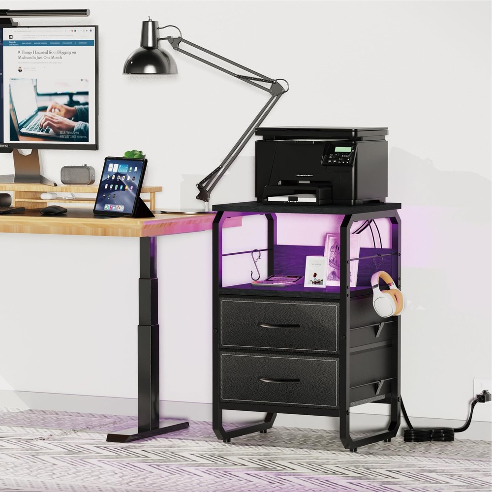 This Nightstand with Charging ports is a quick and simple way to update your home!Our nightstand with charging station has four colors and style to choose, Placed on your bedside, put on a little warm lamp, read a book before sleep, what a wonderful moment. Use our bedside table, get a blissful sleep.Multifunctional end table:Charging Station: 2 power outlets and 3 USB ports are enough to charge your phone, lamps, and smart speaker.Long power supply cord: 6.6ft long power supply cord support allows you to place your end table in most placesTight and stable structure: The reinforced metal frame and high-quality MDF board offer a large weight capacity. The top shelf can hold up to 100lbs.Large drawer with storage space: This nightstand has large drawer and 2 wooden shelves, the large storage space can meet all your demand.All the necessary accessories are together with our package.This night stand is great for bedroom, living room, entryway, etc Charging is a Breeze: With a built-in outlet including 1 Type C port, 2 AC outlets, and 2 USB ports, daily charging need would be satisfied. It adapts to phone, tablet, laptop, and more electronics Enjoy a Light Show: Light with 20+ RGB colors and 20+ dynamic modes would be a surprising bonus for your home setting. Freely adjust the brightness and color temperature by using the APP or the remote control. Create your best light show with this mesmerizing LED night table! Storage Helper: 2 fabric drawers offer sufficient storage space for your essentials or clothes. Keep tidy in your bedroom, living room, home office, closet, or dorm with this fabulous bed side table Explore Vertical Storage: Extra bars were added on the table side, and 2 hooks are provided for hanging keys or headphone. Build up a vertical storage space by hanging more stuff on the flank area of the night table Quality & Service Commitment: The fabric drawers of nightstand with an extra hard bottom can load up to 15 lbs. Thick wooden board and metal tube make a sturdy LED night stand. Assembly would be super easy with clear instructions and handy tools. Feel free to contact us if you need extra support, we will reach you within 24 hours