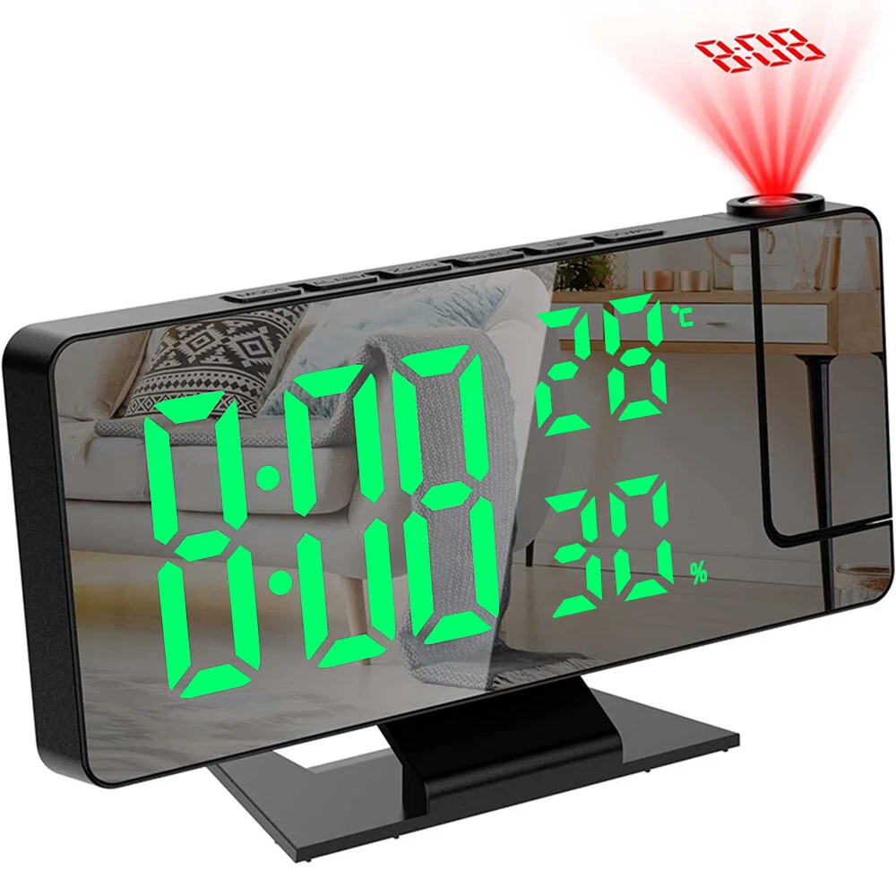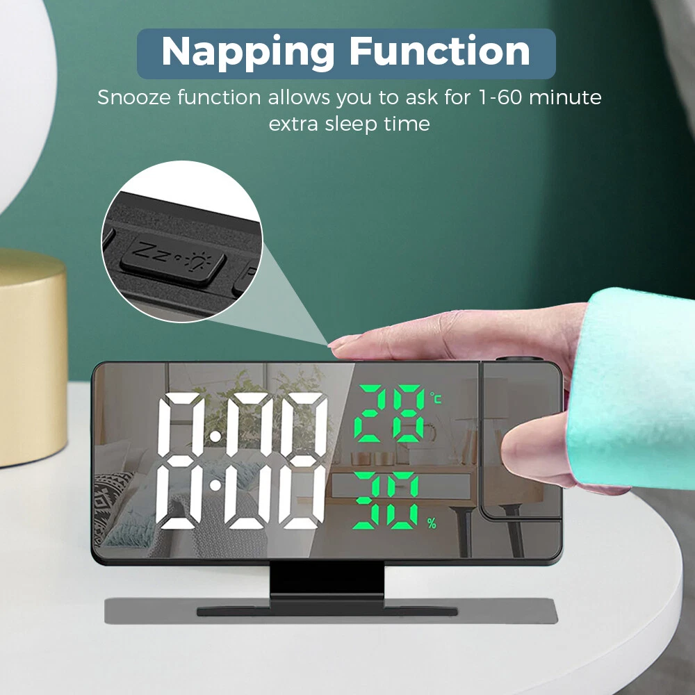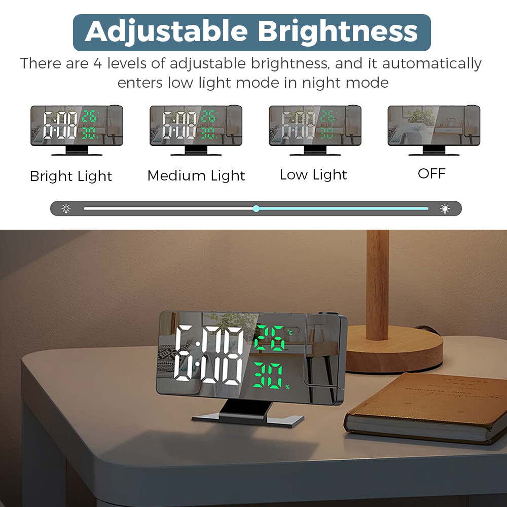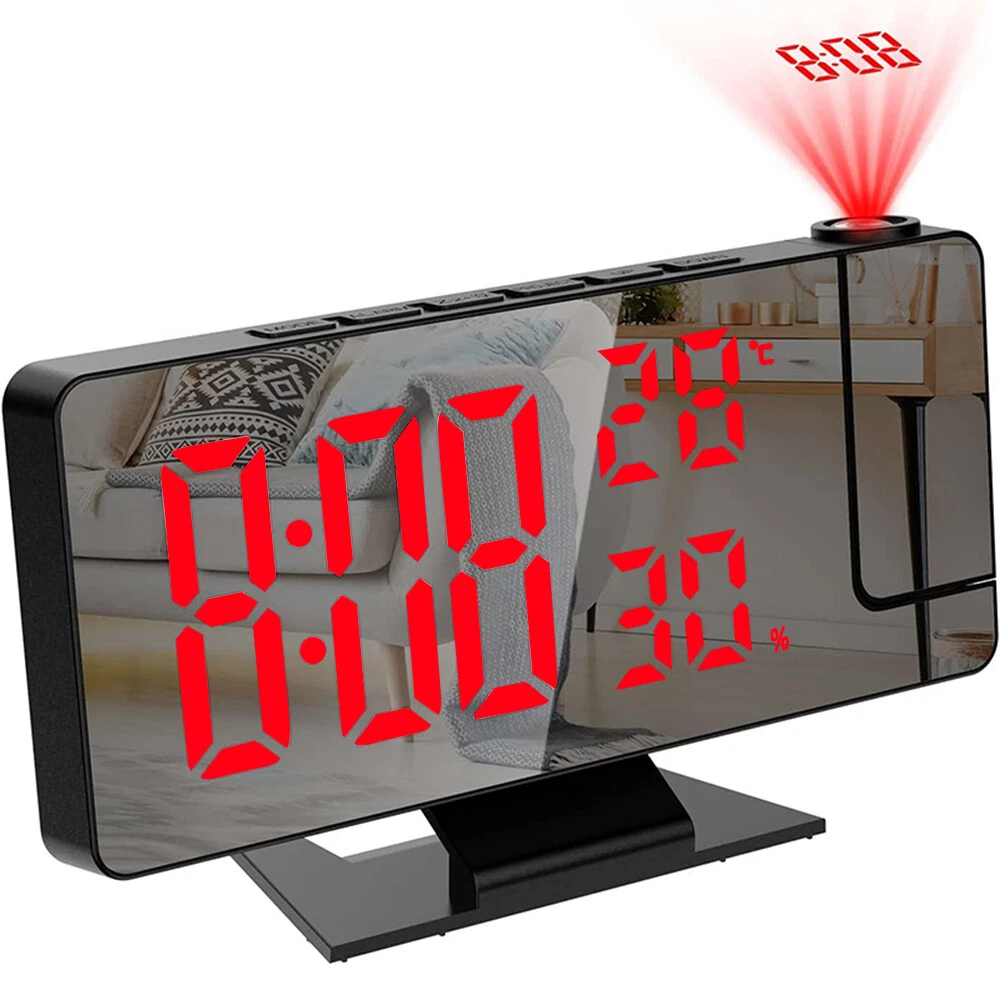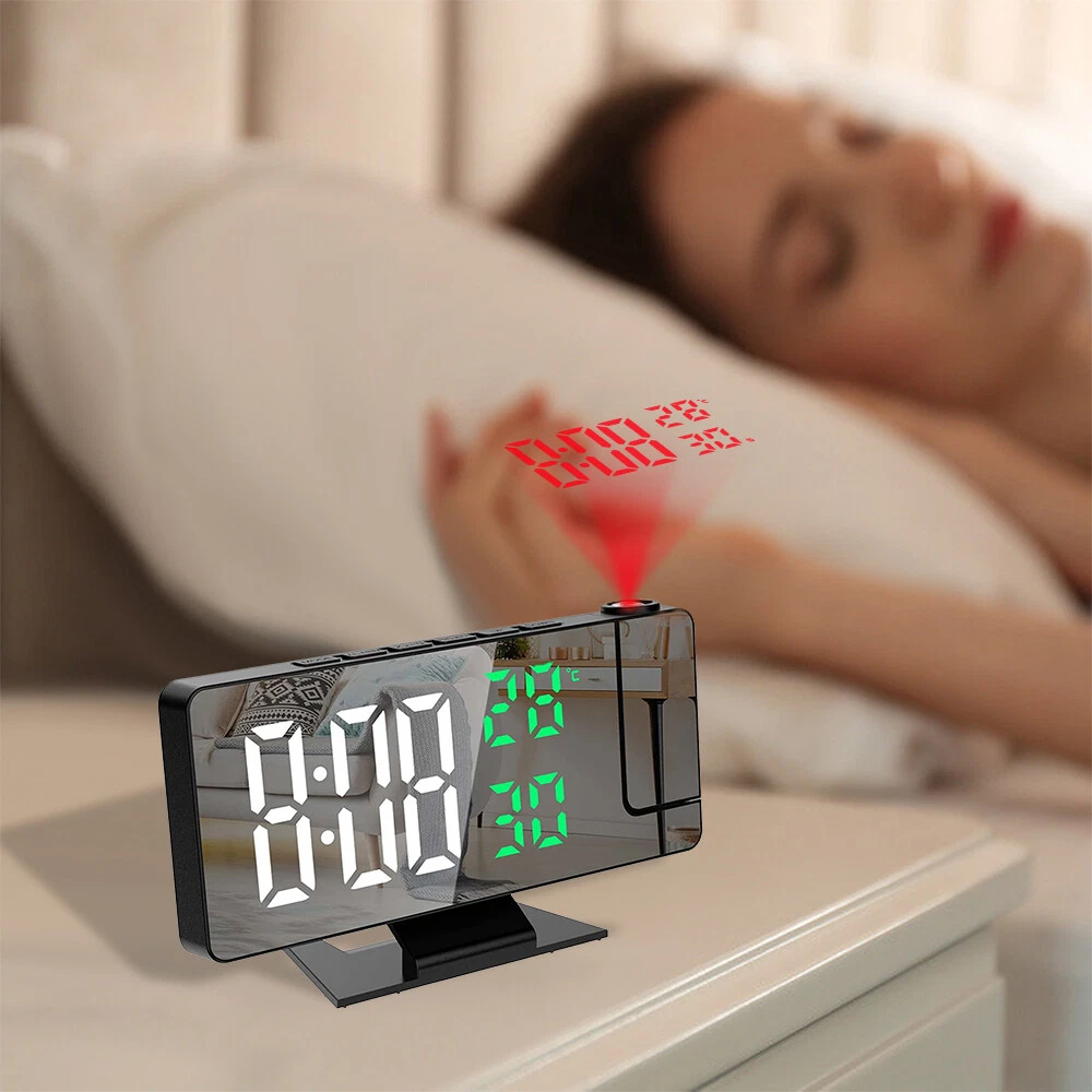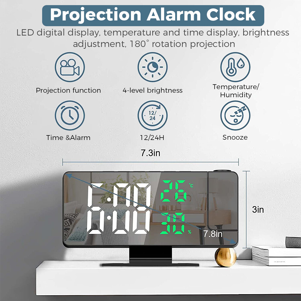 Features: 1.180° Projection Alarm Clock: This adjustable 180° projection clock can project ultra-clear time onto the ceiling or wall at a distance range of 2-5 meters, and is equipped with 2 adjustable projection brightness. When you're in bed, you don't need to touch anything to keep track of your time. 2. USB charging port and memory function: This large 7.8-inch LED digital clock includes a 5V/1A USB output port, which can charge mobile phones, tablets and other electronic devices while charging the LED alarm clock. In addition, the projection alarm clock has a built-in battery backup to remember the time setting even in the event of a power outage. 3. Adjustable brightness and night mode: There are 4 levels of adjustable brightness to meet your requirements. You can adjust the brightness or set the clock in night mode. In night mode, it automatically goes into low light from 18:00 to 5:59 in the evening by default. 4. Snooze function with alarm clock: The projection alarm clock has an alarm clock function with three modes, which can meet all your needs - Monday to Saturday/Monday to Sunday/Monday to Friday. The projection clock has a snooze function. Just press the "Sleep" button and you can get 5~60 minutes of extra sleep or press any other key to cancel the alarm. 5. Simple operation and wide range of applications: Our LED digital alarm clock has a unique design, temperature and humidity with the same screen display, 12/24H, date function, USB charging port and modern design and other updated functions, which is a perfect gift for family, friends and children. Specification: Product Name: LED Mirror Projection Alarm Clock Product size: 18.5x5.5x10.2CM Time display with 4 levels of brightness adjustment: high, medium, low, and off. Manually adjustable Projection Level 3 Brightness Adjustment: High Brightness Low Brightness Off Temperature display: -10°C~50°C(14°F~122 °C); Error: ±1°C Humidity display: 20%~95%, error: +5% Snooze function: adjustable for 5-60 minutes Packing List: 1x clock projector 1x USB cable 1x base 1x User Manual Note: 1. The LED screen is always on when using the USB cable plug that is not included 2. The built-in CR2032 battery is mainly a memory function, and there is no need to reset the time if the power goes out 3. This projection alarm clock must be plugged in and the LED screen will be on all the time. 4. USB cable included, 59 inches in length, but plug not included. 5. The indicator alarm clock can only be displayed towards the back of the alarm clock, if it is forward, the number will be reversed