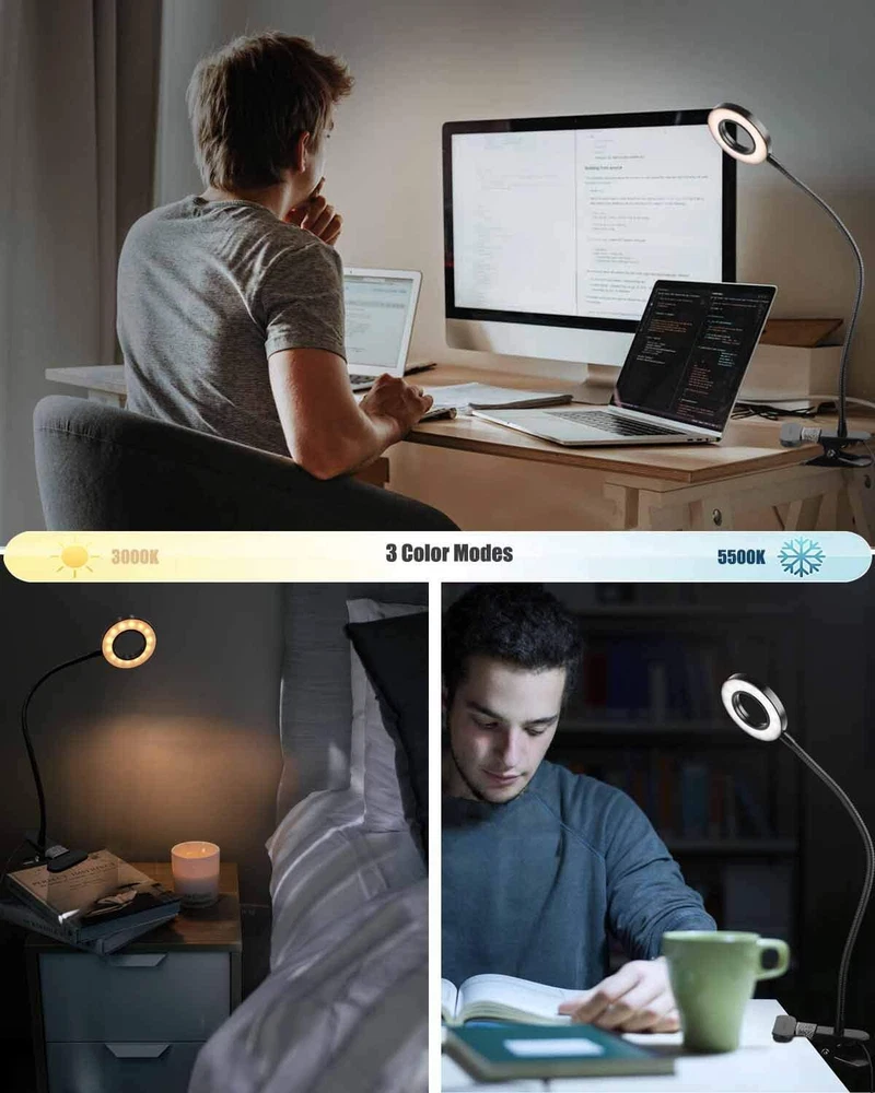 Eye Protection Soft, comfortable and non-flickering design, the lighting is friendly to your eyes and reduces eye fatigue, so you can enjoy what you're doing for longer. Choose Your Mode 3 lighting modes for you to choose: warm light, white light, and cool light. And 9 brightness levels you can adjust: dim and bright. 360° Flexible Gooseneck The 360° flexible gooseneck allows you to easily adjust the light to perfect angles as needed. Multiple Uses With sturdy clamp, so it can be used anywhere, such as computer desk, bed headboard, shelf. Specifications Wattage: 7W Body Material: ABS plastic & Aluminum Alloy LED Color: Warm white, Natural white, Cool white USB Charging Port: 5V/2A Color Temperature: 3000K ~ 6500K Neck Length: 15.6inch/40cm LED Panel:6.3*2.7inch/16*7cm USB chrage cable: 5.25ft/160cm Clamp Width :2.4inch Operating Temperature: -10℃ ~ 50℃ Net Weight: 15.2 ounces Certification: CE RoHS Package Content: 1 x Clamp Light 1 x Power Adapter 1 x User Manual Seller Warranty Lifetime Support Guarantee, 100% LIFETIME MONEY BACK GUARANTEE 【3 Lighting Modes & 10 Brightness Levels】- Clip On Light built-in 24 LEDs (12 Cool LEDs, 12 Warm LEDs). 3 Lighting Modes, warm white, natural white, and cold white. Each mode has 10 adjustable brightness, variety of choices lets you create the most comfortable and perfect lighting mood 【High-grade Materials & USB Powered】- The desk lamp is made of high-grade materials to ensure better dissipation of heat and it won't get hot when working. The light came with a 1.6 m USB-powered cable and can be powered by any USB device 【Ring Design & Eye Protection 】-reading lights, have a larger light-emitting area, and better heat dissipation The reading light provides a soft Eye-Care lightning source, flicker-free, anti-glare light without ghosting to relieve eye fatigue 【Flexible Gooseneck & Strong Clamp】- The clamp lamp of a flexible gooseneck allows you to adjust the light to where you need it. The Strong metal clamp opens up to 2.4 inches and with Non-slip pads can be used perfectly with music stands, pianos, office tables, computer desks, and headboards 【Energy-saving】- The desk light only costs 20% more energy as an incandescent lamp does in the same brightness. No lead or mercury, No UV or IR Radiation. 5V, 2A ADAPTER INCLUDED