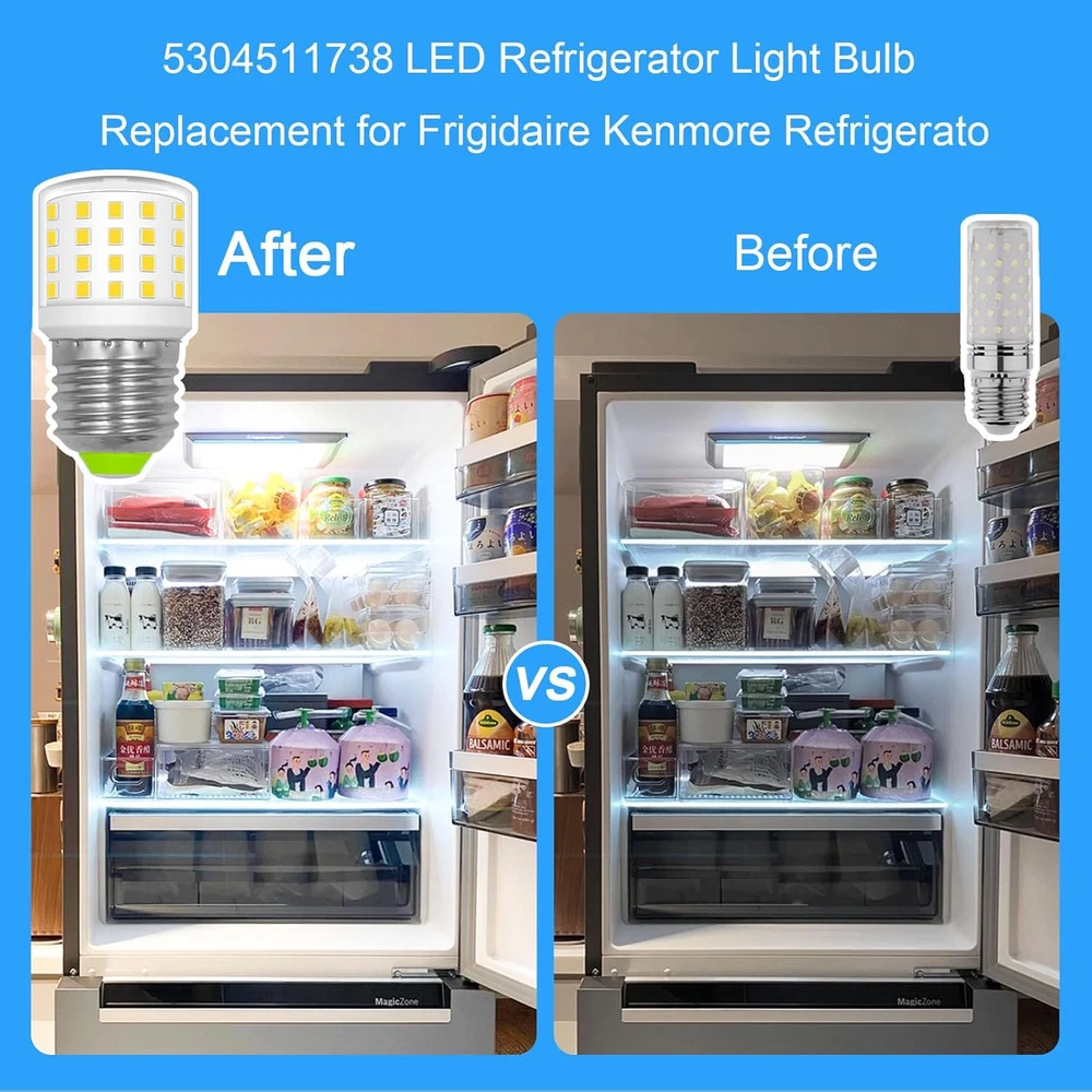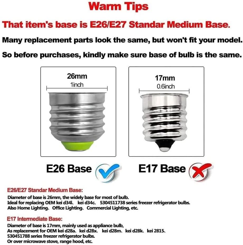 Store New Arrivals Add to Favorite View Feedback Contact LED Refrigerator Light Bulb 4W AC100-265V 3.5W Refrigerator Bulb, E26 Medium Base Compact Bright Lamp Compatible with Frig.Idairefridge Light Bulb Kei D34L Bulb, Daylight White 2 Pack Description Item model number RL2856C-E26 Light Source Type LED Number of Items 2 Beam angle 360 Degrees Country of Origin China Controller Type Push Button Item Shape Taper Unit Count 2.0 Count Light Source Wattage 4 Watts Model Number RL2856C-E26 Model Name RL2856C-E26 Package Dimensions 4.69 x 4.61 x 1.61 inches; 1.59 ounces White Brightness 600 Lumens Light Type LED Brightness 600 Lumen Material Type Plastic Light Color Daylight White Connectivity Technology Normal bulb Special Features Non Dimmable, 5304511738 Light Bulb, 4W=60W, 600lm, Kei D34l Refrigerator Bulb Special Feature Non Dimmable, 5304511738 Light Bulb, 4W=60W, 600lm, Kei D34l Refrigerator Bulb Light Source Operating Life 25000 Hours Bulb Base E26 Medium Color Temperature 5000 Kelvin Color Daylight White Wattage 4 watts Indoor Outdoor Usage Indoor Specific Uses For Product Indoor use only Voltage 120 Volts Control Method App Included Components NO Incandescent Equivalent Wattage 60 Watts ✅【600LM High Performance&Save Your Bills】 Each of the 3.5w refrigerator led bulbs give out 600lm brightness which equal to a 40W-60W incandescent light bulb performance. Save more than 90%+ electricity bills and work for more than 25000+ hours long lifespan. Hence no more troubles to exchange bulbs frequently for your freezers.5304511738 frigidaire light bulb energy saving and bright. 💡【Notice】:AC100-265v 3.5w refrigerator bulb LED Refrigerator Light Bulb is a manufacturer substitution. Part may differ in appearance but is a functional equivalent to prior parts. Be sure to disconnect the power to the Refrigerators before you begin this repair. 💡【Compatible with】: 5304511738 light bulb Used in countless home appliances, can replace the following part numbers PS12364857,AP6278388,4584444,PS11767930,4396822,4813672,W11216993,W11125625,W10820003,AP6329125,PS12349398,EAP12349398,W10565137,W10805744,W10837631,W10865849,W11043014,W11196500,W11216993,W11338583. Refrigerator light bulb works well in both kitchens and bathrooms, thanks to its small size, It is especially suited for fridges, freezers, and bedside lamps. 💡 【Kei D34l Refrigerator Bulb】 Compatible with many brands:Frigi-daire, Ken-more, Elect-rolux. Fit frigidaire models(not all) :KEI D34L KEID34L KEL3418L KEL3418 LFSS2612TF2 LFSS2612TF2 FFSS2315TS2 FFSS2615TE2 FFSS2615TS3 LFSS2612TF3 LFSS2612TF3 LFSS2612TP3 LFSS2612TP3 LFSS2612TE3 LFSS2612TE3 FFSS2615TP3 FFSS2615TP1 LFSS2612TE4 FFSS2625TS3 FFSS2615TE4 FFSS2615TE3 FFSS2315TP1 FFSS2315TP3 LFSS2612TF4 FFSS2615TP4 FFSS2615TS5 FFSS2615TD3 FFSS2615TD4 FFSS2315TE3 LFSS2312TF4 LFSS2312TP4 💡 【Light Bulb Model 】CRSE233TB0 CRSE233TS0 CRSE233TW0 CRSE263TB0 CRSE263TD0 CRSE263TS0 CRSE263TW0 FFSS2615TS2 FFSS2615TS2 FFSS2615TS1 FFSS2615TD2 LFSS2312TF1 FFSS2315TP4 FFSS2315TS5 LFSS2612TP5 FFSS2315TE4 FFSS2315TD4 FFHT1821TS2 FFSS2615TP2 FFSS2615TP2 FFSS2315TS1 FFSS2315TS3 LFSS2612TD1 LFSS2312TD1 LFSS2312TD2 FFSS2625TE1 FFSS2625TE3 FFSS2625TE2 LFSS2312TE LFSS2312TE LFSS2612TP2... ( Please feel free to contact with us if you are not sure this Light Bulb fits your model ) ✅【Worry-free After Sales】 We attach great importance to the quality of the appliance fridge bulb. We strive to provide great customer service and want to make sure you are completely satisfied. Please feel free to with Q&A or E-mail. Product Description Appliance Light Bulb 5304511738 E27 KEI D34L REFRIGERATOR BULB 5304511738 Appliance Light Bulb led refrigerator light bulb No flicker design,more soft,stable ligh. 5304511738 kei d34l refrigerator bulb using upgraded IC + led chips and durable material enhances the bulb’s safety.15,000h 10 times longer than ordinary incandescent 1000h .5304511738 fridge light bulbs solve the problems of dimmed, flickering, not bright lights. High Color Rendering Index(CRI≥85) -20℃-45℃. Durable IP20 Waterproof The video showcases the product in use. The video guides you through product setup. The video compares multiple products. The video shows the product being unpacked. ABOUT US We offer the best prices around on high quality products. Our E-store includes media such as books, movies, music and games while offering electronics, toys, sporting apparel, clothing, tools, general home, garden items and more. SHIPPING We are always working hard to ensure your package arrives as soon as possible. Please understand that some factors like weather, high postal traffic, and the performance of shipping companies are outside of our control. We offer free shipping to the lower 48 states and ship within 2 business days of payment, usually sooner. We do not accept P.O. Boxes. Please provide a physical address. For shipping outside of the continental USA, we only use eBay's Global Shipping Program.The item is shipped to KY and then sent to the rest of the world. International customers are responsible for all duties and taxes. Continue to check out in order to calculate costs for shipping the item to your country. Messages regarding eBay's Global Shipping Program MUST be directed at eBay EXCLUSIVELY. RETURNS We offer a 30-Day Return Policy on items which you are not completely satisfied with. You have the option for a full-refund or an exchange of the item. No returns are available on items shipped outside of the USA. PAYMENT We accept PayPal. CONTACT US This page content is yet to come Please ad us to your favorite seller and visit again later Thank You CUSTOMER SATISFACTION We try our very best to make sure every customer is completely satisfied. If there's a problem, message us! We're happy to help. WE ACCEPT Copyright © 2021 AutoDS. | All Rights Reserved
