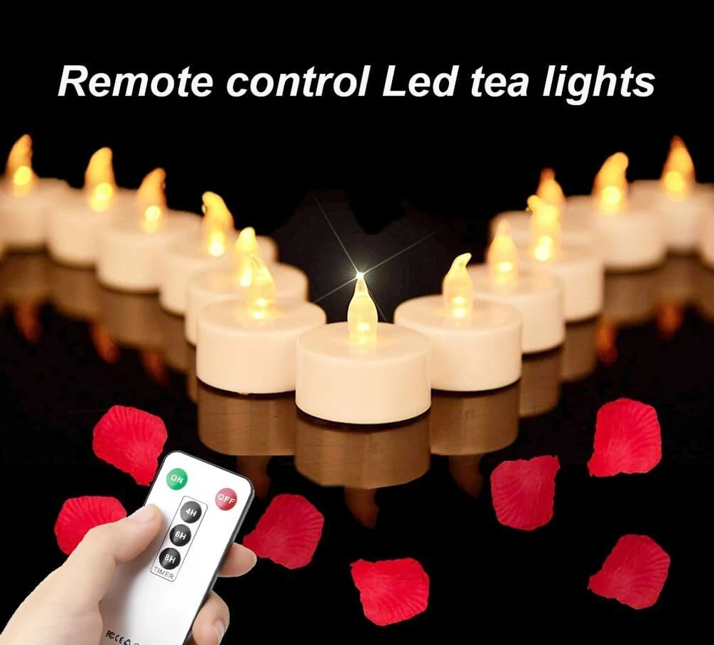 remote control tea lights ⭐With timer function: One click on or off, saving you more time and making it more convenient to use. The remote control can control a range of up to 8-10 feet.You no longer need to worry about putting the tea lights too high and causing trouble, nor do you need to manually turn them on or off one by one. With them, you will no longer choose tea lights without remote controls ⭐2450 High Capacity Battery: Each of these shared lights contains a CR2450 battery, which can last for up to 400+hours, 15 times longer than a regular burning tea light, ensuring that you continue to work throughout the entire holiday or event ⭐Ideal for holiday parties and home decor - These flameless tea lamp candles are perfect for creating a warm and romantic atmosphere and can be widely used for decorating weddings, holiday gifts, parties, birthdays, gardens, restaurants, Christmas, Valentine's Day, Halloween, Diwali, home decor, or other occasions ⭐Safe to Use - These bright and lifelike flameless tea candles have no fire hazards, no fire risk, no smoke, and no dripping wax. It won't burn and is perfect for enjoying romance with family, friends, and pets ⭐High-quality Tea lights: A package include 12tea lights candles and a remote control. We are been on safe and quality materials. To ensure great experience to user