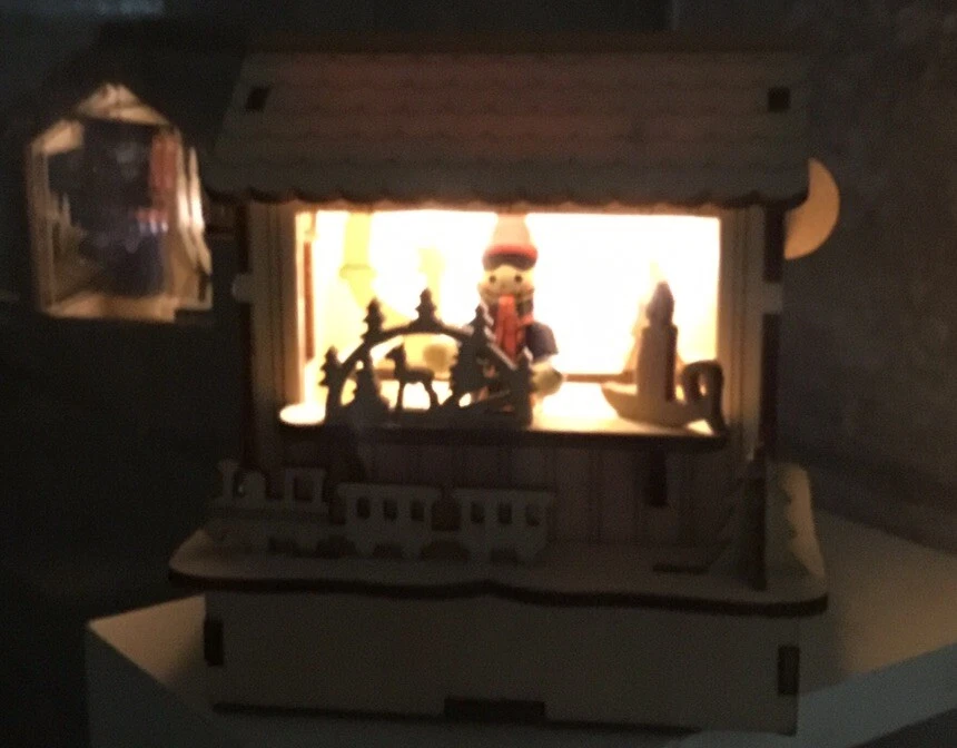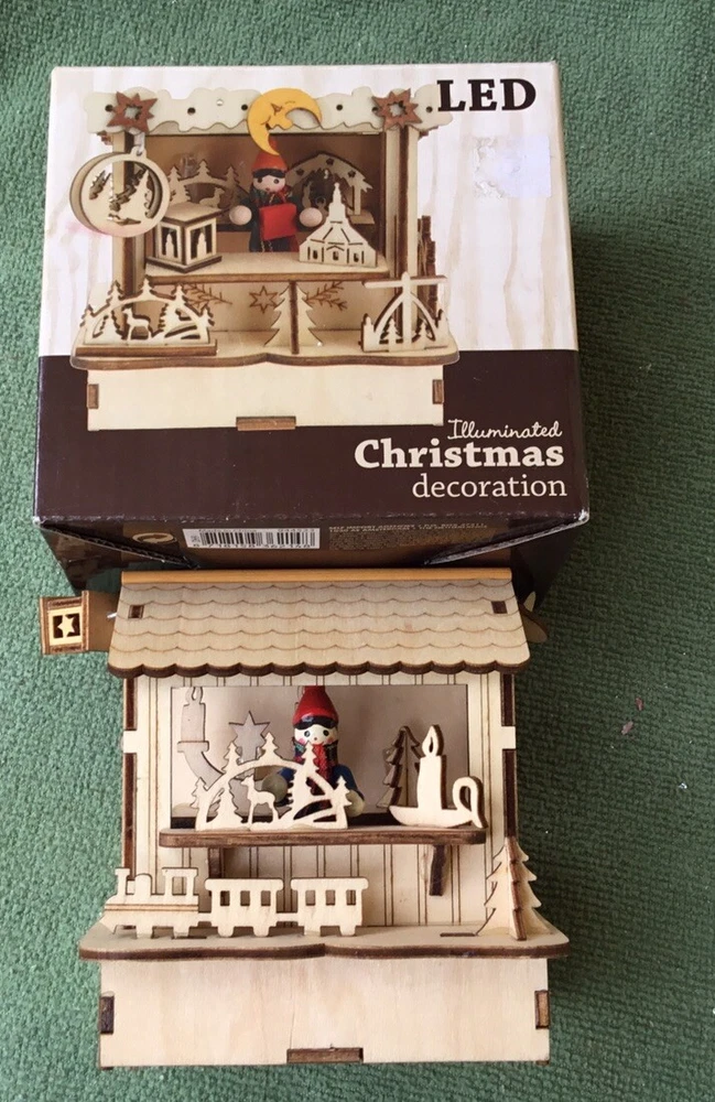 This New unused LED Wooden Cut Out Christmas Tabletop Decoration will have a Christmas Shop with a sales person attending the shop selling Christmas related items and toys. It will be battery operated and would made a nice desktop Holiday decoration. It will measure 5" tall x 4" wide x 3 3/4" deep. It will be made of high quality wood and has exquisite details.