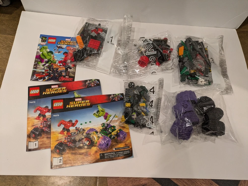 Unleash the power of the Avengers with the LEGO Marvel Super Heroes Hulk vs. Red Hulk set, model 76078. This action-packed set features the iconic clash between two of Marvel's mightiest figures, set against a backdrop of vivid, multicolor scenery. Whether you're recreating epic battles or displaying your superhero collection, this set is a must-have for fans. Included in the box is the original manual, which provides step-by-step instructions to guide you through building your very own showdown between the Hulk and Red Hulk. Constructed from durable plastic and designed for builders aged 5 and up, this partial set is a dynamic addition to any LEGO enthusiast's repertoire, celebrating the enduring legacy of the Avengers.All 5 bags are sealed and exactly as pictured.There should be 9 bags so it is a partial set.