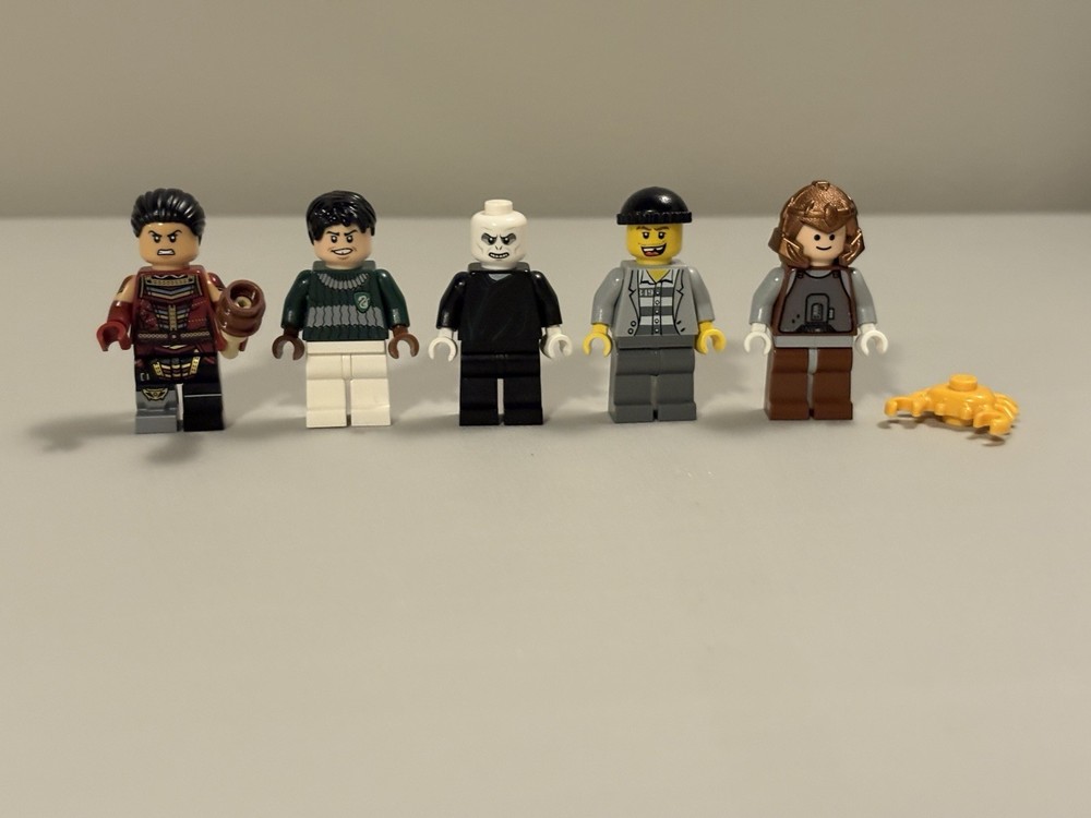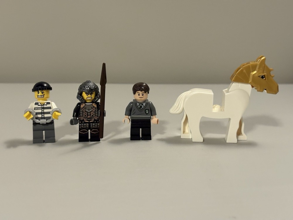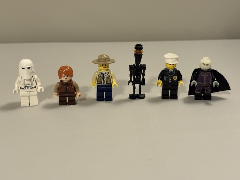 24 mifigure lot with all pieces and accessories intact, no damage. Horse with Gold armor and a yellow crab included. Detailed list: 1 Star Wars droid, 1 Hoth soldier, 1 bounty hunter 1 Lone Ranger cowboy 3 City robbers, 3 city police officers, 1 forest ranger, 1 fire fighter 1 pilot 2 LEGO Castle figures 1 mechanic 1 foot clan soldier 1 Marvel Echo figure 1 LOTR Sam figure 1 Lego Classic boy figure 1 Voldemort, quidditch Harry, 2 students, old Snape figure