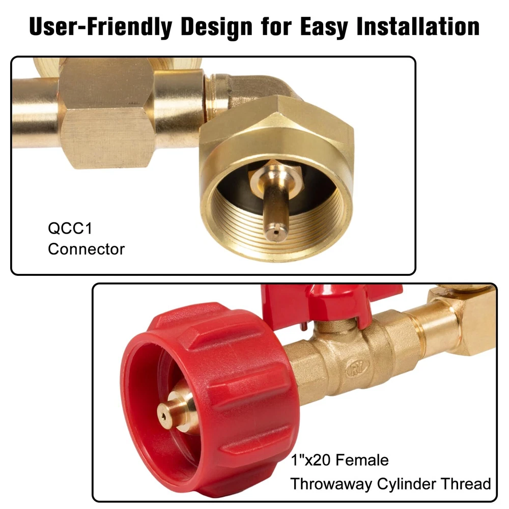 Upgraded 90-Degrees Elbow Design: This 90 degrees elbow propane refill adapter upgraded with new connectivity methods to make it easier and no tools required, and it with hand-wheel grip for tightening, you can easily connect your large cylinder to 1LB propane tank ON-Off Control Valve and Gauge: This propane refill adapter equipped with a propane ON-OFF control valve and gauge, which's can minimizes gas leaks during cylinder connections and precise control over the refilling process, allowing for safe and controlled refilling Secure and Reliable: The corrosion-resistant solid brass material provides better sealing and durability, while the valve, pressure gauges and built-in overflow protection device integrated safety features effectively mitigate the risk of overfilling gas cylinders Easy to Use: Easily refills your 1 pound bottles multiple times without tools, helping you save on the cost of buying new green propane gas cylinders, the pressure gauge can quickly check the remaining gas of large tank to avoid the inconvenience caused by insufficient gas during the filling process Additional 1 LB Propane Bottle Cap: The 1 LB propane bottle cap is useful for your camping stoves, home applications, barbecue, propane heater or others equipments that use 1 lb propane tank. You don't need to spend extra money to buy the cap. Use and Attention: Connect the QCC1/Type1 coupler to the large propane tank cylinders and place the other end of the rotary control nut is connected to the 1LB propane tank. Turn the large propane tank upside down in the safe corner so the liquid can flow out. Stay away flames and sparks for safety. Compatibility & Packaging: This adapter fits for 5-40LB propane tank refill 1LB bottle, suitable for heater, camping stove, portable and tabletop grill etc. The kit includes: 1* Elbow QCC1 Propane Refill Adapter with Valve and Gauge, 2* 1 LB Propane Bottle Cap, 1* Roll Sealing Tape.