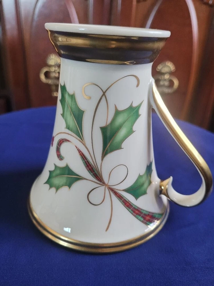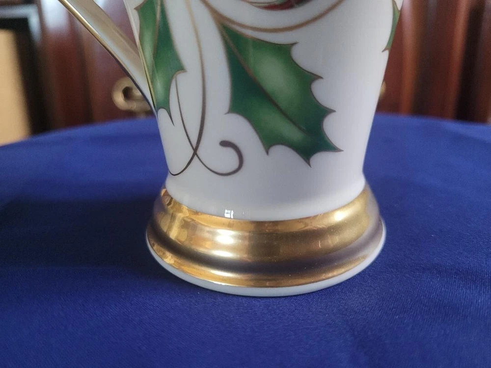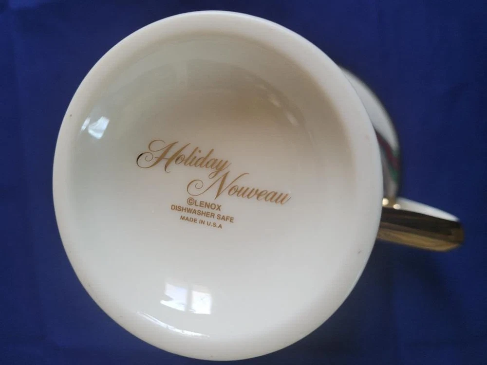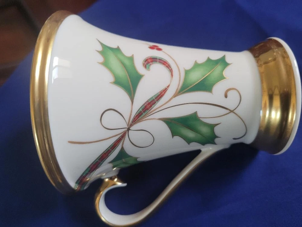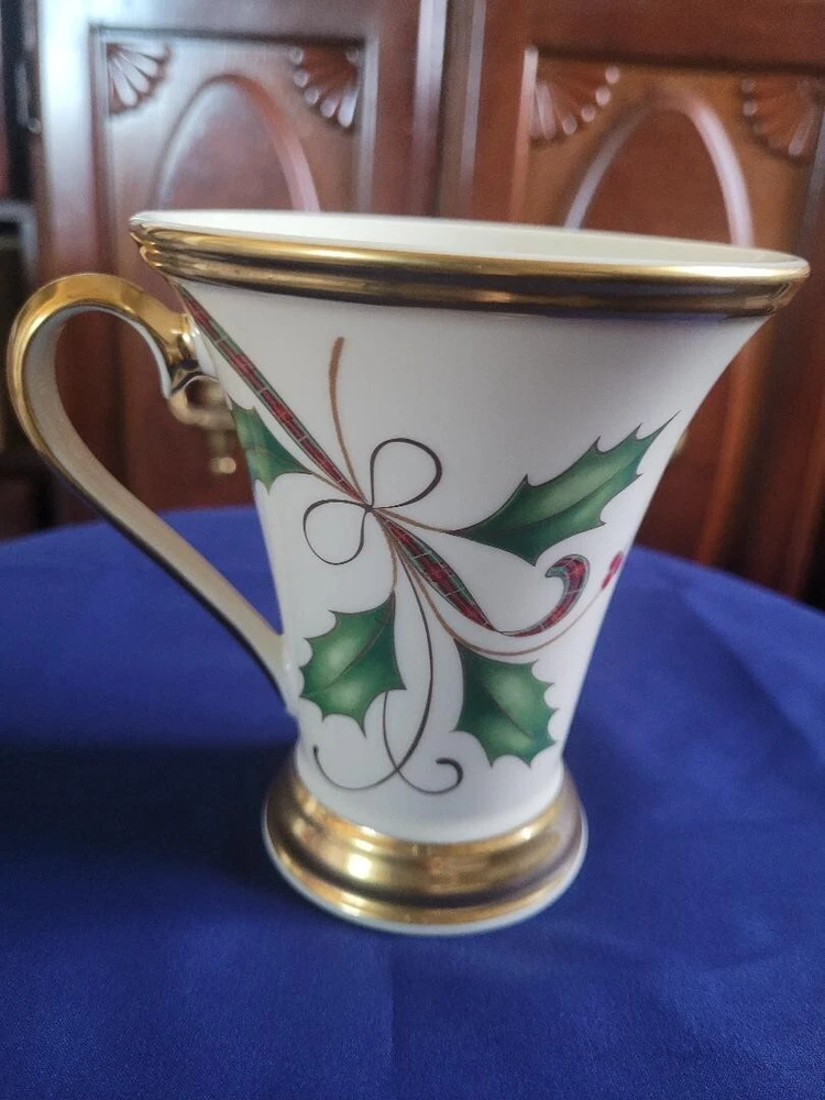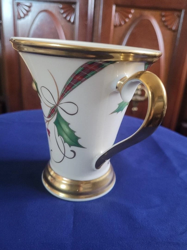The Lenox Holiday Nouveau Platinum Christmas Accent Mug features a festive Holly pattern with a Holly Berry Ribbon design, making it perfect for the holiday season. This small ceramic mug has a capacity of 8 oz and is suitable for both hot and cold beverages. The elegant design is part of the Holiday Nouveau Platinum collection by Lenox, a well-known brand, and is made in the United States. Perfect for adding a touch of Christmas cheer to your table setting or as a collectible item for the holiday season.