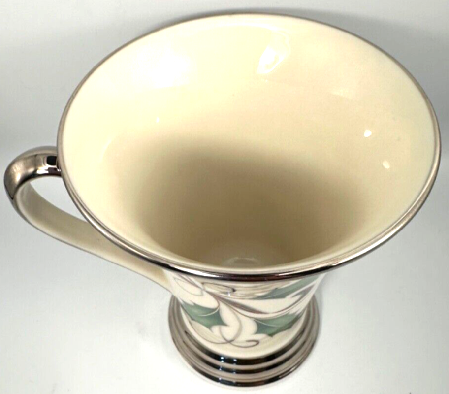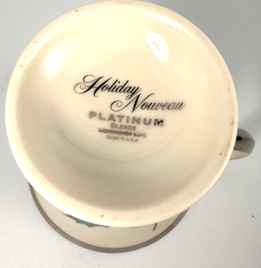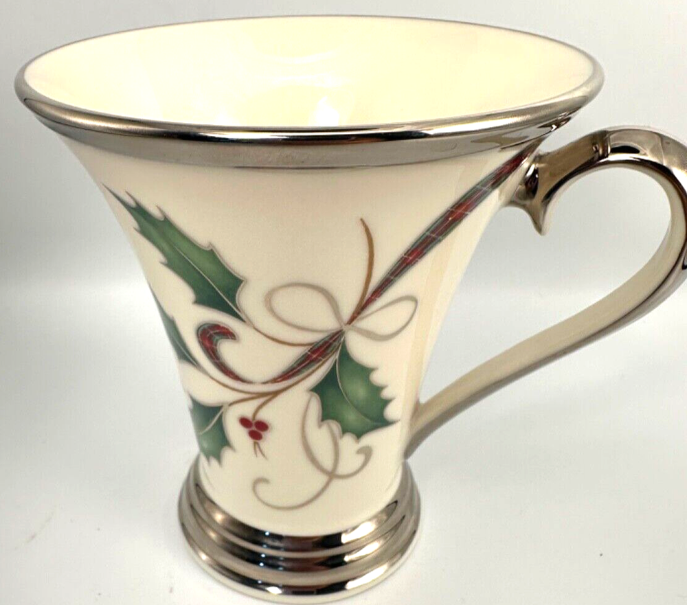 LENOX Holiday Nouveau Platinum Christmas Accent Mug HOLLY Berry Ribbon. Cream porcelain mug, convex curve silhouette, Slender holly leaves and berries, plaid ribbon, platinum edging around lip, base & handle. NO box. See photos for detail. Nice glazing and color. Combined shipping available. Shipped via USPS Please ask questions regarding this item PRIOR to bidding. Photos are considered to be part of the description, so please view carefully. ALL SALES FINAL. Email me your question and I am happy to respond and provide additional photos if requested. See my other items at my store Vintage by Oona (Deb's Vintage Kitchen): https://www.ebay.com/str/debsvintagekitchen